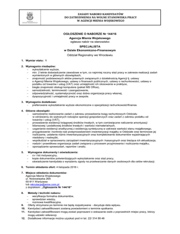 ZASADY NABORU KANDYDATÓW DO ZATRUDNIENIA NA WOLNE STANOWISKA PRACY W AGENCJI MIENIA WOJSKOWEGO OGŁOSZENIE O NABORZE Nr 144/16 Agencja Mienia Wojskowego ogłasza nabór na stanowisko SPECJALISTA w Dziale Ekonomiczno-Finansowym Oddział Regionalny we Wrocławiu 1. Wymiar etatu: 1 2. Wymagania niezbędne: wykształcenie wyższe, min. 2 letnie doświadczenie zawodowe w tym, co najmniej roczny staż pracy w zakresie realizacji zadań wymienionych w głównych obowiązkach, znajomość podstawowych aktów prawnych związanych z działalnością Agencji tj. ustawy o Agencji Mienia Wojskowego, ustawy o finansach publicznych, ustawy o rachunkowości, ustawy o podatku od towarów i usług (VAT) oraz umiejętność ich stosowania w praktyce, biegła znajomość obsługi komputera (pakiet MS Office), samodzielność, terminowość i zaangażowanie, odpowiedzialność, systematyczność oraz dobra organizacja pracy własnej, dyspozycyjność i umiejętność pracy w zespole. 3. Wymagania dodatkowe: preferowane wykształcenie wyższe ekonomiczne o specjalizacji rachunkowość/finanse. 4. Główne obowiązki: samodzielne realizowanie zadań z zakresu prowadzenia ksiąg rachunkowych Oddziału w odniesieniu do wybranych rodzajów operacji gospodarczych oraz zadań z zakresu podatku od towarów i usług (VAT), prowadzenie ewidencji księgowej środków trwałych, w tym comiesięczne naliczenie amortyzacji bilansowej i podatkowej środków trwałych i wartości niematerialnych, uzganianie ewidencji analitycznej z ewidencją syntetyczną w zakresie wartości stanu majątkowego, przygotowanie i kontrola nad przeprowadzeniem inwentaryzacji majątku w Oddziale oraz terminowe jej rozliczanie, ustalenie różnic inwentaryzacyjnych oraz kompletowanie dokumentów wyjaśniających niedobory i nadwyżki, współudział w opracowaniu zarządzeń inwentaryzacyjnych i kasacyjnych oraz bieżąca ich aktualizacja, nadzór i prawidłowa organizacja zadań związana z procesem przyjmowania i rozliczania majątku, sporządzanie sprawozdań, raportów i analiz. 5. Wymagane dokumenty i oświadczenia: cv i list motywacyjny, kopie dokumentów potwierdzających wykształcenie oraz staż pracy, oświadczenie kandydata o wyrażeniu zgody na przetwarzanie danych osobowych dla celów rekrutacji. 6. Termin składania ofert: 4 listopada 2016 r. 7. Miejsce składania dokumentów: Agencja Mienia Wojskowego ul. Nowowiejska 26A 00-911 Warszawa lub [email protected] z dopiskiem: „Ogłoszenie Nr 144/16” 8. Metody i techniki naboru: weryfikacja formalna dokumentów, sprawdzian wiedzy, rozmowa kwalifikacyjna. 9. Oferty otrzymane po terminie nie będą rozpatrywane - decyduje data wpływu. 10. Kandydaci zakwalifikowani zostaną powiadomieni o terminie spotkania. 11. Kandydaci zakwalifikowani mogą zostać poproszeni o wskazanie osób z poprzednich miejsc pracy, którzy mogą udzielić referencji. 12. Dodatkowe informacje można uzyskać pod nr tel. 22/ 314 99 46