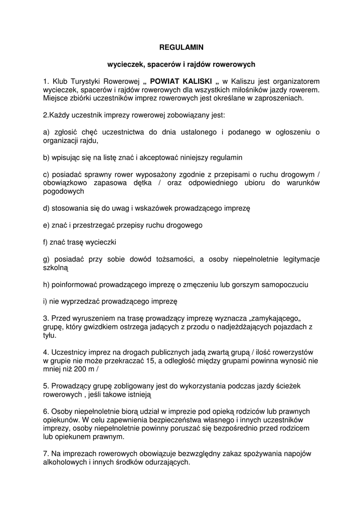 REGULAMIN wycieczek, spacerów i rajdów rowerowych 1. Klub Turystyki Rowerowej „ POWIAT KALISKI „ w Kaliszu jest organizatorem wycieczek, spacerów i rajdów rowerowych dla wszystkich miłośników jazdy rowerem. Miejsce zbiórki uczestników imprez rowerowych jest określane w zaproszeniach. 2.Każdy uczestnik imprezy rowerowej zobowiązany jest: a) zgłosić chęć uczestnictwa do dnia ustalonego i podanego w ogłoszeniu o organizacji rajdu, b) wpisując się na listę znać i akceptować niniejszy regulamin c) posiadać sprawny rower wyposażony zgodnie z przepisami o ruchu drogowym / obowiązkowo zapasowa dętka / oraz odpowiedniego ubioru do warunków pogodowych d) stosowania się do uwag i wskazówek prowadzącego imprezę e) znać i przestrzegać przepisy ruchu drogowego f) znać trasę wycieczki g) posiadać przy sobie dowód tożsamości, a osoby niepełnoletnie legitymacje szkolną h) poinformować prowadzącego imprezę o zmęczeniu lub gorszym samopoczuciu i) nie wyprzedzać prowadzącego imprezę 3. Przed wyruszeniem na trasę prowadzący imprezę wyznacza „zamykającego„ grupę, który gwizdkiem ostrzega jadących z przodu o nadjeżdżających pojazdach z tyłu. 4. Uczestnicy imprez na drogach publicznych jadą zwartą grupą / ilość rowerzystów w grupie nie może przekraczać 15, a odległość między grupami powinna wynosić nie mniej niż 200 m / 5. Prowadzący grupę zobligowany jest do wykorzystania podczas jazdy ścieżek rowerowych , jeśli takowe istnieją 6. Osoby niepełnoletnie biorą udział w imprezie pod opieką rodziców lub prawnych opiekunów. W celu zapewnienia bezpieczeństwa własnego i innych uczestników imprezy, osoby niepełnoletnie powinny poruszać się bezpośrednio przed rodzicem lub opiekunem prawnym. 7. Na imprezach rowerowych obowiązuje bezwzględny zakaz spożywania napojów alkoholowych i innych środków odurzających. 8. Osoby zamierzające skrócić trasę wycieczki / odłączyć się / winny powiadomić o tym prowadzącego. 9.Uczestnicy nie przestrzegający poleceń prowadzącego oraz regulaminu mogą zostać wykluczeni z imprezy . 10. Organizator nie ponosi odpowiedzialności za skutki nieprzestrzegania regulaminu imprez rowerowych przez uczestników. Uczestnicy biorą udział w imprezach na własną odpowiedzialność i ubezpieczają się we własnym zakresie. 11.W przypadku niesprzyjających warunków pogodowych / silny wiatr, opady deszczu, śnieg lub duży mróz /impreza może być odwołana. Osoby zainteresowane powinny skontaktować się z prowadzącym imprezę na godzinę przed i sprawdzić czy ona się odbędzie. 12. Uczestnik imprezy rowerowej wyraża zgodę na przetwarzanie swojego wizerunku do celów związanych z działalnością statutową Klubu. Wyrażenie zgody jest jednoznaczne z tym, że fotografie, filmy lub nagrania wykonane podczas imprez organizowanych przez Klub mogą być zamieszczone na stronie internetowej Klubu oraz wykorzystane w materiałach promocyjnych. 13. Zaleca się podczas imprez rowerowych stosowania kamizelki odblaskowej i kasku. Zarząd Klubu
