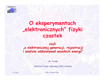 O eksperymentach „elektronicznych” fizyki czastek czyli czy „o elektronicznej generacji, rejestracji i analizie oddziaływań wysokich energii” M. Turała Instytut Fizyki Jądrowej PAN, Kraków M. Turała CERN, 1 Kwiecień 2008 1 Zarys wystąpienia ● Oddziaływania cząstek - Odkrycia naukowe i rozwój techniki - Czy nie wystarczy nam sama teoria? - Aby uwierzyć trzeba „zobaczyć” ● Eksperymenty elektroniczne - Motywacja - Akceleratory i detektory - Pierwsze eksperymenty p y y „on-line”... „ ● Duże eksperymenty (w CERN) - ATLAS ● Komputery dla fizyki - Grid komputerowy ● Podsumowanie M. Turała CERN, 1 Kwiecień 2008 2 Zarys wystąpienia ● Oddziaływania cząstek - Odkrycia naukowe i rozwój techniki - Czy C nie i wystarczy t nam sama tteoria? i ? - Aby uwierzyć trzeba „zobaczyć” ● Eksperymenty p y y elektroniczne - Motywacja - Akceleratory i detektory - Pierwsze eksperymenty „on line”... ● Duże eksperymenty (w CERN) - ATLAS ● Komputery K t dl fi dla fizyki ki - Grid komputerowy ● Podsumowanie odsumowan e M. Turała CERN, 1 Kwiecień 2008 3 Komory iskrowe Układy scalone Komory pęcherzyk. Tranzystor po 1964 Æ Komputer PC C Paskowe detektory Si Komory prop p. i dryfowe Eksperyment elektronicznyy Emulsje e Komputter Licznik ki. Proporc. Promie en. Czeren nk. Lampyy elektro on. Licznik Geigera Liczniki scyntylac c . Komora Wilsona Krótka historia fizyki cząstek i detektorów (z technologią w tle) Å do 1964 Aby uwierzyć trzeba ”zobaczyć”… Obserwując ślady cząstek promieniowania kosmicznego zarejestrowane przez komorę mgłową Carl Anderson odkrył w r. 1932 antymaterię w postaci antyelektronu, nazwanego później pozytonem. Komora Wilsona (mgłowa) M. Turała CERN, 1 Kwiecień 2008 5 Aby uwierzyć trzeba ”zobaczyć”… 6 Aby uwierzyć trzeba ”zobaczyć”… Oddziaływania w komorze pęcherzykowej M. Turała CERN, 1 Kwiecień 2008 7 7 Aby uwierzyć trzeba ”zobaczyć”… Oddziaływanie ciężkich jonów zarejestrowane w komorze streamerowej M. Turała CERN, 1 Kwiecień 2008 8 Aby uwierzyć trzeba ”zobaczyć”… Oddziaływanie Odd i ł i pp „widziane” id i ” przez d detektor k centralny ATLASa M. Turała CERN, 1 Kwiecień 2008 9 Zarys wystąpienia ● Oddziaływania cząstek - Odkrycia naukowe i rozwój techniki - Czy C nie i wystarczy t nam sama tteoria? i ? - Aby uwierzyć trzeba „zobaczyć” ● Eksperymenty p y y elektroniczne - Motywacja - Akceleratory i detektory - Pierwsze eksperymenty „on line”... ● Duże eksperymenty (w CERN) - ATLAS ● Komputery K t dl fi dla fizyki ki - Grid komputerowy ● Podsumowanie odsumowan e M. Turała CERN, 1 Kwiecień 2008 10 Dlaczego energia jest ważna? ¾ Im wyższa energia, tym krótsza długość fali high low energy ¾ Wyższa energia pozwala na zobaczenie szczegółów Ant’s eye in electron microscope z wykładu P. Oddone 11 Dlaczego energia jest ważna? ¾ Duża energia oznacza również dużą masę; a więc możemy wrócić do początków Wszechświata! E= 2 mc z wykładu P. Oddone 12 Historia Wszechświata z wykładu P. Oddone 13 Dlaczego energia jest ważna? ¾ Prawdopodobieństwo zajścia nowych „ciekawych nowych, ciekawych” zjawisk rośnie z energią ¾ Interesujące ją nas przypadki p yp zdarzają się b. rzadko: prawdopodobieństwo ich pojawienia się jest na poziomie 11 wszystkich 10-44 – 10-11 tki h oddziaływań (to tylko jeden ciekawy przypadek na 10 miliardów „trywialnych” „ y y zdarzeń!!) -> „poszukiwanie igły na ogromnym polu siana… siana ” 14 Promieniowanie kosmiczne źródłem cząstek wysokich y energii g Promieniowanie kosmiczne i LHC 1 przypadek d k ha-2 rok-1 przy p y LHC 109 przypadków/s ! 1 przypadek km-2 rok-1 Atlas 15 W kierunku wysokich energii Pierwszy cyklotron 80 keV k V (1929, (1929 E. Lawrence) Baterie - 1.5 eV Kineskop – 15 keV M. Turała Tevatron w Fermilab – 2 TeV CERN, 1 Kwiecień 2008 16 W kierunku wysokich energii W przypadku zderzeń dwóch identycznych wiązek energia w „środku masy” jest sumą ich energii, podczas gdy przy bombardowaniu nieruchomej „tarczy tarczy” (cząstki) tylko jej część może zostać wykorzystana do tworzenia nowych cząstek (zjawisk) M. Turała CERN, 1 Kwiecień 2008 17 Rozwój akceleratorów w świecie 18 Akcelerator LHC w CERN CERN Large Hadron Collider European Organisation for Nuclear Reseach LHCb Atlas CMS Alice M. Turała CERN, 1 Kwiecień 2008 19 Dlaczego LHC w CERN Udany program pp-bar na akceleratorze SPS w CERN w latach 80-tych ● d doświadczenie ś i d i w skomplikowanej k lik j analizie li i przypadków proton-antyproton i odkrycie bozonów W, Z Co można zmierzyć przy zderzeniach protonów wysokich energii ● pomysły dla LHC (w tunelu LEP!) i SSC Aktywny program przygotowawczy R&D ● detektory i akcelerator O Organizowanie i i się i zespołów łó dla dl współpracy ół ● ATLAS, CMS, … ALICE, … LHCb, … TOTEM… Zatwierdzenie programu LHC (1994) Michal Turala CERN, 1 Kwiecień 2008 20 Detektory elektroniczne cząstek aby „zobaczyć zobaczyć” to co niewidzialne… niewidzialne ¾ Detektory torów ((dla p pomiar m wierzchołków w w oddziaływań, yw , pędów pę w i topologii) p g ) ¾ hodoskopy scyntylacyjne ¾ komory iskrowe z odczytem cyfrowym ¾ paskowe i mozaikowe detektory krzemowe ¾ komory proporcjonalne i dryfowe ¾ komory projekcji czasowej ¾ Detektory dla identyfikacji cząstek ( k śl i iich (określenia h masy)) ¾ liczniki do pomiaru czasu przelotu ¾ liczniki Czerenkowa ¾ promieniowania przejścia ¾ Kalorymetry (dla pomiaru energii cząstek) ¾ elektromagnetyczne (e (e, γ) ¾ hadronowe (π, K, p) Detektory (poza kalorymetrami) winny być jak najlżejsze, najlżejsze aby nie zmieniać oryginalnych parametrów ó cząstek biorących udział w pierwotnym oddziaływaniu M. Turała CERN, 1 Kwiecień 2008 21 Detektory wierzchołek pierwotny wierzchołki wtórne wierzchołek pierwotny Graficzne odwzorowa