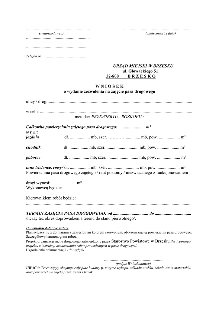 .......................................................... (Wnioskodawca) ...................................................................... ............................................................... (miejscowość i data) ..................................................................... Telefon Nr .................................................. URZĄD MIEJSKI W BRZESKU ul. Głowackiego 51 32-800 BRZESKO WNIOSEK o wydanie zezwolenia na zajęcie pasa drogowego ulicy / drogi:.................................................................................................................................. w celu: .......................................................................................................................................... metodą:/ PRZEWIERTU, ROZKOPU / Całkowita powierzchnia zajętego pasa drogowego: ........................ m² w tym: jezdnia dł. .................. mb, szer. …………............. mb, pow. ................... m² chodnik dł. ................. mb, szer. ............................. mb, pow. .................... m² pobocze dł. .................. mb, szer. ............................ mb, pow. ..................... m² inne /zieleńce, rowy/ dł. .................. mb, szer. ............................ mb, pow. .................... m² Powierzchnia pasa drogowego zajętego / rzut poziomy / niezwiązanego z funkcjonowaniem drogi wynosi: ...................... m² Wykonawcą będzie: .................................................................................................................................................... Kierownikiem robót będzie: ..................................................................................................................................................... TERMIN ZAJĘCIA PASA DROGOWEGO: od ................................ do ................................. /licząc też okres doprowadzenia terenu do stanu pierwotnego/. Do wniosku dołączyć należy: Plan sytuacyjny z domiarami z zakreślonym kolorem czerwonym, obrysem zajętej powierzchni pasa drogowego. Szczegółowy harmonogram robót. Projekt organizacji ruchu drogowego zatwierdzony przez Starostwo Powiatowe w Brzesku /Nr typowego projektu z instrukcji oznakowania robót prowadzonych w pasie drogowym/. Uzgodnienia dokumentacji - do wglądu. ................................................................ (podpis Wnioskodawcy) UWAGA: Teren zajęty obejmuje cały plac budowy tj. miejsce wykopu, odkładu urobku, składowania materiałów oraz powierzchnię zajętą przez sprzęt i barak.