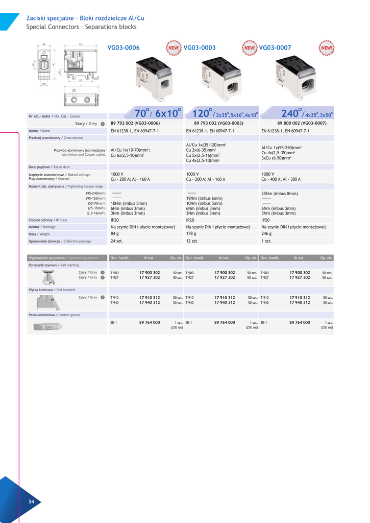 Zaciski specjalne · Bloki rozdzielcze Al/Cu Special Connectors · Separations blocks VG03-0006 NEW! 70 / 6x10 Nr kat.- kolor / No. Cat.- Colour Szary / Grey VG03-0003 NEW! VG03-0007 120 /2x35 ,5x16 ,4x10 89 792 002 (VG03-0006) NEW! 240 /4x35 ,3x50 89 793 002 (VG03-0003) 89 800 002 (VG03-0007) EN 61238-1, EN 60947-7-1 EN 61238-1, EN 60947-7-1 EN 61238-1, EN 60947-7-1 Al/Cu 1x(10-70)mm2; Cu 6x(2,5-10)mm2 Al/Cu 1x(35-120)mm2 Cu 2x(6-35)mm2 Cu 5x(2,5-16)mm2 Cu 4x(2,5-10)mm2 Al/Cu 1x(95-240)mm2 Cu 4x(2,5-35)mm2 3xCu (6-50)mm2 1000 V Cu - 200 A; Al - 160 A 1000 V Cu - 200 A; Al - 160 A 1000 V Cu - 400 A; Al - 380 A 10Nm (imbus 5mm) 6Nm (imbus 3mm) 3Nm (imbus 3mm) 19Nm (imbus 6mm) 10Nm (imbus 5mm) 6Nm (imbus 3mm) 3Nm (imbus 3mm) Stopień ochrony / IP Class IP20 IP20 Montaż / Montage Na szynie DIN i płycie montażowej Na szynie DIN i płycie montażowej Na szynie DIN i płycie montażowej Masa / Weight 84 g 178 g 246 g Opakowanie zbiorcze / Collective package 24 szt. 12 szt. 1 szt. Wyposażenie opcjonalne / Optional equipment Ozn. handl. Norma / Norm Przekrój znamionowy / Cross section Przewód aluminiowy lub miedziany Aluminium and Cooper cables Dane prądowe / Rated date Napięcie znamionowe / Rated voltage Prąd znamionowy / Current Moment obr. dokręcania / Tightening torque range (95-240mm2) (95-120mm2) (50-70mm2) (25-35mm2) (2,5-16mm2) Nr kat. Op. zb. Ozn. handl. 25Nm (imbus 8mm) 6Nm (imbus 3mm) 3Nm (imbus 3mm) IP20 Nr kat. Op. zb. Ozn. handl. Nr kat. Op. zb. Oznacznik szynowy / Rail marking Szary / Grey Szary / Grey T 900 T 927 17 900 302 17 927 302 50 szt. T 900 50 szt. T 927 17 900 302 17 927 302 50 szt. 50 szt. T 900 T 927 17 900 302 17 927 302 50 szt. 50 szt. Szary / Grey T 910 T 940 17 910 312 17 940 312 50 szt. T 910 50 szt. T 940 17 910 312 17 940 312 50 szt. T 910 50 szt. T 940 17 910 312 17 940 312 50 szt. 50 szt. SR-1 89 764 000 89 764 000 1 szt. (250 ml) Płytka krańcowa / End bracked Pasta kontaktowa / Contact grease 34 1 szt. SR-1 (250 ml) 89 764 000 1 szt. SR-1 (250 ml) Zaciski specjalne · Nowe bloki rozdzielcze Al/Cu Special Connectors · Separations blocks 1.4 Pojedyncze, jednobiegunowe bloki rozdzielcze do rozgałęzienia połączenia. Przewody mocowane pewnie śrubami imbusowymi. Złączka wyposażona w zacisk pokryty galwanicznie specjalnym stopem oraz w miejscu dokręcenia pastą kontaktową, dla zapewnienia właściwego połączenia. VG03-0006 Widok złączki od strony rozgałęzień. Widok złączki od strony rozgałęzień z otwartą klapką udostepniającą zacisk. Widok zacisku wejściowego. Widok zacisku wyjściowego. Widok złączki od strony rozgałęzień. Widok złączki od strony rozgałęzień z otwartą klapką udostepniającą zacisk. Widok zacisku wejściowego. Widok zacisku wyjściowego. VG03-0003 VG03-0007 35