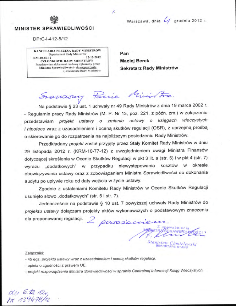 /. Warszawa , dnia lj grudnia 2012 r. MINISTE R SPRAWIEDLIWOŚCI DPrC-1-4 12-5/12 KANCELARIA PREZESA RADY MINISTRÓW Departament Rady Ministrów 12-12-2012 RM-10-66-12 CZŁONKOWIE RADY MINISTRÓW Przedstawi am dokument rzą d o wy zgł oszo n y przez Ministra S p rawiedliwo ści- do rowatrzenia (-) Sekretarz Rady Ministrów Pan Maciej Berek Sekretarz Rady Ministrów ~~~~. Na podstawie § 23 ust. 1 uchwały nr 49 Rady Ministrów z dnia 19 marca 2002 r. - Regulamin pracy Rady Ministrów (M . P. Nr 13, poz. 221, z późn . zm.) w załączeniu przedstawiam projekt ustawy o zmianie ustawy o księgach wieczystych i hipotece wraz z uzasadnieniem i oceną skutków regulacji (OSR), z uprzejmą prośbą o skierowanie go do rozpatrzenia na najbliższym posiedzeniu Rady Ministrów. Przedkładany projekt został przyjęty 29 listopada 2012 r. (KRM-10-77-12) z przez Stały Komitet Rady Ministrów w dniu uwzględnieniem uwagi Ministra Finansów w Ocenie Skutków Regulacji w pkt 3 lit. a (str. 5) i w pkt 4 (str. 7) "dodatkowych" w przypadku niewystępowania kosztów w okresie dotyczącej skreślenia wyrazu obowiązywania audytu po ustawy oraz z upływie zobowiązaniem roku od daty wejścia w życie Ministra Sprawiedliwości do dokonania ustawy. Zgodnie z ustaleniami Komitetu Rady Ministrów w Ocenie Skutków Regulacji usunięto słowo "dodatkowych" (str. 5 i str. 7). Jednocześnie projektu ustawy na podstawie § 1O ust. 7 dołączam powyższej uchwały Rady Ministrów do projekty aktów wykonawczych o podstawowym znaczeniu 2 dla proponowanej regulacji. Załączniki : - 45 egz. projektu ustawy wraz z uzasadnieniem i oceną skutków regulacji, -opin ia o zgodności z prawem UE, -projekt rozporządzenia Ministra a'~! 6. 1:3. 4'h hr t1311;?8h Sprawiedliwości w sprawie Centralnej Informacji Ksiąg Wieczystych , - projekt rozporządzenia Ministra Sprawiedliwości w sprawie zakładania prowadzenia ksiąg wieczystych w systemie informatycznym, - projekt rozporządzenia Ministra Sprawiedliwości w sprawie wysokości opłat odpisów ksiąg wiecznych, wyciągów z ksiąg wieczystych i zaświadczenia wydawanych przez Centralną Informację Ksiąg wieczystych w centralnej bazie danych ksiąg od wniosków o wydanie o zamknięciu księgi wieczystej Wiecznych oraz od wniosku o wyszukanie ksiąg wieczystych. 2 Projekt z dnia 8 listopada 2012 r. USTAWA z dnia .............. 2012 r. o zmianie ustawy o księgach wieczystych i hipotece Art. l. W ustawie z dnia 6 lipca 1982 r. o 2001 r. Nr 124, poz. 1361, z późn. zm. I)) księgach wieczystych i hipotece (Dz. U. z wprowadza się następujące zmiany: l) art. 25 1 otrzymuje brzmienie: "Art. 25 1• l. Księgi wieczyste są zakładane prowadzone w systemie 1 informatycznym. Sprawiedliwości określi, 2. Minister oraz prowadzenia strukturę księgi ksiąg w drodze rozporządzenia, sposób wieczystych w systemie informatycznym, wieczystej określoną wart. zakładania uwzględniając 25."; 2) art. 364 i 36 5 otrzymują brzmienie: "Art. 364 . l. Informacji z centralnej bazy danych ksiąg wieczystych udziela Centralna Informacja Ksiąg Wieczystych, zwana dalej "Centralną Informacją", z ekspozyturami przy wydziałach sądów rejonowych prowadzących księgi wieczyste. 2. Centralna Informacja wydaje na wniosek odpisy z ksiąg wieczystych oraz zaświadczenia o ksiąg zamknięciu księgi wieczystych, wyciągi wieczystej, prowadzonych w systemie informatycznym. 3. Odpisy, wyciągi i zaświadczenia, Centralną Informację, mająmoc 4. W przypadku złożenia o których mowa w ust. 2, wydawane przez dokumentów wydawanych przez sąd. wniosku za pośrednictwem systemu teleinformatycznego o wydanie dokumentów, o których mowa w ust. 2, Centralna Informacja umożliwia pośrednictwem systemu samodzielne wydrukowanie tych dokumentów, teleinformatycznego. Wydruki tych dokumentów przez sąd, jeżeli posiadają cechy umożliwiające za mają ich moc dokumentów wydawanych weryfikację z danymi zawartymi w centralnej bazie danych ksiąg wieczystych. 5. Wydruki posiadają mocy I) treści wyświetlonych w trybie przeglądania księgi wieczystej me dokumentów wydawanych przez sąd. Zmiany tekstu jednolitego wymienionej ustawy zostały ogłoszone w Dz. U. z 2001 r. Nr 125, poz. 1368, z 2002 r. Nr 169, poz. 1387, z 2003 r. Nr 42, poz. 363, z 2004 r. Nr 172, poz. 1804, z 2008 r. Nr 116, poz. 731, z 2009 r. Nr 131, poz. 1075 oraz z 2011 r. Nr 230, poz. 1370, z 2012 r. poz. 827. -2- 6. Centralna Informacja teleinformatycznego, przeglądanie umożliwia, ksiąg za pośrednictwem systemu wieczystych prowadzonych w systemie informatycznym. 7. Każdy, kto zna numer księgi wieczystej prowadzonej może bezpłatnie przeglądać księgę wieczystą informatycznym, za w systemie pośrednictwem systemu teleinformatycznego. 8. Jeżeli jest to niezbędne do realizacji zadań ustawowych, o zgodę do Ministra Sprawiedliwości na wielokrotne, nieograniczone w czasie wyszukiwanie ksiąg wieczystych w centralnej bazie danych ksiąg wieczystych mogą wystąpić: l) sądy, 2) prokuratura, 3) organy kontroli skarbowej, 4) organy celne, 5) administracyjne organy egzekucyjne, 6) organy podatkowe, 7) komornicy sądowi, 8) Policja, 9) Najwyższa l O) Straż Izba Kontroli, Graniczna, 11) Agencja Bezpieczeństwa Wewnętrznego, 12) Agencja Wywiadu, 13) Centralne Biuro Antykorupcyjne, 14) Służba Kontrwywiadu Wojskowego, 15) Służba Wywiadu Wojskowego, 16) Zakład Ubezpieczeń Społecznych, 17) centralne organy administracji rządowej. 9. O zgodę, występowania o której mowa w ust. 8, może wystąpić także podmiot uprawniony do w imieniu grupy podmiotów, o których mowa w ust. 8 pkt 1-8, pkt l O, pkt 17. l O. Odmowa zgody na wielokrotne, nieograniczone w czasie wyszukiwanie ksiąg wieczystych następuje w drodze decyzji administracyjnej, jeżeli: l) podmiot występujący z wnioskiem nie jest podmiotem wymienionym w ust. 8, -3- 2) zadań nie wykazano, że wyszukiwanie ksiąg wieczystychjest niezbędne do realizacji ust