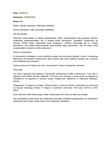 Imię: AURELIA Nazwisko: ĆWIERTNIA Klasa: II b Pasja: chemia, pływanie, siatkówka, plastyka. Cechy charakteru: miła, pracowita, dokładna. Jak się zaczęło: Pływanie rozpoczęłam w szkole podstawowej, kiedy organizowane były wyjazdy szkolne. Siatkówką zainteresowałam się w drugiej klasie gimnazjum, zaczęłam uczęszczać na treningi ''Sokół" Zator. Natomiast moja przygoda z chemią rozpoczęła się w I klasie gimnazjum, mój zapał podtrzymywała nauczycielka tego przedmiotu. Już od klasy I-szej uczęszczałam również na koło plastyczne. Plany na przyszłość: W przyszłości chciałabym coraz bardziej rozwijać się w kierunku biologii i chemii, a edukację zakończyć na studiach medycznych. Mam zamiar cały czas rzetelnie rozwijać się w sporcie oraz hobbistycznie malować. Osoby pomocne w dążeniu do celu: nauczyciele, rodzice, przyjaciele, trenerka. Opis pasji: trzy razy w tygodniu pod opieką p. Górszczyk uczestniczę w kółku chemicznym. Trzy razy w tygodniu mam także treningi siatkówki. W środy mam treningi z panią trener na basenie w Oświęcimiu. W tygodniu w wolnym czasie maluję pod nadzorem p. Katarzyny BrandysGacek. Osiągnięcia: II miejsce w turnieju "Dzień kobiet" w Zatorze (2012); wyróżnienie w konkursie na ręcznie robionego anioła; II miejsce w szkolnym konkursie "Fair play" (2012) w ZSO Zator. Czym jest dla ciebie twoja pasja: dzięki mojej pasji mam chęć by dalej się rozwijać. Czy wyobrażasz sobie życie bez możliwości dalszego rozwijania swojej pasji: nie wyobrażam sobie życia bez hobby i pasji, które mnie relaksują i kształtują.