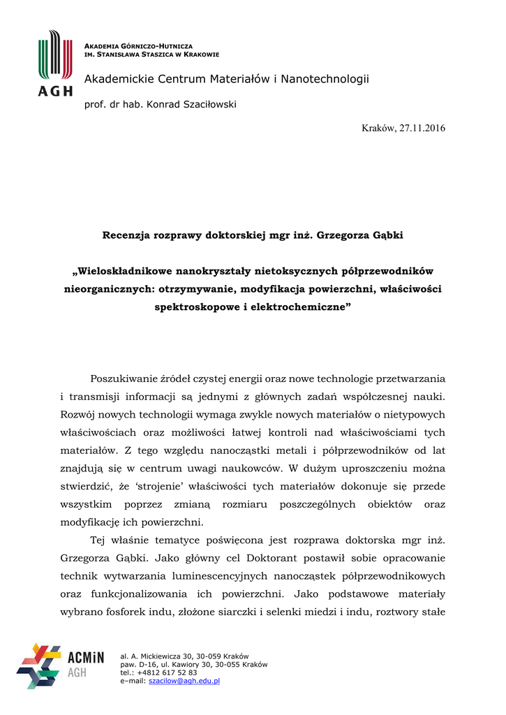 AKADEMIA GÓRNICZO-HUTNICZA IM. STANISŁAWA STASZICA W KRAKOWIE Akademickie Centrum Materiałów i Nanotechnologii prof. dr hab. Konrad Szaciłowski Kraków, 27.11.2016 Recenzja rozprawy doktorskiej mgr inż. Grzegorza Gąbki „Wieloskładnikowe nanokryształy nietoksycznych półprzewodników nieorganicznych: otrzymywanie, modyfikacja powierzchni, właściwości spektroskopowe i elektrochemiczne” Poszukiwanie źródeł czystej energii oraz nowe technologie przetwarzania i transmisji informacji są jednymi z głównych zadań współczesnej nauki. Rozwój nowych technologii wymaga zwykle nowych materiałów o nietypowych właściwościach oraz możliwości łatwej kontroli nad właściwościami tych materiałów. Z tego względu nanocząstki metali i półprzewodników od lat znajdują się w centrum uwagi naukowców. W dużym uproszczeniu można stwierdzić, że ‘strojenie’ właściwości tych materiałów dokonuje się przede wszystkim poprzez zmianą rozmiaru poszczególnych obiektów oraz modyfikację ich powierzchni. Tej właśnie tematyce poświęcona jest rozprawa doktorska mgr inż. Grzegorza Gąbki. Jako główny cel Doktorant postawił sobie opracowanie technik wytwarzania luminescencyjnych nanocząstek półprzewodnikowych oraz funkcjonalizowania ich powierzchni. Jako podstawowe materiały wybrano fosforek indu, złożone siarczki i selenki miedzi i indu, roztwory stałe al. A. Mickiewicza 30, 30-059 Kraków paw. D-16, ul. Kawiory 30, 30-055 Kraków tel.: +4812 617 52 83 e–mail: [email protected] w układach Cu-In-Zn-S oraz Ag-In-Zn-S oraz kesteryt i chalkopiryt. Pomimo takiej różnorodności materiałów i różnic w reaktywności chemicznej Doktorant doskonale poradził sobie z realizacją postawionych zadań. Recenzowana praca ma klasyczny układ. Po krótkim streszczeniu i spisie stosowanych skrótów pracę otwiera obszerna część literaturowa, stanowiąca prawie kompletny materiałów półprzewodnikowych przegląd literatury będących dotyczący przedmiotem syntezy recenzowanej rozprawy. Pierwsza część tego przeglądu jest poświęcona podstawowym właściwościom nanocząstek metalicznych i półprzewodnikowych. Cel pracy, przedstawiony na początki części literaturowej jest zwięźle i jasno zdefiniowany, a analiza literatury przygotowuje grunt do realizacji tego celu. Po analizie literatury następuję obszerna część literaturowa, stanowiąca ponad połowę objętości pracy. Rozpoczyna ją spis używanych materiałów oraz krótki opis podstawowych technik pomiarowych. Po tym kolejno następują rozdziały poświęcone syntezie i właściwościom poszczególnych materiałów półprzewodnikowych. Czytanie pracy znacznie ułatwia wplatanie fragmentów opisów eksperymentów i pomiarów do dyskusji wyników. W większości prac opis wszystkich syntez i pomiarów znajduję się na początku części doświadczalnej – w przypadku tak obszernej pracy podzielenie opisów procedur doświadczalnych pomiędzy kolejne rozdziały jest bardzo przemyślanym zabiegiem. Wielki podziw recenzenta budzi liczba różnych materiałów otrzymanych w pracy oraz głęboko sięgająca analiza strukturalna, spektroskopowa a w szczególności badanie monomolekularnych otoczek ligandów (w tym izolacja tychże ligandów w procesach trawienia nanocząstek). Praca jako całość jest bardzo przejrzyście napisana, wyniki są bogato ilustrowane zarówno surowymi danymi pomiarowymi (widma, dyfraktogramy, zdjęcia mikroskopowe), oraz wykresami i tabelami zbierającymi najważniejsze wyniki. W kilku miejscach wkradły się jednak nieścisłości, a niektóre wyniki zostały zinterpretowane lub przedstawione w nieprawidłowy sposób. Na str. 41 Autor stwierdza, że wpływ ligandów na morfologię nanokryształów jest związany ze zwiększeniem szybkości wzrostu pewnych 2 ścian krystalograficznych pod wpływem adsorpcji ligandów na powierzchni. Wydaje mi się, że należało by raczej rozważyć model przeciwny – zablokowanie wzrostu w pewnych kierunkach na skutek obniżenia energii powierzchniowej (a więc spowolnienia wzrostu) przez ligandy wiązane na powierzchni. Na Rys. 44. (str. 53) brakuje dwóch ważnych sytuacji, w których krawędzie pasm przewodnictwa (typ I½) lub krawędzie pasm walencyjnych (typ II½) mają bardzo zbliżone energie. W takich przypadkach tylko jeden z nośników (dziura w pierwszym lub elektron w drugim przypadku) są uwięzione w rdzeniu nanocząstki. Tego typu heterostruktury zwykle charakteryzują się bardzo wysokim wydajnościami kwantowymi luminescencji, rzędu 80-90%. Na str. 79 Doktorant analizuje metody spektroskopowe szacowania średnicy nanocząstek półprzewodnikowych. Rozważania te dotyczą jedynie intensywności przejścia ekscytonowego (równania 15-17). Istnieją inne, chyba bardziej niezawodne modele, (takie jak np. model Brusa, czy model pasm parabolicznych). Warto by było porównać różne metody spektroskopowe szacowania rozmiarów nanocząstek półprzewodnikowych. Niedopatrzenie to znajduje kontynuację na str. 140, gdzie Autor analizuje korelację średnicy nanokryształów InP wykorzystując empiryczne równanie Reissa, zamiast odwołać się do modeli opartych o uwięzienie kwantowe, zwłaszcza że te modele, pomimo pewnych wad eliminują konieczność bardzo dokładnego określenia stężenia badanych roztworów. Na str. 147 Autor stwierdza, że „(…) woltamperogramy roztworów koloidalnych nanokryształów zazwyczaj nie wykazują żadnych charakterystycznych pików oraz nie pozwalają na wyciągnięcie dodatkowych informacji o ich strukturze”. Zdaniem recenzenta taki wniosek może jest słuszny dla konkretnego przypadku, ale nie może mieć charakteru ogólnego wniosku z badań. Znanych jest wiele przypadków (opisanych np. przez Alberto Crediego czy Nicolaia Gaponika) w których zarówno nieodwracalne jak i odwracalne procesy elektrochemiczne z udziałem nanokryształów półprzewodnikowych dają bardzo s