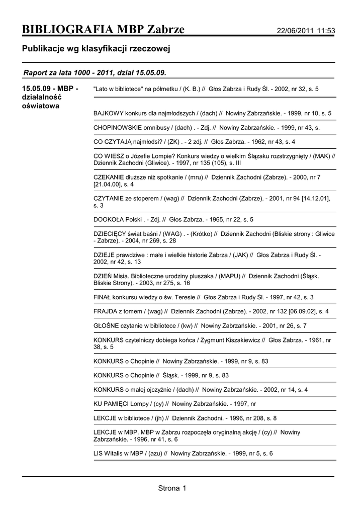 BIBLIOGRAFIA MBP Zabrze 22/06/2011 11:53 Publikacje wg klasyfikacji rzeczowej Raport za lata 1000 - 2011, dział 15.05.09. 15.05.09 - MBP działalność oświatowa "Lato w bibliotece" na półmetku / (K. B.) // Głos Zabrza i Rudy Śl. - 2002, nr 32, s. 5 BAJKOWY konkurs dla najmłodszych / (dach) // Nowiny Zabrzańskie. - 1999, nr 10, s. 5 CHOPINOWSKIE omnibusy / (dach) . - Zdj. // Nowiny Zabrzańskie. - 1999, nr 43, s. CO CZYTAJĄ najmłodsi? / (ZK) . - 2 zdj. // Głos Zabrza. - 1962, nr 43, s. 4 CO WIESZ o Józefie Lompie? Konkurs wiedzy o wielkim Ślązaku rozstrzygnięty / (MAK) // Dziennik Zachodni (Gliwice). - 1997, nr 135 (105), s. III CZEKANIE dłuższe niż spotkanie / (mru) // Dziennik Zachodni (Zabrze). - 2000, nr 7 [21.04.00], s. 4 CZYTANIE ze stoperem / (wag) // Dziennik Zachodni (Zabrze). - 2001, nr 94 [14.12.01], s. 3 DOOKOŁA Polski . - Zdj. // Głos Zabrza. - 1965, nr 22, s. 5 DZIECIĘCY świat baśni / (WAG) . - (Krótko) // Dziennik Zachodni (Bliskie strony : Gliwice - Zabrze). - 2004, nr 269, s. 28 DZIEJE prawdziwe : małe i wielkie historie Zabrza / (JAK) // Głos Zabrza i Rudy Śl. 2002, nr 42, s. 13 DZIEŃ Misia. Biblioteczne urodziny pluszaka / (MAPU) // Dziennik Zachodni (Śląsk. Bliskie Strony). - 2003, nr 275, s. 16 FINAŁ konkursu wiedzy o św. Teresie // Głos Zabrza i Rudy Śl. - 1997, nr 42, s. 3 FRAJDA z tomem / (wag) // Dziennik Zachodni (Zabrze). - 2002, nr 132 [06.09.02], s. 4 GŁOŚNE czytanie w bibliotece / (kw) // Nowiny Zabrzańskie. - 2001, nr 26, s. 7 KONKURS czytelniczy dobiega końca / Zygmunt Kiszakiewicz // Głos Zabrza. - 1961, nr 38, s. 5 KONKURS o Chopinie // Nowiny Zabrzańskie. - 1999, nr 9, s. 83 KONKURS o Chopinie // Śląsk. - 1999, nr 9, s. 83 KONKURS o małej ojczyźnie / (dach) // Nowiny Zabrzańskie. - 2002, nr 14, s. 4 KU PAMIĘCI Lompy / (cy) // Nowiny Zabrzańskie. - 1997, nr LEKCJE w bibliotece / (jh) // Dziennik Zachodni. - 1996, nr 208, s. 8 LEKCJE w MBP. MBP w Zabrzu rozpoczęła oryginalną akcję / (cy) // Nowiny Zabrzańskie. - 1996, nr 41, s. 6 LIS Witalis w MBP / (azu) // Nowiny Zabrzańskie. - 1999, nr 5, s. 6 Strona 1 Publikacje wg klasyfikacji rzeczowej Raport za lata 1000 - 2011, dział 15.05.09. 15.05.09 - MBP działalność oświatowa LIS Witalis w MBP // Głos Zabrza i Rudy Śl. - 1999, nr 5, s. 7 LOMPA widziany inaczej / (E. B.) // Dziennik Zachodni. - 1997, nr 48, s. 10 MŁODE dziennikarstwo / (MP) . - (Krótko) // Dziennik Zachodni (Bliskie strony : Gliwice Zabrze). - 2004, nr 264, s. 32 MŁODZIEŻ pisze . - 2 zdj. // Nasze Zabrze Samorządowe. - 2004, nr 4, s. 12-13 MÓJ zwierzak na fotce : pod patronatem "Głosu" // Głos Zabrza i Rudy Śl. - 1997, nr 44, s. 14 MÓJ zwierzak na fotce / (dach) . - 3 zdj. // Nowiny Zabrzańskie. - 1997, nr , s. NAJPIĘKNIEJSZE wspomnienia : Zabrze to dla autorów wspomnień wyjątkowe miejsce na ziemi / K. Karwat // Dziennik Zachodni (Zabrze). - 2002, nr 136 [04.10.02], s. 3 NIEZWYKŁE historie / Grażyna Herich // Nasze Zabrze Samorządowe. - 2002, nr 7/8. s. 15 O ŚW. Teresie z Lisieux / (par) . - Zdj. // Nowiny Zabrzańskie. - 1997, nr 42, s. 5 OPOWIEŚĆ dziewczyny z Kresów, historia zabrzańskiego jazzu / Adam Olcha // Nowiny Zabrzańskie. - 2002, nr 32, s. 5 OSIEMDZIESIĄT wspomnień o Zabrzu / (dach) // Nowiny Zabrzańskie. - 2002, nr 24, s. 5 PAMIĘCI Lompy / (MPCH) // Dziennik Zachodni (Gliwice). - 1997, nr 42 (41), s. III PARYŻ za Chopina / (u) // Trybuna Śląska "Dzień". - 1999, nr 142, s. 5 PARYŻ za Chopina / Jakub Słoma . - Zdj. // Nasze Zabrze Samorządowe. - 1999, nr 11, s. 15 PASTELOWE grafiki / (dach) // Nowiny Zabrzańskie. - 2003, nr 1, s. 6 PIETRKOWA cząstka // Nowiny Zabrzańskie. - 2002, nr 31, s. 6 PISAŁY i rysowały dzieci. Fragmenty konkursowych prac . - Zdj. // Głos Zabrza i Rudy Śl. - 1997, nr 4, s. 9 POEZJA Wieszcza - zmysły dopieszcza / Dariusz Chrost // Nowiny Zabrzańskie. - 1998, nr 42, s. 6 PRZEDSZKOLAKI i Agora // Głos Zabrza i Rudy Śl. - 2000, nr 22, s. 5 SPRAWDZIAN z Lompy / (cy) // Nowiny Zabrzańskie. - 1997, nr 23, s. 5 SZYKUJĄ bal! / (jh) . - Zdj. // Dziennik Zachodni (Gliwice). - 2002, nr 31, s. 3 ŚLĄSKI Konkurs Wiedzy o Życiu i Twórczości Fryderyka Chopina // Głos Zabrza i Rudy Śl. - 1999, nr 25, s. 14 Strona 2 Publikacje wg klasyfikacji rzeczowej Raport za lata 1000 - 2011, dział 15.05.09. 15.05.09 - MBP działalność oświatowa ŚLĄZAK, Polak... // Głos Zabrza i Rudy Śl. - 1997, nr 24, s. 11 TENIS między książkami : doskonała zabawa i nowe przyjaźnie / Aleksandra Mruk // Dziennik Zachodni (Zabrze). - 2000, nr 22 [04.08.00], s. 5 TRZEJ lektorzy. Dzieci uwielbiają dorosłych czytających im książki / (WAG) . - Zdj. // Dziennik Zachodni (Śląsk. Bliskie Strony). - 2004, nr 54, s. 17 W 200 ROCZNICĘ urodzin poety // Trybuna Śląska. - 1998, nr 192, s. 6 W DIECEZJI i regionie // Gość Niedzielny (Gliwice). - 1997, nr 43, s. 17 WANDA Chotomska u przedszkolaków : jej utwory uczą, bawią, śmieszą / (rog) . - Zdj. // Głos Zabrza i Rudy Śl. - 1996, nr 23, s. 12 WSZYSTKO o Chopinie / MP // Gazeta Wyborcza (Katowice). - 1999, nr , s. WSZYSTKO o plakacie. Spotkanie z artystką ASP / (WAG) // Dziennik Zachodni (Śląsk. Bliskie Strony). - 2004, nr 246, s. 28 WYBRANO najładniejszy Kopernik / (dach) . - Zdj. // Nowiny Zabrzańskie. - 1999, nr 23, s. 16 WYJĄTKOWE miejsce na Ziemi / (dach) // Nowiny Zabrzańskie. - 2002, nr 40, s. 4 WYŚCIGI w czytaniu / (kw) // Nowiny Zabrzańskie. - 2001, nr 15, s. 5 WZRUSZAJĄCO i niezwykle o Zabrzu / (dach) // Nowiny Zabrzańskie. - 2002, nr 26, s. 6 ZA Chopina do Paryża / Dariusz Chrost // Nowiny Zabrzańskie. - 1999, nr 35, s. 7 ZA PŁOTEM byli Niemcy / (mapi) // Nowiny Zabrzańskie. - 2002, nr 35, s. 4 ZABAWA w bibliotece / (cy) // Nowiny Zabrzańskie. - 1997, nr 28, s. 5 ZABAWA z lisem Witalisem / (wag) // Dziennik Zachodni (Zabrze). - 2001, nr 80 [07.09.01], s. 5 ZABRZE - moje miasto . - Zdj. // Dziennik Zachodni. - 2002, nr 42, s. 7 ZABRZE - moje miasto / (kozi