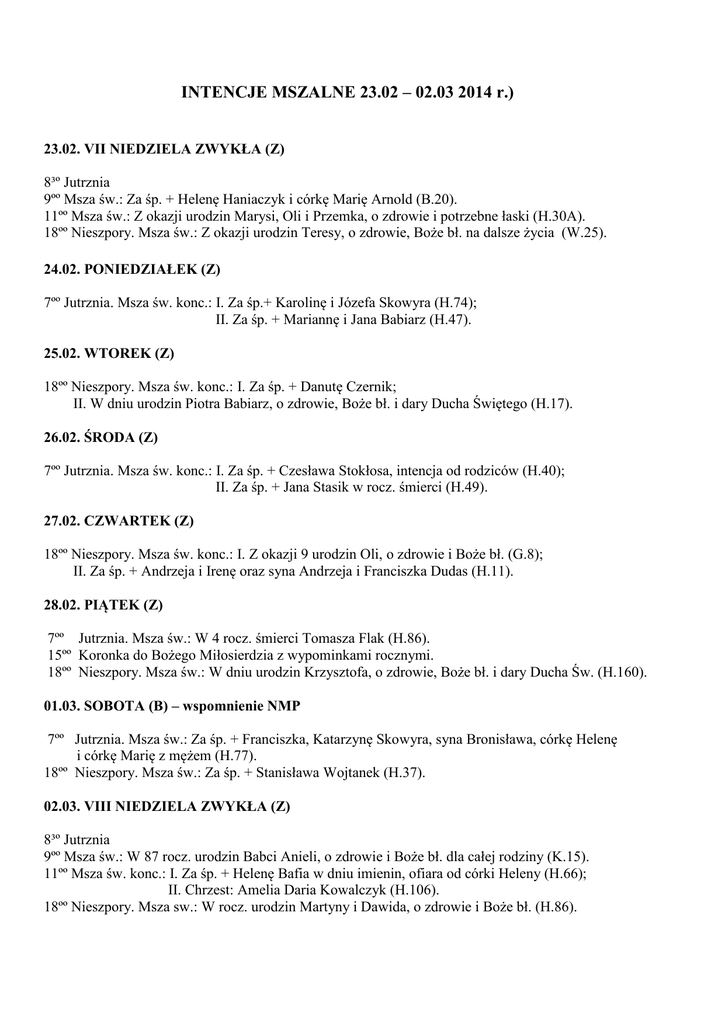 INTENCJE MSZALNE 23.02 – 02.03 2014 r.) 23.02. VII NIEDZIELA ZWYKŁA (Z) 8³º Jutrznia 9ºº Msza św.: Za śp. + Helenę Haniaczyk i córkę Marię Arnold (B.20). 11ºº Msza św.: Z okazji urodzin Marysi, Oli i Przemka, o zdrowie i potrzebne łaski (H.30A). 18ºº Nieszpory. Msza św.: Z okazji urodzin Teresy, o zdrowie, Boże bł. na dalsze życia (W.25). 24.02. PONIEDZIAŁEK (Z) 7ºº Jutrznia. Msza św. konc.: I. Za śp.+ Karolinę i Józefa Skowyra (H.74); II. Za śp. + Mariannę i Jana Babiarz (H.47). 25.02. WTOREK (Z) 18ºº Nieszpory. Msza św. konc.: I. Za śp. + Danutę Czernik; II. W dniu urodzin Piotra Babiarz, o zdrowie, Boże bł. i dary Ducha Świętego (H.17). 26.02. ŚRODA (Z) 7ºº Jutrznia. Msza św. konc.: I. Za śp. + Czesława Stokłosa, intencja od rodziców (H.40); II. Za śp. + Jana Stasik w rocz. śmierci (H.49). 27.02. CZWARTEK (Z) 18ºº Nieszpory. Msza św. konc.: I. Z okazji 9 urodzin Oli, o zdrowie i Boże bł. (G.8); II. Za śp. + Andrzeja i Irenę oraz syna Andrzeja i Franciszka Dudas (H.11). 28.02. PIĄTEK (Z) 7ºº Jutrznia. Msza św.: W 4 rocz. śmierci Tomasza Flak (H.86). 15ºº Koronka do Bożego Miłosierdzia z wypominkami rocznymi. 18ºº Nieszpory. Msza św.: W dniu urodzin Krzysztofa, o zdrowie, Boże bł. i dary Ducha Św. (H.160). 01.03. SOBOTA (B) – wspomnienie NMP 7ºº Jutrznia. Msza św.: Za śp. + Franciszka, Katarzynę Skowyra, syna Bronisława, córkę Helenę i córkę Marię z mężem (H.77). 18ºº Nieszpory. Msza św.: Za śp. + Stanisława Wojtanek (H.37). 02.03. VIII NIEDZIELA ZWYKŁA (Z) 8³º Jutrznia 9ºº Msza św.: W 87 rocz. urodzin Babci Anieli, o zdrowie i Boże bł. dla całej rodziny (K.15). 11ºº Msza św. konc.: I. Za śp. + Helenę Bafia w dniu imienin, ofiara od córki Heleny (H.66); II. Chrzest: Amelia Daria Kowalczyk (H.106). 18ºº Nieszpory. Msza sw.: W rocz. urodzin Martyny i Dawida, o zdrowie i Boże bł. (H.86). . OGŁOSZENIE DUSZPASTERSKIE NA VII NIEDZIELĘ ZWYKŁĄ 1. Tak jak informowaliśmy dzisiejsza kolekta przeznaczona jest na budowę kościoła w Zakopanem, składka inwestycyjna przesunięta jest na drugą niedzielę, kto pragnie dziś złożyć, może włożyć do skrzynki pod chórem. 2. Przyszła niedziela jest niedzielą adoracji Najświętszego Sakramentu oraz zmian Tajemnic Różańcowych po mszy świętej o godz.09:00, które poprowadzą Róże: MB Bolesnej, MB Królowej Tatr i Bł. Salomei. 2. W środę 26.02. odbędzie się spotkanie młodzieży przygotowującej się do Bierzmowania z klasy II gimnazjalnej o godz. 18:30, a z klasy III we czwartek 27.02 po nieszporach i mszy świętej. 3. Bardzo dziękujemy naszym parafianom za prace stolarskie przy kościele: Panu Kazimierzowi, Panu Krzysztofowi i Panu Józefowi za zrobione lektorium. „Niech Cię Pan błogosławi i strzeże. Niech Pan rozpromieni oblicze swe nad Tobą, niech Cię obdarzy swą łaską. Niech zwróci ku Tobie swoje oblicze i niech Cię obdarzy pokojem”(Lb 6,22-27).