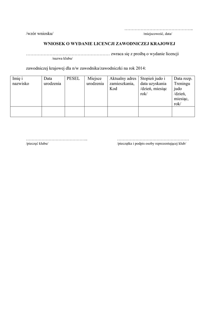……………………………………….. /wzór wniosku/ /miejscowość, data/ WNIOSEK O WYDANIE LICENCJI ZAWODNICZEJ KRAJOWEJ ………………………………………………… zwraca się z prośbą o wydanie licencji /nazwa klubu/ zawodniczej krajowej dla n/w zawodnika/zawodniczki na rok 2014: Imię i nazwisko Data urodzenia PESEL Miejsce urodzenia Aktualny adres Stopień judo i zamieszkania, data uzyskania Kod /dzień, miesiąc rok/ Data rozp. Treningu judo /dzień, miesiąc, rok/ …………………………………….. …………………………………………… /pieczęć klubu/ /pieczątka i podpis osoby reprezentującej klub/