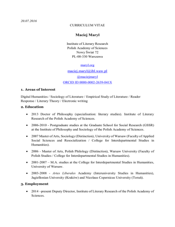 20.07.2016 CURRICULUM VITAE Maciej Maryl Institute of Literary Research Polish Academy of Sciences Nowy Świat 72 PL-00-330 Warszawa maryl.org [email protected] @maciejmaryl ORCID ID 0000-0002-2639-041X 1. Areas of Interest Digital Humanities / Sociology of Literature / Empirical Study of Literature / Reader Response / Literary Theory / Electronic writing 2. Education 2013 Doctor of Philosophy (specialisation: literary studies). Institute of Literary Research of the Polish Academy of Sciences. 2006-2010 - Postgraduate studies at the Graduate School for Social Research (GSSR) at the Institute of Philosophy and Sociology of the Polish Academy of Sciences. 2007 Master of Arts, Sociology (Distinction), University of Warsaw (Faculty of Applied Social Sciences and Resocialization / College for Interdepartmental Studies in Humanities). 2006 - Master of Arts, Polish Philology (Distinction), Warsaw University (Faculty of Polish Studies / College for Interdepartmental Studies in Humanities). 2001-2007 – M.A. studies at the College for Interdepartmental Studies in Humanities, University of Warsaw. 2003-2008 - Artes Liberales Academy (Interuniversity Studies in Humanities), Jagiellonian University (Kraków) and Nicolaus Copernicus University (Toruń). 3. Employment 2014 –present Deputy Director, Institute of Literary Research of the Polish Academy of Sciences. 2013-present Head of the Digital Humanities Centre at the Institute of Literary Research of the Polish Academy of Sciences. 2013-present Assistant Professor, Institute for Literary Research of the Polish Academy of Sciences. 2008 – 2013 Assistant Lecturer, Institute for Literary Research, Polish Academy of Sciences 2005- 2009 Instructor, English Department, The Academy of Management, Łódź/Warsaw. 4. Publications a. Books Maryl, M. (2015). Życie literackie w sieci. Pisarze, instytucje i odbiorcy wobec przemian technologicznych, [Literary life online: writers, institutions and readers facing technological changes], Warszawa: Wydawnictwo IBL, 469 pages. [cover] [abstract in English] b. Edited volumes and journal issues Dąbrówka, A., Maryl, M., Wójtowicz, A., eds. (forthcoming) Teksty kultury uczestnictwa [Texts of participatory culture]. Warszawa: Wydawnictwo IBL PAN. (with Piotr Marecki) Cyfrowa piśmienność [Digital literacy], 3 (152), 2015. Nośnik jest przekazem [Carrier is the message], Teksty Drugie, 3 (146), 2014. Nowa (?) filologia [New (?) philology], Teksty Drugie, 2 (145), 2014. Kultur@ literacka [Liter@ry culture], Teksty Drugie, 6 (138), 2012. c. Chapters in refereed books Maryl, M. (forthcoming) „Tworzenie typologii gatunków piśmiennictwa multimedialnego na przykładzie blogów – propozycja metodologiczna” [Creating a typology of multimedia writing genres on the example of blogs. A methodological proposal] In: Metody badań online. Ed. Piotr Siuda. Gdańsk: Wydawnictwo Naukowe Katedra. Dąbrówka, A., Maryl, M., Wójtowicz, A., red. (forthcoming) Teksty kultury uczestnictwa. Warszawa: Wydawnictwo IBL PAN. Buchner A., Maryl M. (forthcoming) “Nowi literaci. Warsztat twórczy blogerów w kontekście współczesnych przemian kultury literackiej”[New writers. Bloggers’ creative techniques in the light of contemporary transformations of literary culture]. In: Rzeczywistość i zapis. Problemy badania tekstów w naukach społecznych i humanistycznych. Eds. W. Doliński, J. Żurko, K. Grzeszkiewicz-Radulska, S. Mecfal, Łódź: Wydawnictwo Uniwersytetu Łódzkiego, pp. 33-51. [PDF] Maryl, M. (2015) “Antropologia życia literackiego w internecie w perspektywie historii komunikacji” [Anthropology of literary life on the Internet in the perspective of communication history” Kulturowa historia literatury, Red. A. Łebkowska, W. Bolecki, Warszawa: Wydawnictwo IBL, ss. 531-552. [PDF] Maryl. M (2015) “Convergence and Communication: Genre Analysis of the websites of Polish Writers” In: On-line/ Off-line. Between Text and Experience. Writing as a Lifestyle, Eds. P. Gärdenfors, W. Powers, J. Płuciennik, M. Wróblewski. Łódź: Wydawnictwo Uniwersytetu Łódzkiego, pp. 189-208. [PDF] Maryl, M. (2014) „Moderatorzy i amatorzy. Nowe instytucje życia literackiego w sieci” [Moderators and amateurs. New institutions of literary life online] In: Literatura w mediach. Media w literaturze. III. Nowe wizerunki. Eds. K. Taborska, W. Kuska, Wydawnictwo Naukowe PWSZ w Gorzowie Wielkopolskim, Gorzów Wielkopolski 2014, pp.29-51. [PDF] Maryl, M. (2014) „Czytanie romansu online. Kolektywny odbiór literatury w Internecie” [Reading the romance online. Collective literary reading on the Internet] In: Tropy literatury i kultury popularnej. Eds. S. Buryła, L. Gąsowska, D. Ossowska, Warszawa: Wydawnictwo IBL, pp.321-340. [PDF] Maryl, M. (2012) „Pozorne otwarcie hipertekstu. Model komunikacyjny hiperprozy” [Apparent openness of hypertext. On hiperfiction’s model of communication]. In: epolonistyka 2. Red. A, Dziak i S. J. Żurek, Lublin: Wydawnictwo KUL 2012, pp. 154166. [PDF] Maryl, M. (2011) „Differences in literary reading from print versus computer screen. An empirical study”. In: De stralende lezer. Wetenschappelijk onderzoek naar de invloed van het lezen, Ed. Frank Hakemulder. Delft: Eburon, pp. 421-433. [PDF] Maryl, M. (2009) „Antropologia odbioru literatury – zagadnienia metodologiczne” [Anthropology of literary reading – methodological issues], In: Kultura w nauce o literaturze. Wiedza o literaturze z punktu widzenia obserwatora, vol. IV. Eds. B. Balicki, B. Ryż i Emil Szczerbuk, Wrocław: Oficyna Wydawnicza ATUT, pp. 61-88. [PDF] Gumkowska, A., Maryl, M., Toczyski, P. (2009) „Blog to… blog. Blogi oczyma blogerów. Raport z badania jakościowego zrealizowanego przez IBL PAN i Gazeta.pl” [Blog is… blog. Weblogs from the bloggers’ perspective. A report from a qualitative research]. In: Tekst w sieci 1. Ed. Danuta Ulicka, Warszawa: Wydawnictwa Akademickie i Profesjonalne, pp. 285-309. [