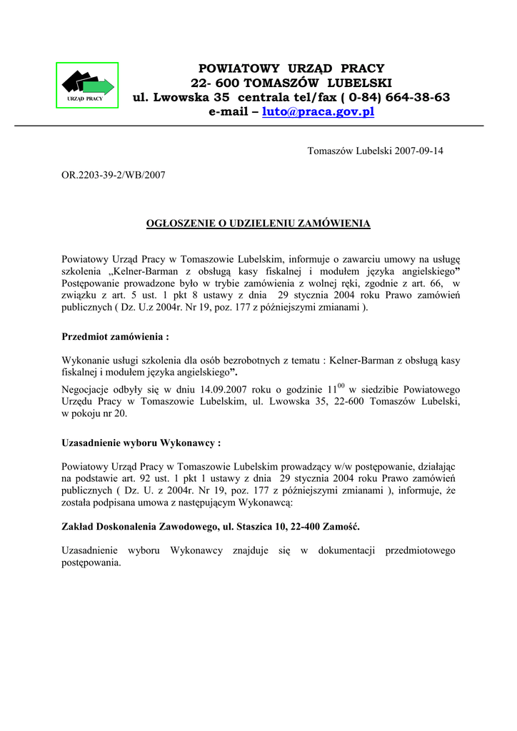 URZĄD PRACY POWIATOWY URZĄD PRACY 22- 600 TOMASZÓW LUBELSKI ul. Lwowska 35 centrala tel/fax ( 0-84) 664-38-63 e-mail – [email protected] Tomaszów Lubelski 2007-09-14 OR.2203-39-2/WB/2007 OGŁOSZENIE O UDZIELENIU ZAMÓWIENIA Powiatowy Urząd Pracy w Tomaszowie Lubelskim, informuje o zawarciu umowy na usługę szkolenia „Kelner-Barman z obsługą kasy fiskalnej i modułem języka angielskiego” Postępowanie prowadzone było w trybie zamówienia z wolnej ręki, zgodnie z art. 66, w związku z art. 5 ust. 1 pkt 8 ustawy z dnia 29 stycznia 2004 roku Prawo zamówień publicznych ( Dz. U.z 2004r. Nr 19, poz. 177 z późniejszymi zmianami ). Przedmiot zamówienia : Wykonanie usługi szkolenia dla osób bezrobotnych z tematu : Kelner-Barman z obsługą kasy fiskalnej i modułem języka angielskiego”. Negocjacje odbyły się w dniu 14.09.2007 roku o godzinie 1100 w siedzibie Powiatowego Urzędu Pracy w Tomaszowie Lubelskim, ul. Lwowska 35, 22-600 Tomaszów Lubelski, w pokoju nr 20. Uzasadnienie wyboru Wykonawcy : Powiatowy Urząd Pracy w Tomaszowie Lubelskim prowadzący w/w postępowanie, działając na podstawie art. 92 ust. 1 pkt 1 ustawy z dnia 29 stycznia 2004 roku Prawo zamówień publicznych ( Dz. U. z 2004r. Nr 19, poz. 177 z późniejszymi zmianami ), informuje, Ŝe została podpisana umowa z następującym Wykonawcą: Zakład Doskonalenia Zawodowego, ul. Staszica 10, 22-400 Zamość. Uzasadnienie wyboru postępowania. Wykonawcy znajduje się w dokumentacji przedmiotowego