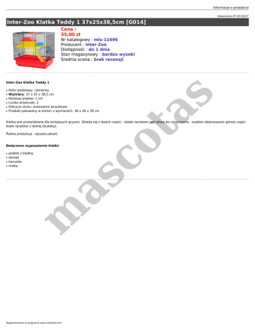 Informacje o produkcie Utworzono 07-03-2017 Inter-Zoo Klatka Teddy 1 37x25x38,5cm [G014] Cena : 55,00 zł Nr katalogowy : mls-11696 Producent : Inter-Zoo Dostępność : do 1 dnia Stan magazynowy : bardzo wysoki Średnia ocena : brak recenzji ● ● ● ● ● Kolor podstawy: czerwony Wymiary: 37 x 25 x 38,5 cm Rozstaw prętów: 1 cm Liczba drzwiczek: 2 Pokrycie drutu: malowanie proszkowe Produkt pakowany w karton o wymiarach: 38 x 26 x 39 cm co ta ● s Inter-Zoo Klatka Teddy 1 Klatka jest przewidziana dla mniejszych gryzoni. Składa się z dwóch części - dzięki zaciskom jest łatwa do czyszczenia - szybkie zdejmowanie górnej części klatki (prętów) z dolnej (kuwety). Polska produkcja - wysoka jakość. Dołączone wyposażenie klatki: ● ● ● m as ● podest z kładką domek karuzela miska Wygenerowano w programie www.oscGold.com