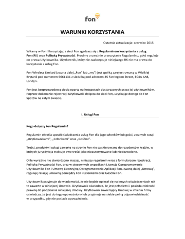 WARUNKI KORZYSTANIA Ostatnia aktualizacja: czerwiec 2015 Witamy w Fon! Korzystając z sieci Fon zgadzasz się z Regulaminem korzystania z usług Fon (RK) oraz Polityką Prywatności. Prosimy o uważnie przeczytanie Regulaminu, gdyż reguluje on prawa Użytkownika. Użytkownik, który nie zaakceptuje niniejszego RK nie ma prawa do korzystania z usług Fon. Fon Wireless Limited (zwana dalej „Fon” lub „my”) jest spółką zarejestrowaną w Wielkiej Brytanii pod numerem 5661131 z siedzibą pod adresem 25 Farringdon Street, EC4A 4AB, Londyn. Fon jest bezprzewodową siecią opartą na hotspotach dostarczanych przez jej użytkowników. Poprzez dokonanie rejestracji Użytkownik dołącza do sieci Fon, uzyskując dostęp do Fon Spotów na całym świecie. I. Usługi Fon Kogo dotyczy ten Regulamin? Regulamin określa sposób świadczenia usług Fon dla jego członków lub gości, zwanych tutaj „Użytkownikami”, „Członkami” oraz „Gośćmi”. Treści, produkty i usługi zawarte na stronie Fon nie są skierowane do rezydentów krajów, w których jurysdykcja traktuje owe treści jako nieautoryzowane lub niedozwolone. O ile wyraźnie nie stwierdzono inaczej, niniejszy regulamin wraz z formularzem rejestracji, Polityką Prywatności Fon, oraz w stosownych wypadkach Licencją Oprogramowania Użytkownika Fon i Umową Licencyjną Oprogramowania Aplikacji Fon, zwaną dalej „Umową”, reguluję relację umowną pomiędzy Fon i Członkami oraz Gośćmi Fon. Użytkownik przyjmuje do wiadomości, że nie będzie opierał się na innych oświadczeniach niż te zawarte w niniejszej Umowie. Użytkownik oświadcza, że jest pełnoletni i posiada zdolność prawną do podpisania niniejszej Umowy. Użytkownik zawierający Umowę w imieniu firmy oświadcza, że jest do tego upoważniony lub przyjmuje na siebie pełną odpowiedzialność w przypadku, gdy nie posiada upoważnienia. Kto ma dostęp do Fon Spotu? Aby stać się Członkiem lub Gościem Fon należy zarejestrować się na stronie, potwierdzić zapoznanie się z Regulaminem i Polityką Prywatności oraz innymi stosownymi warunkami I wyrazić zgodę na zawarte w nich postanowienia. Członkowie Fon posiadają nieograniczony dostęp do wszystkich Fon Spotów. Goście Fon muszą zakupić przepustkę Fon lub na podstawie promocji bądź innej umowy między Fon a podmiotami zewnętrznymi otrzymać ograniczony lub nieograniczony dostęp do usług Fon. Aby uzyskać dostęp do Fon Spotów, Członkowie lub Goście Fon muszą zarejestrować się na stronie Fon albo partnera Fon. Członkowie Fon powinni upewnić się, że umowa z ich dostawcą usług internetowych pozwala na dzielenie przepustowości sieci. Członkowie Fon są w pełni odpowiedzialni za przestrzeganie zobowiązań wobec dostawcy usług internetowych. Rejestracja Konta Fon W trakcie procesu rejestracyjnego Użytkownik poproszony będzie o podanie imienia i nazwiska oraz innych danych osobowych. Należy podać dokładne i pełne informacje. Dane powinny być aktualne. W celu rejestracji do sieci Fon należy wypełnić formularz elektroniczny znajdujący się na stronie internetowej, podając pełne i poprawne dane. Użytkownik będzie miał możliwość wyboru nazwy użytkownika, którą powinien zapamiętać i przechowywać w bezpiecznym miejscu. Użytkownik powinien zapamiętać hasło i nie dzielić się nim z innymi. Użytkownik ma obowiązek niezwłocznego informowania Fon o możliwości niewłaściwego wykorzystania nazwy użytkownika lub hasła, włączając kradzież, zagubienie, nieupoważnione użycie, w celu natychmiastowej anulacji hasła i nazwy użytkownika. Firma Fon pozostaje zwolniona z odpowiedzialności wynikającej z niewłaściwego wykorzystania nazwy użytkownika lub hasła przez nieupoważnione osoby trzecie, do momentu powiadomienia. Należy poinformować Fon o jakichkolwiek zmianach w danych podanych w formularzu rejestracyjnym, jak również o jakichkolwiek późniejszych modyfikacjach tychże informacji. Wszelkie dane i informacje gromadzone i przechowywane przez Fon podlegają Polityce Prywatności Fon. Opis Usług Fon Usługi oferowane przez Fon polegają na: Umożliwianiu dostępu do Fon Spotów. Dostarczaniu informacji o lokalizacji Fon Spotów. Uwierzytelnianiu i rejestracji dostępu Umożliwianiu Gościom Fon dostępu do Fon Spotów poprzez sprzedaż Przepustek Członkowie i Goście Fon mogą podłączyć się do sieci Fon przez wszystkie dostępne Fon Spoty. Aby połączyć się z siecią Fon, Użytkownik musi wybrać Fon Spot, zalogować się za pośrednictwem strony albo portalu Fon, używając nazwy użytkownika oraz hasła. Fon zweryfikuje poprawność danych i zgodnie z niniejszą Umową pozwoli na połączenie z Fon Spotem. Fon poinformuje Użytkownika o dostępnych aktualizacjach Oprogramowania Fon. II. Członkowie Fon Jak stać się Członkiem Fon? Można stać się Członkiem Fon, akceptując niniejszą Umowę oraz kupując router Fon lub router partnera Fon z zainstalowaną opcją Fon. W przypadku posiadania routera niekompatybilnego z Oprogramowaniem Fon Użytkownik będzie musiał nabyć go na stronie Fon. Instalacja i aktywacja Oprogramowania Fon oraz Fon Spotu. Po rejestracji w sieci Fon i akceptacji Umowy Użytkownik będzie mógł pobrać, zainstalować i wykorzystywać Oprogramowanie Fon. Użytkownik zobowiązany jest przeprowadzić instalację Oprogramowania Fon zgodnie z instrukcjami opublikowanymi na stronie internetowej Fon. Użytkownik akceptuje i rozumie, że firma Fon nie ponosi odpowiedzialności za wszelkie szkody wynikające z nieodpowiedniej instalacji oprogramowania Fon. W przypadku zaobserwowania jakiejkolwiek właściwości sprzętu, oprogramowania czy usługi Fon mogącej wywołać szkodę, Użytkownik natychmiast zgłosi ten fakt w Centrum pomocy online dla użytkownika końcowego. Fon Spot będzie aktywny i gotowy do użytku po rejestracji i poprawnej instalacji Oprogramowania oraz Routera Fon. Po wejściu w życie n