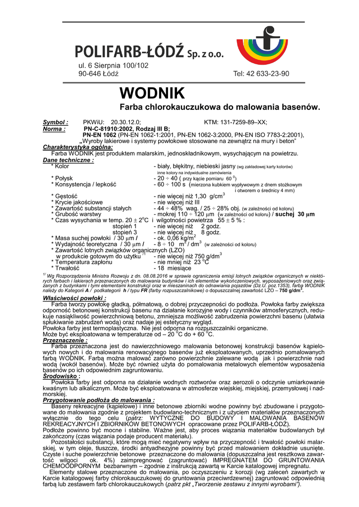 WODNIK Farba chlorokauczukowa do malowania basenów. Symbol : Norma : PKWiU: 20.30.12.0; KTM: 131-7259-89–XX; PN-C-81910:2002, Rodzaj III B; PN-EN 1062 (PN-EN 1062-1:2001, PN-EN 1062-3:2000, PN-EN ISO 7783-2:2001), „Wyroby lakierowe i systemy powłokowe stosowane na zewnątrz na mury i beton” Charakterystyka ogólna: Farba WODNIK jest produktem malarskim, jednoskładnikowym, wysychającym na powietrzu. Dane techniczne : * Kolor - biały, błękitny, niebieski jasny (wg zakładowej karty kolorów) * Połysk * Konsystencja / lepkość inne kolory na indywidualne zamówienia - 20 ÷ 40 ( przy kącie pomiaru 60 0) - 60 ÷ 100 s (mierzona kubkiem wypływowym z dnem stożkowym 3 i otworem o średnicy 4 mm) * Gęstość - nie więcej niż 1,30 g/cm * Krycie jakościowe - nie więcej niż III * Zawartość substancji stałych - 44 ÷ 48% wag. / 25 ÷ 28% obj. (w zależności od koloru) * Grubość warstwy - mokrej 110 ÷ 120 µm (w zależności od koloru) / suchej 30 µm o * Czas wysychania w temp. 20 2 C i wilgotności powietrza 55 5 % : stopień 1 - nie więcej niż 2 godz. stopień 3 - nie więcej niż 2 8 godz. * Masa suchej powłoki / 30 µm / - ok. 0,06 kg/m 2 3 * Wydajność teoretyczna / 30 µm / - 8 ÷ 10 m / dm (w zależności od koloru) * Zawartość lotnych związków organicznych (LZO) /1 3 w produkcie gotowym do użytku - nie więcej niż 750o g/dm * Temperatura zapłonu - nie mniej niż 23 C * Trwałość - 18 miesiące 1/ Wg Rozporządzenia Ministra Rozwoju z dn. 08.08.2016 w sprawie ograniczenia emisji lotnych związków organicznych w niektórych farbach i lakierach przeznaczonych do malowania budynków i ich elementów wykończeniowych, wyposażeniowych oraz związanych z budynkami i tymi elementami konstrukcji oraz w mieszaninach do odnawiania pojazdów (Dz.U. poz.1353), farba WODNIK należy do Kategorii A / podkategorii h / typu FR (farby rozpuszczalnikowe) o dopuszczalnej zawartość LZO – 750 g/dm3. Właściwości powłoki : Farba tworzy powłokę gładką, półmatową, o dobrej przyczepności do podłoża. Powłoka farby zwiększa odporność betonowej konstrukcji basenu na działanie korozyjne wody i czynników atmosferycznych, redukuje nasiąkliwość powierzchniową betonu, zmniejsza możliwość zabrudzenia powierzchni basenu (ułatwia spłukiwanie zabrudzeń wodą) oraz nadaje jej estetyczny wygląd. Powłoka farby jest termoplastyczna. Nie jest odporna na rozpuszczalniki organiczne. 0 0 Może być eksploatowana w temperaturze od – 20 C do + 60 C. Przeznaczenie : Farba przeznaczona jest do nawierzchniowego malowania betonowej konstrukcji basenów kąpielowych nowych i do malowania renowacyjnego basenów już eksploatowanych, uprzednio pomalowanych farbą WODNIK. Farbą można malować zarówno powierzchnie zalewane wodą jak i powierzchnie nad wodą (wokół basenów). Może być również użyta do pomalowania metalowych elementów wyposażenia basenów po ich odpowiednim zagruntowaniu. Środowisko : Powłoka farby jest odporna na działanie wodnych roztworów oraz aerozoli o odczynie umiarkowanie kwaśnym lub alkalicznym. Może być eksploatowana w atmosferze wiejskiej, miejskiej, przemysłowej i nadmorskiej. Przygotowanie podłoża do malowania : Baseny rekreacyjne (kąpielowe) i inne betonowe zbiorniki wodne powinny być zbudowane i przygotowane do malowania zgodnie z projektem budowlano-technicznym i z użyciem materiałów przeznaczonych wyłącznie do tego celu (patrz: WYTYCZNE DO BUDOWY I MALOWANIA BASENÓW REKREACYJNYCH I ZBIORNIKÓW BETONOWYCH opracowane przez POLIFARB-ŁÓDŹ). Podłoże powinno być mocne i stabilne. Ważne jest, aby proces wiązania materiałów budowlanych był zakończony (czas wiązania podaje producent materiału). Pozostałości substancji, które mogą mieć negat ywny wpływ na przyczepność i trwałość powłoki malarskiej, w tym oleje, tłuszcze, środki antyadhezyjne powinny być przed malowaniem dokładnie usunięte. Czyste i suche powierzchnie betonowe przeznaczone do malowania (dopuszczalna jest resztkowa zawartość wilgoci ok. 4%) zaimpregnować (zagruntować) IMPREGNATEM DO GRUNTOWANIA CHEMOODPORNYM bezbarwnym – zgodnie z instrukcją zawartą w Karcie katalogowej impregnatu. Elementy stalowe przeznaczone do malowania, po oczyszczeniu z korozji (wg zaleceń zawartych w Karcie katalogowej farby chlorokauczukowej do gruntowania przeciwrdzewnej) zagruntować odpowiednią farbą lub zestawem farb chlorokauczukowych (patrz pkt „Tworzenie zestawu z innymi wyrobami”). Przy renowacji basenów, powierzchnie przeznaczone do malowania umyć pod wysokim ciśnieniem wodą z dodatkiem detergentu (wskazane jest użycie gorącej wody). Można do tego celu użyć 2 % wodnego roztworu EMULSOL’u RN-1 i spłukać. Starą powłokę malarską, niezwiązaną z podłożem usunąć ręcznie, z użyciem narzędzi z napędem mechanicznym lub przez piaskowanie. Powierzchnie, na których powłoka malarska jest dobrze przyczepna do podłoża lekko przeszlifować i odpylić. Miejsca pozbawione powłoki malarskiej przed malowaniem zagruntować ww. IMPREGNATEM lub rozcieńczoną rozcieńczalnikiem (5 ÷ 10 % wag.) farbą WODNIK. Stalowe elementy wyposażenia basenów ( barierki, schodki, drabinki) - w zależności od stopnia znisz1 czenia powłoki malarskiej - oczyścić metodą strumieniowo-ścierną do czystości Sa 2 /2 (całą powierzchnię lub miejscowo). Dopuszcza się miejscowe czyszczenie narzędziami z napędem mechanicznym do czystości co najmniej St 2. Ubytki powłoki malarskiej uzupełnić (wymienioną w pkt-cie.„Tworzenie zestawu z innymi wyrobami”) farbą chlorokauczukową przeciwrdzewną lub zestawem farb chlorokauczukowych. UWAGA: Do uszczelniania niecki basenu nie stosować preparatów silikonowych (w tym szkła wodnego), gdyż powłoka malarska traci przyczepność. Warunki malowania : Temperatura farby Temperatura podłoża Wilgotność wzgl. powietrza o o 10 ÷ 30 C 5 ÷ 40 C najwyżej 80 % o Temperatura podł