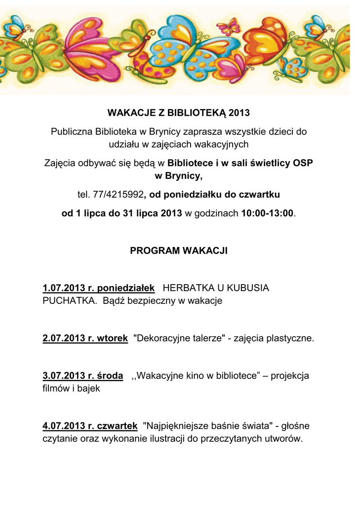 WAKACJE Z BIBLIOTEKĄ 2013 Publiczna Biblioteka w Brynicy zaprasza wszystkie dzieci do udziału w zajęciach wakacyjnych Zajęcia odbywać się będą w Bibliotece i w sali świetlicy OSP w Brynicy, tel. 77/4215992, od poniedziałku do czwartku od 1 lipca do 31 lipca 2013 w godzinach 10:00-13:00. PROGRAM WAKACJI 1.07.2013 r. poniedziałek HERBATKA U KUBUSIA PUCHATKA. Bądź bezpieczny w wakacje 2.07.2013 r. wtorek "Dekoracyjne talerze" - zajęcia plastyczne. 3.07.2013 r. środa ,,Wakacyjne kino w bibliotece” – projekcja filmów i bajek 4.07.2013 r. czwartek "Najpiękniejsze baśnie świata" - głośne czytanie oraz wykonanie ilustracji do przeczytanych utworów. 8.07.2013 r. poniedziałek TURNIEJ TENISA STOŁOWEGO 9.07.2013 r. wtorek plasteliny. Moje ulubione zwierzę - płaskorzeźba z 10.07.2013 r. środa Poznajemy przyrodnicze obiekty chronione w Gminie Łubniany. 11.07.2013 r. czwartek "Moja magiczna mandala" - zajęcia plastyczne. 15.07.2013 r. poniedziałek Książka na wakacje, głośne czytanie. 16.07.2013 r. wtorek "Kamykowe różności" - malowanie kamieni i tworzenie z nich figur 17.07.2013 r. środa „Wesoła Biblioteka” – konkursy i piosenki 18.07.2013 r. czwartek „Zabawa z myszką” – zajęcia komputerowe 22.07.2013 r. poniedziałek „Kwiaty dla biblioteki” – tworzenie kwiatów 23.07.2013 r. wtorek RÓŻNE ZAWODY. Kiedy dorosnę, będę... 24.07.2012 r. środa „Rusz głową” – zagadki, rebusy, krzyżówki, kolorowanki o tematyce letniej. 25.07.2013r. czwartek ,,Wakacyjne kino w bibliotece” – projekcja filmów i bajek 29.07.2012 r. poniedziałek "Najpiękniejsze baśnie świata" głośne czytanie oraz wykonanie ilustracji do przeczytanych utworów. 30.07.2013 r. wtorek „Sposób na nudę” gry i zabawy z użyciem komputera. 31.07.2013 r. środa ZAKOŃCZENIE WAKACJI 2012 wystawa prac plastycznych, wybieramy mistrza czytania, rozwiązywanie krzyżówek i rebusów