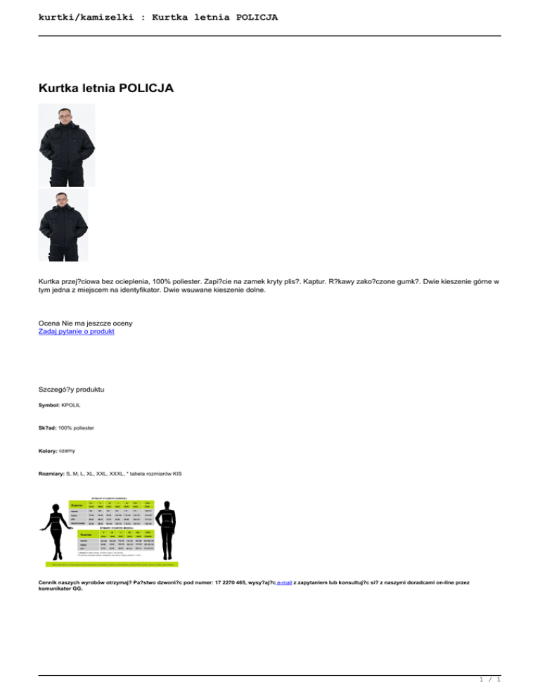 kurtki/kamizelki : Kurtka letnia POLICJA Kurtka letnia POLICJA Kurtka przej?ciowa bez ocieplenia, 100% poliester. Zapi?cie na zamek kryty plis?. Kaptur. R?kawy zako?czone gumk?. Dwie kieszenie górne w tym jedna z miejscem na identyfikator. Dwie wsuwane kieszenie dolne. Ocena Nie ma jeszcze oceny Zadaj pytanie o produkt Szczegó?y produktu Symbol: KPOLIL Sk?ad: 100% poliester Kolory: czarny Rozmiary: S, M, L, XL, XXL, XXXL, * tabela rozmiarów KIS Cennik naszych wyrobów otrzymaj? Pa?stwo dzwoni?c pod numer: 17 2270 465, wysy?aj?c e-mail z zapytaniem lub konsultuj?c si? z naszymi doradcami on-line przez komunikator GG. 1 / 1 Powered by TCPDF (www.tcpdf.org)