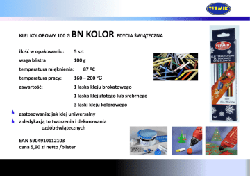 KLEJ KOLOROWY 100 G BN KOLOR EDYCJA ŚWIĄTECZNA ilość w opakowaniu: 5 szt waga blistra 100 g temperatura mięknienia: 87 ºC temperatura pracy: 160 – 200 ºC zawartość: 1 laska kleju brokatowego 1 laska klej złotego lub srebrnego 3 laski kleju kolorowego zastosowania: jak klej uniwersalny z dedykacją to tworzenia i dekorowania ozdób świątecznych EAN 5904910112103 cena 5,90 zł netto /blister