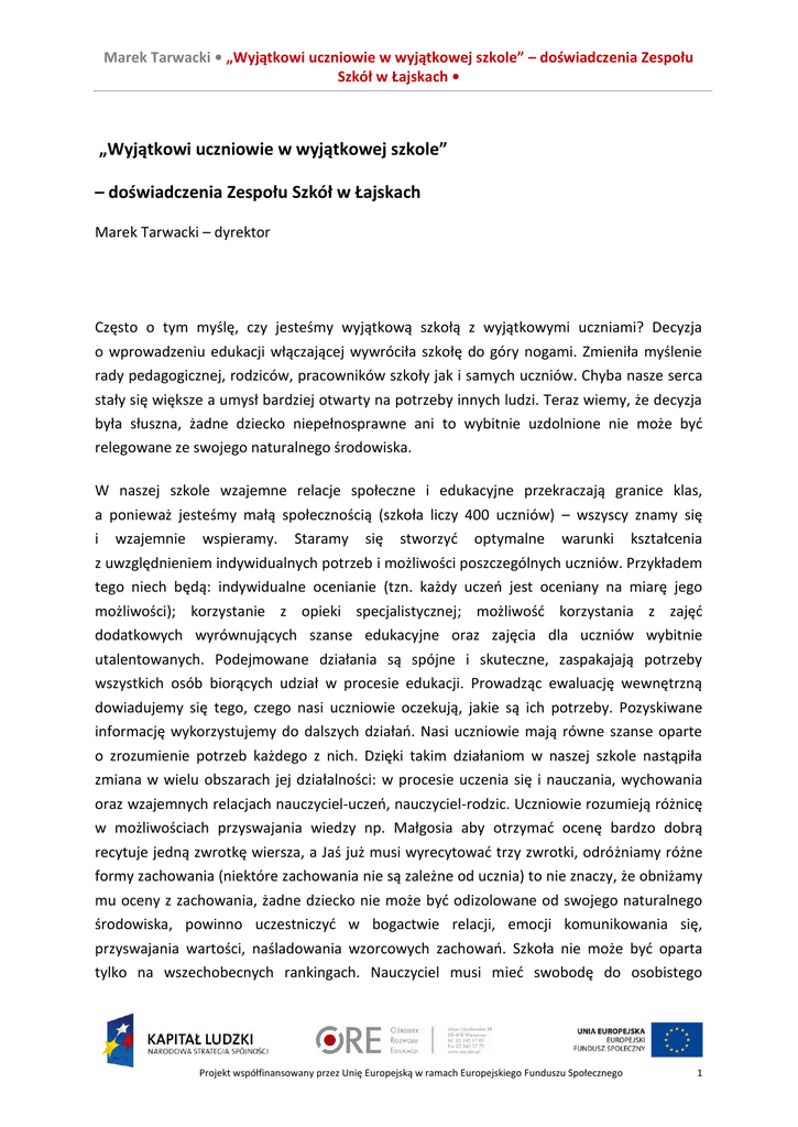 Marek Tarwacki • „Wyjątkowi uczniowie w wyjątkowej szkole” – doświadczenia Zespołu Szkół w Łajskach • „Wyjątkowi uczniowie w wyjątkowej szkole” – doświadczenia Zespołu Szkół w Łajskach Marek Tarwacki – dyrektor Często o tym myślę, czy jesteśmy wyjątkową szkołą z wyjątkowymi uczniami? Decyzja o wprowadzeniu edukacji włączającej wywróciła szkołę do góry nogami. Zmieniła myślenie rady pedagogicznej, rodziców, pracowników szkoły jak i samych uczniów. Chyba nasze serca stały się większe a umysł bardziej otwarty na potrzeby innych ludzi. Teraz wiemy, że decyzja była słuszna, żadne dziecko niepełnosprawne ani to wybitnie uzdolnione nie może być relegowane ze swojego naturalnego środowiska. W naszej szkole wzajemne relacje społeczne i edukacyjne przekraczają granice klas, a ponieważ jesteśmy małą społecznością (szkoła liczy 400 uczniów) – wszyscy znamy się i wzajemnie wspieramy. Staramy się stworzyć optymalne warunki kształcenia z uwzględnieniem indywidualnych potrzeb i możliwości poszczególnych uczniów. Przykładem tego niech będą: indywidualne ocenianie (tzn. każdy uczeń jest oceniany na miarę jego możliwości); korzystanie z opieki specjalistycznej; możliwość korzystania z zajęć dodatkowych wyrównujących szanse edukacyjne oraz zajęcia dla uczniów wybitnie utalentowanych. Podejmowane działania są spójne i skuteczne, zaspakajają potrzeby wszystkich osób biorących udział w procesie edukacji. Prowadząc ewaluację wewnętrzną dowiadujemy się tego, czego nasi uczniowie oczekują, jakie są ich potrzeby. Pozyskiwane informację wykorzystujemy do dalszych działań. Nasi uczniowie mają równe szanse oparte o zrozumienie potrzeb każdego z nich. Dzięki takim działaniom w naszej szkole nastąpiła zmiana w wielu obszarach jej działalności: w procesie uczenia się i nauczania, wychowania oraz wzajemnych relacjach nauczyciel-uczeń, nauczyciel-rodzic. Uczniowie rozumieją różnicę w możliwościach przyswajania wiedzy np. Małgosia aby otrzymać ocenę bardzo dobrą recytuje jedną zwrotkę wiersza, a Jaś już musi wyrecytować trzy zwrotki, odróżniamy różne formy zachowania (niektóre zachowania nie są zależne od ucznia) to nie znaczy, że obniżamy mu oceny z zachowania, żadne dziecko nie może być odizolowane od swojego naturalnego środowiska, powinno uczestniczyć w bogactwie relacji, emocji komunikowania się, przyswajania wartości, naśladowania wzorcowych zachowań. Szkoła nie może być oparta tylko na wszechobecnych rankingach. Nauczyciel musi mieć swobodę do osobistego Projekt współfinansowany przez Unię Europejską w ramach Europejskiego Funduszu Społecznego 1 Marek Tarwacki • „Wyjątkowi uczniowie w wyjątkowej szkole” – doświadczenia Zespołu Szkół w Łajskach • i zawodowego rozwoju. Z naszego doświadczenia wynika, że to szkoła rejonowa, do której uczęszcza większość dzieci z danego obszaru (obwodu szkoły) jest najlepszym miejscem do włączania uczniów ze specjalnymi potrzebami edukacyjnymi. Tworząc im odpowiednie warunki uzyskujemy największe postępy w integracji społecznej, dydaktyce i wychowaniu. Podstawowym warunkiem jest możliwość przebywania ze sobą na co dzień (najlepszym terapeutą jest zdrowy rówieśnik), tę możliwość daje zatrudnienie specjalisty asystującego uczniowi przez cały dzień. Korzystanie z pomocy specjalistycznej i dostosowanie programów nauczania do możliwości ucznia. Staramy się systematycznie dążyć do współpracy w procesie planowania, monitorowania działań, finansowania – wszystkich podmiotów bezpośrednio mających wpływ na funkcjonowanie szkoły. Kadra pracująca w placówce ma możliwość kształcenia i samokształcenia się w kierunku umiejętności wykorzystywania form i metod nauczania, tworzenia indywidualnych planów i programów edukacyjnych oraz pracy zespołowej. W ramach wewnątrzszkolnego doskonalenia nauczyciele i pracownicy szkoły zapoznają się z różnymi formami niepełnosprawności. Specjaliści przekazują konkretne przykłady rozwiązań i możliwości funkcjonowania uczniów ze specjalnymi potrzebami na terenie szkoły. Sprzyja to indywidualnemu podejściu do ucznia, oceny jego możliwości oraz wzmocnieniu uzdolnień. Wiemy, że różnorodność to podstawa do prawidłowych zachowań wartości edukacyjnych i wychowawczych. Spostrzeganie przez nauczycieli i specjalistów mocnych i słabych stron ucznia powoduje pełne włączanie go w system edukacyjny. W naszej placówce powoływane są zespoły składające się z wychowawcy nadzorującego cały proces dydaktyczno-wychowawczy oraz grona specjalistów, których zadaniem jest realizacja zaleceń zapisanych w orzeczeniach i opiniach poradni psychologiczno-pedagogicznej, jak również pomoc nauczycielom (dydaktykom) w bezpośredniej pracy z uczniem. Ważną rolę nad wszystkim pełni Lider szkolny. Jest to osoba wyłaniana z grona rady pedagogicznej, co do której wszyscy maja zaufanie, wierzą w jej kompetencję i możliwości organizacyjne, która czuwa nad całościowym realizowaniem pomocy specjalistycznej, jak i dydaktycznowychowawczej przez wszystkie powołane zespoły. Wspólne zdobywanie wiedzy i doświadczenia wprowadziło do organizacji nauczania wiele nowych pomysłów: planowanie lekcji uwzględniających różne potrzeby uczniów, rozwijanie umiejętności spostrzegania i rozumienia różnic, angażowanie uczniów we własne uczenie się, obserwacja lekcji i zajęć specjalistycznych, poszukiwanie właściwych rozwiązań, z którymi muszą zmierzyć się uczniowie, uczenie się wzajemnej współpracy. Nasze doświadczenie mówi nam, że im wcześniejsze wsparcie ucznia ze specjalnymi potrzebami edukacyjnymi, tym większa możliwość do uzyskania sukcesu. Wsparcie to musi być kompleksowe. Obejmuje ono nie tylko ucznia, ale i jego rodzinę. Specjaliści i wychowawcy wspierają rodziców popr