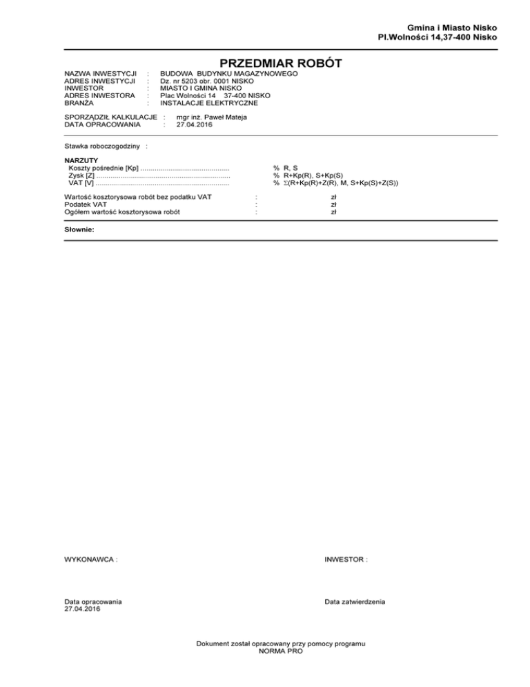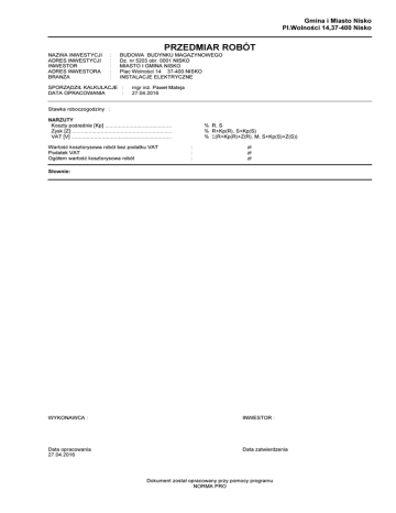 Gmina i Miasto Nisko Pl.Wolności 14,37-400 Nisko PRZEDMIAR ROBÓT NAZWA INWESTYCJI ADRES INWESTYCJI INWESTOR ADRES INWESTORA BRANŻA : : : : : BUDOWA BUDYNKU MAGAZYNOWEGO Dz. nr 5203 obr. 0001 NISKO MIASTO I GMINA NISKO Plac Wolności 14 37-400 NISKO INSTALACJE ELEKTRYCZNE SPORZĄDZIŁ KALKULACJE : DATA OPRACOWANIA : mgr inż. Paweł Mateja 27.04.2016 Stawka roboczogodziny : NARZUTY Koszty pośrednie [Kp] ............................................ Zysk [Z] .................................................................. VAT [V] .................................................................. Wartość kosztorysowa robót bez podatku VAT Podatek VAT Ogółem wartość kosztorysowa robót % R, S % R+Kp(R), S+Kp(S) % Σ(R+Kp(R)+Z(R), M, S+Kp(S)+Z(S)) : : : zł zł zł Słownie: WYKONAWCA : INWESTOR : Data opracowania 27.04.2016 Data zatwierdzenia Dokument został opracowany przy pomocy programu NORMA PRO KSIĄŻKA PRZEDMIARÓW Lp. Podst Opis i wyliczenia j.m. 1 INSTALACJE WEWNĘTRZNE 1 KNNR 5 Przewody wtynkowe o łącznym przekroju żył do 7.5 mm2 układane w tynku in- m d.1 0204-02 nym niż betonowy 305 m 2 KNNR 5 d.1 0204-06 3 KNNR 5 d.1 0204-06 4 KNNR 5 d.1 0302-01 5 KNNR 5 d.1 0306-02 6 KNNR 5 d.1 0306-03 7 KNNR 5 d.1 0308-06 8 KNNR 5 d.1 0308-08 analogia 9 KNNR 5 d.1 0502-04 10 KNNR 5 d.1 0502-02 11 KNNR 5 d.1 0502-02 Przewody kabelkowe płaskie o łącznym przekroju żył do 30 mm2 układane w tynku innym niż betonowy 5x2.5 15 m Przewody kabelkowe płaskie o łącznym przekroju żył do 30 mm2 układane w tynku innym niż betonowy( 5x6) 3 m Puszki instalacyjne podtynkowe pojedyncze o śr.do 60 mm szt. 6 szt. Łączniki i przyciski jednobiegunowe podtynkowe w puszce instalacyjnej szt. 1 szt. Łączniki świecznikowe podtynkowe w puszce instalacyjnej szt. 1 szt. 14 KNNR 5 d.2 0705-01 15 KNNR 5 d.2 0713-01 16 KNNR 5 d.2 0404-08 17 KNNR 5 d.2 0408-01 m Gniazda instalacyjne wtyczkowe ze stykiem ochronnym bryzgoszczelne 3-bie- szt. gunowe przykręcane o obciążalności do 16 A i przekroju przewodów do 2.5 mm2 4 szt. Gniazda instalacyjne wtyczkowe ze stykiem ochronnym wodoszczelne 5-biegunowe przykręcane o obciążalności do 32 A i przekroju przewodów do 10 mm2 1 Razem 305.000 RAZEM 305.000 15.000 RAZEM 15.000 3.000 RAZEM 3.000 6.000 RAZEM 6.000 1.000 RAZEM 1.000 1.000 RAZEM 1.000 4.000 RAZEM 4.000 1.000 RAZEM 1.000 6.000 RAZEM 6.000 2.000 RAZEM 2.000 1.000 RAZEM 1.000 50.000 RAZEM 50.000 25.000 RAZEM 25.000 25.000 RAZEM 25.000 25.000 RAZEM 25.000 1.000 RAZEM 1.000 2.000 RAZEM 2.000 szt. szt. Oprawy oświetleniowe przykręcane (zwykłe) - świetlówkowa do 4x40 W(60x60) kpl. 6 kpl. Oprawy oświetleniowe przykręcane (zwykłe) - świetlówkowa do 2x20 W(szczelna ip-55 okrągła) 2 kpl. Oprawy oświetleniowe przykręcane (zwykłe) - świetlówkowa do 2x20 W IP63 OKRĄGŁA ZEWN. 1 kpl. 2 Zasilanie magazynu 12 KNNR 5 Cięcie nawierzchni z mas mineralno-asfaltowych na głębokość 5 cm d.2 0721-01 2*25 13 KNNR 5 d.2 0701-05 m Poszcz kpl. kpl. m m Kopanie rowów dla kabli w sposób mechaniczny w gruncie kat. III-IV m3 25 m3 Ułożenie rur osłonowych z PCW o śr.do 140 mm-fi 75 DVK m 25 m Układanie kabli o masie do 0.5 kg/m w rurach, pustakach lub kanałach zamkniętych-YKXS 5X10 25 m Obudowy ROZDZIELNICY o powierzchni do 1.0 m2 szt. 1 szt. Dodatkowe wyposażenie rozdzielnic modułowych - szyna nośna szt. 2 szt. -2- Norma PRO Wersja 4.01, Marzec 2003 r. m KSIĄŻKA PRZEDMIARÓW Lp. Podst 18 KNNR 5 d.2 0407-03 analogia 19 KNNR 5 d.2 0407-01 analogia 20 KNNR 5 d.2 0407-04 analogia 21 KNNR 5 d.2 0407-04 analogia 22 KNR 5-08 d.2 0108-01 23 KNR 5-08 d.2 0619-01 24 KNR 5-08 d.2 0604-01 analogia 25 KNR 5-08 d.2 0611-03 26 KNR 5-08 d.2 0803-02 27 KNR 4-03 d.2 1203-01 28 KNR 4-03 d.2 1205-02 Opis i wyliczenia Rozłącznik lub wyłącznik przeciwporażeniowy 1 (2)-biegunowy w rozdzielnicach j.m. szt. 4 szt. Wyłącznik nadprądowy 1-biegunowy w rozdzielnicach szt. 4 szt. Ochronnik DEIHWENTIL szt. 1 szt. Rozłącznik 3 (4)-biegunowy w rozdzielnicach szt. 1 szt. Rury winidurowe o śr. do 20 mm układane p.t. w betonie w gotowych bruzdach, bez zaprawiania bruzd 25.00 m Montaż złączy do rynny okapowej na dachu w instalacji uziemiającej i odgromowej 16.00 szt. Montaż zwodów pionowych nienaprężanych z pręta o śr.do 10mm na dachu płaskim pokrytym blachą m 25.00 m m szt. Montaż uziomu powierzchniowego w wykopie o głębokości do 0.6 m w gruncie m kat.IV 138 m Mechaniczne wykonanie ślepych otworów w betonie głębokości do 8 cm i śr do szt. 20 mm 4 szt. Badanie linii kablowej o ilości żył do 4 odc. 1 odc. Następny pomiar uziemienia ochronnego lub roboczego pomiar . pomiar . 1 Poszcz 4.000 RAZEM 4.000 4.000 RAZEM 4.000 1.000 RAZEM 1.000 1.000 RAZEM 1.000 25.000 RAZEM 25.000 16.000 RAZEM 16.000 25.000 RAZEM 25.000 138.000 RAZEM 138.000 4.000 RAZEM 4.000 1.000 RAZEM 1.000 1.000 RAZEM -3- Norma PRO Wersja 4.01, Marzec 2003 r. Razem 1.000