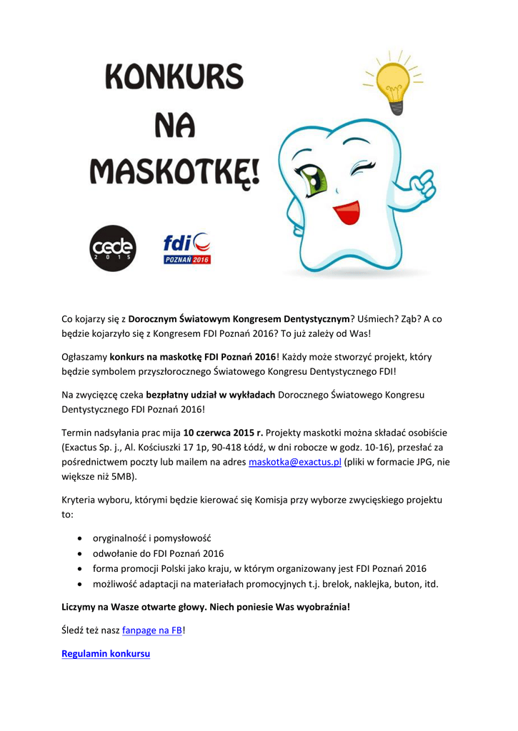 Co kojarzy się z Dorocznym Światowym Kongresem Dentystycznym? Uśmiech? Ząb? A co będzie kojarzyło się z Kongresem FDI Poznań 2016? To już zależy od Was! Ogłaszamy konkurs na maskotkę FDI Poznań 2016! Każdy może stworzyć projekt, który będzie symbolem przyszłorocznego Światowego Kongresu Dentystycznego FDI! Na zwycięzcę czeka bezpłatny udział w wykładach Dorocznego Światowego Kongresu Dentystycznego FDI Poznań 2016! Termin nadsyłania prac mija 10 czerwca 2015 r. Projekty maskotki można składać osobiście (Exactus Sp. j., Al. Kościuszki 17 1p, 90-418 Łódź, w dni robocze w godz. 10-16), przesłać za pośrednictwem poczty lub mailem na adres [email protected] (pliki w formacie JPG, nie większe niż 5MB). Kryteria wyboru, którymi będzie kierować się Komisja przy wyborze zwycięskiego projektu to: oryginalność i pomysłowość odwołanie do FDI Poznań 2016 forma promocji Polski jako kraju, w którym organizowany jest FDI Poznań 2016 możliwość adaptacji na materiałach promocyjnych t.j. brelok, naklejka, buton, itd. Liczymy na Wasze otwarte głowy. Niech poniesie Was wyobraźnia! Śledź też nasz fanpage na FB! Regulamin konkursu
