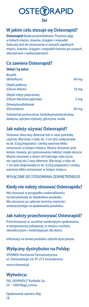Żel W jakim celu stosuje się Osteorapid? Osteorapid działa przeciwbólowo. Przynosi ulgę w bólach mięśni, stawów, ścięgien i więzadeł. Zalecany jest do stosowania w stanach zapalnych mięśni, stawów, ścięgien i więzadeł również po urazach, stłuczeniach i nadwyrężeniach. Co zawiera Osteorapid? Skład (1g żelu): Biszofit (Bishofitum) 60 mg Olejek jodłowy (Oleum Abietis) 10 mg Olejek mięty pieprzowej (Oleum Menthae piperitae) Dimetylosulfotlenek (Dimexidum) 5 mg 60 mg Substancje pomocnicze: karboksymetyloceluloza, żelatyna, spirytus etylowy, gliceryna, woda. Jak należy używać Osteorapid? Stosować dwa razy dziennie lub w razie potrzeby częściej. Wycisnąć z tuby ok. 2 cm żelu (odpowiada to ok. 0,5g preparatu) i cienką warstwę lekko wmasować w bolące miejsca. Można stosować pod koniec masażu, po zastosowaniu nałożyć ciepłe okrycie. Można stosować u dzieci od trzeciego roku życia, nie częściej niż 2 razy dziennie. Wycisnąć z tuby ok. 1 cm żelu (odpowiada to ok. 0,25g preparatu) i cienką warstwę lekko wmasować w bolące miejsca. WYŁĄCZNIE DO STOSOWANIA ZEWNĘTRZNEGO! Kiedy nie należy stosować Osteorapidu? Nie stosować w przypadku nadwrażliwości na którykolwiek ze składników produktu. Nie stosować po upływie terminu ważności umieszczonego na opakowaniu produktu. Jak należy przechowywać Osteorapid? Przechowywać w szczelnie zamkniętym opakowaniu, w temperaturze pokojowej, w miejscu suchym, niewidocznym i niedostępnym dla dzieci. Informacji na temat produktu udziela dystrybutor. Wyłączny dystrybutor na Polskę: VITAMED Hurtownia Farmaceutyczna ul. Ostrowskiego 24, 97-213 Smardzewice www.vitamed.pl Wytwórca: SIA „SILVANOLS” Kurbada 2a, LV – 1009 Ryga, Łotwa Opakowanie zawiera 40g CE