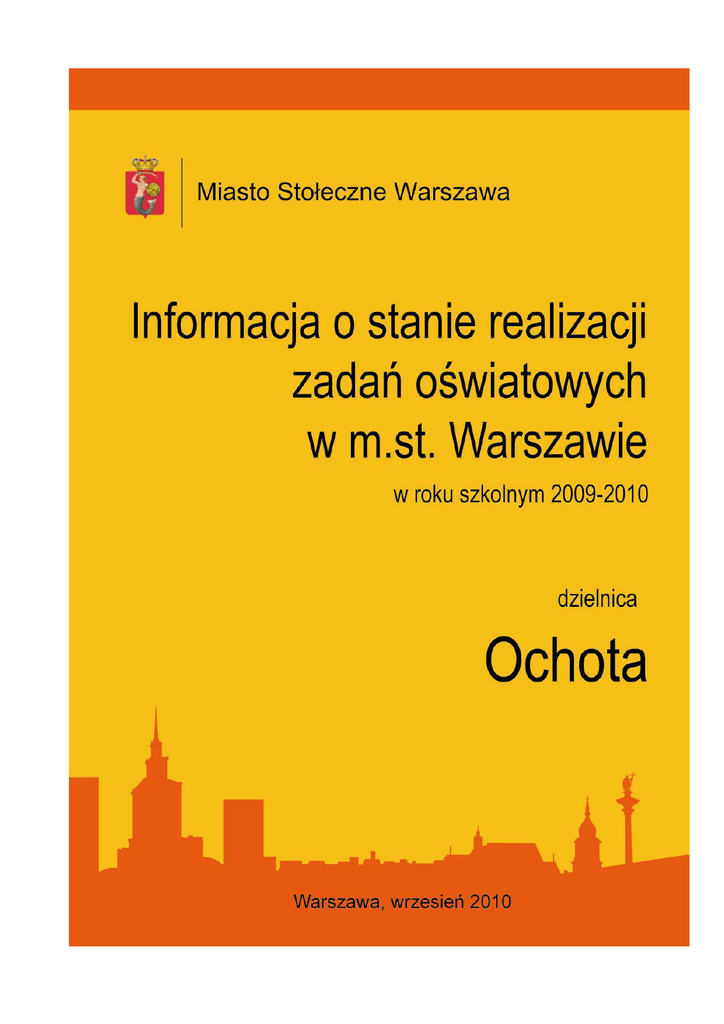 Informacja o stanie realizacji zadań oświatowych w dzielnicy Ochota w roku szkolnym 2009/2010 Spis treści 1. Wprowadzenie ........................................................................................................................................... 5 2. Jednostki systemu oświaty nadzorowane przez dzielnicę – podsumowanie ............................................ 6 1. Informacje ogólne, specyfika jednostek ................................................................................................. 8 a. Przedszkola i inne formy wychowania przedszkolnego...................................................................... 8 b. Szkoły podstawowe ............................................................................................................................ 8 c. Gimnazja ............................................................................................................................................. 9 d. Licea ogólnokształcące....................................................................................................................... 9 e. Szkoły zawodowe ............................................................................................................................. 10 f. Pozostałe jednostki (w tym placówki wychowania pozaszkolnego i poradnie psychologicznopedagogiczne) ...................................................................................................................................... 10 2. Własne programy nauczania, innowacje i eksperymenty pedagogiczne............................................. 11 a. Przedszkola i inne formy wychowania przedszkolnego.................................................................... 11 b. Szkoły podstawowe .......................................................................................................................... 11 c. Gimnazja ........................................................................................................................................... 12 d. Licea ogólnokształcące..................................................................................................................... 12 e. Szkoły zawodowe ............................................................................................................................. 12 f. Pozostałe jednostki (w tym placówki wychowania pozaszkolnego i poradnie psychologicznopedagogiczne) ...................................................................................................................................... 13 3. Zajęcia dodatkowe ............................................................................................................................... 13 a. Przedszkola i inne formy wychowania przedszkolnego.................................................................... 13 b. Szkoły podstawowe .......................................................................................................................... 13 c. Gimnazja ........................................................................................................................................... 14 d. Licea ogólnokształcące..................................................................................................................... 14 e. Szkoły zawodowe ............................................................................................................................. 14 4. Osiągnięcia........................................................................................................................................... 14 a. Przedszkola i inne formy wychowania przedszkolnego.................................................................... 14 b. Szkoły podstawowe .......................................................................................................................... 14 c. Gimnazja ........................................................................................................................................... 16 d. Licea ogólnokształcące..................................................................................................................... 16 e. Szkoły zawodowe ............................................................................................................................. 17 f. Pozostałe jednostki (w tym placówki wychowania pozaszkolnego i poradnie psychologicznopedagogiczne) ...................................................................................................................................... 17 5. Projekty unijne, współpraca międzynarodowa ..................................................................................... 17 a. Przedszkola i inne formy wychowania przedszkolnego.................................................................... 17 b. Szkoły podstawowe .......................................................................................................................... 17 c. Gimnazja ........................................................................................................................................... 18 d. Licea ogólnokształcące..................................................................................................................... 18 e. Szkoły zawodowe ............................................................................................................................. 18 f. Pozostałe jednostki (w tym placówki wychowania pozaszkolnego i poradnie psychologicznopedagogiczne) ...................................................................................................................................... 18 6. Zasiłki szkolne, stypendia socjalne ...................................................................................................... 19 a. Przedszkola i inne formy wychowania przedszkolnego.................................................................... 19 3/35 Informacja o stani