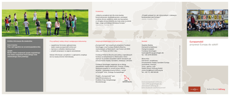 Krótkie informacje dla studentów: Przy aplikacji należy złożyć następujące dokumenty: Czas trwania: Trzy i pół tygodnia we wrześniu/październiku :: wypełniony formularz zgłoszeniowy (patrz www.europamobil-online.eu) :: życiorys w układzie tabelarycznym :: projekt propozycji na zajęcia warsztatowe Języki: Bardzo dobra znajomość języka angielskiego oraz dobra znajomość francuskiego i/lub niemieckiego i/lub polskiego Dalsze informacje o projekcie i o zgloszeniu znajduja sie na naszej stronie internetowej. „Udział w projekcie był dla mnie bardzo konstruktywnym doświadczeniem, ponieważ z jednej strony osobiście wiele się nauczyłam, a z drugiej strony zmieniła się moja wizja na temat tego, czego potrzebuje dzisiejsza Europa.” Appolonia, Francja, 2009 „Projekt pokazał mi, jak różnorodnym i ciekawym kontynentem jest Europa.“ James, Irlandia, 2011 Instytucje wspierające oraz partnerzy Kontakt „Europamobil” jest wspólnym projektem Fundacji Genshagen oraz Fundacji Roberta Boscha, realizowanym w Niemczech i we Francji od 2009 roku, a w Polsce od 2012 roku. Fundacja Roberta Boscha jest jedną z największych fundacji przemysłowych w Niemczech, która zajmuje się przede wszystkim takimi tematami jak porozumienie między narodami, edukacja i zdrowie. Fundacja Genshagen angażuje się w dialog obywatelski między Niemcami, Francją i Polską. Realizuje projekty w ramach pracy dwóch działów: „Upowszechniania kultury i sztuki w Europie” oraz „Dialogu Europejskiego”. Projekt „Europamobil” jest współfinansowany ze środków Kraju Związkowego Brandenburgii. Stephen Bastos Kierownik projektowy Dialog Europejski Fundacja Genshagen [email protected] Tel. +49 3378 805950 Mona Hinz Kierwonik projektowy Porozumienie między narodami Europy Zachodniej, Ameryki, Turcji, Japonii, Indii Robert Bosch Stiftung GmbH [email protected] Tel: +49 711 460 84148 www.europamobil-online.eu www.stiftung-genshagen.de www.bosch-stiftung.de www.facebook.com/Europamobil Dokumentacja zdjęciowa: Fundacja Genshagen, koncepcja i redagowanie: Nina Henke, Fundacja Genshagen Uczestnicy Europamobil przywozi Europę do szkół! Patroni „Dzięki interaktywnemu formatowi projektu Europamobil młodzi ludzie z naszego regionu poszerzą swoją wiedzę o UE, poza tym otrzymają dodatkową zachętę do skorzystania z zalet i możliwości, jakie im ona oferuje.“ Adam Struzik Marszałek Województwa Mazowieckiego us 1 autob entów 20 stud ł 11 szkó uczniów 0 0 0 3 Ponad Z Europą do szkół „Europamobil” to projekt dla uczniów i studentów. 20 studentów z różnych krajów Unii Europejskiej podróżuje autokarem, tzw. „Europamobilem“, do szkół znajdujących się w wybranym i co roku innym regionie Europy, aby przeprowadzić z uczniami warsztaty na różne tematy europejskie. Dzięki projektowi chcemy osiągnąć , by integracja europejska stała się dla młodzieży konkretnym doświadczeniem i wzbudziła w niej zainteresowanie Europą. Poprzez wspólną pracę uczniów i studentów młodzież uczy się lepiej poznawać i rozumieć państwa sąsiednie. W ten sposób zwiększa się zaangażowanie dla Europy i rośnie entuzjazm dla idei europejskiej, dzięki czemu możliwa jest dalsza integracja europejska. Czym wyróżnia się Europamobil? „Europamobil” skierowany jest do młodych ludzi z krajów Unii Europejskiej. Projekt poszerza kompetencje międzykulturowe uczniów i studentów oraz w konkretny sposób prezentuje im Europę. Podczas warsztatów uczestnicy dowiadują się o tym, w jaki sposób Unia Europejska już dziś kształtuje ich codzienność i jakie możliwości oferuje im w przyszłości. Oprócz zdobycia nowej wiedzy uczniowie mają możliwość wykorzystania swojej znajomości języków obcych. Zanim studenci odwiedzą szkoły, przechodzą szkolenie zarówno pod względem merytorycznym, jak i dydaktyczno-metodycznym. W ten sposób zdobywają doświadczenie w prowadzeniu zajęć i w międzynarodowym zarządzaniu projektem. „Europamobil” skierowany jest również do nauczycieli, którzy dzięki temu projektowi mają okazję poznać nowe koncepcje dydaktyczne oraz urozmaicić własne zajęcia o ciekawe, innowacyjne moduły. „Projekt „Europamobil” dzięki swoim wyczerpującym informacjom pokazuje w przejrzysty sposób, jakie możliwości otwiera Unia Europejska przed młodymi ludźmi w odniesieniu do mobilności i generalnie dla ich zawodowego i osobistego rozwoju.“ Matthias Platzeck Premier Kraju Związkowego Brandenburgii Program Europamobilu :: We wrześniu/październiku studenci podróżują przez trzy i pół tygodnia po wybranym i co roku innym regionie Europy. :: Tygodniowe seminarium przygotowuje studentów do pracy z uczniami. Pod okiem doświadczonych pod względem pedagogicznym szkoleniowców opracowują materiały dydaktyczne i przygotowują cztery warsztaty. :: W ciągu dwóch tygodni studenci za pomocą „Europamobilu” odwiedzają codziennie jedną szkołę w danym regionie. Podczas spotkania inauguracyjnego prezentują projekt uczniom, a następnie tworzą wraz z nimi dwugodzinne warsztaty. Informacje dla uczniów w skrócie: :: Temat warsztatów związany jest zawsze z aktualnie poruszanymi sprawami europejskimi. W centrum zainteresowania znajdują się zawsze następujące pytania: :: Co Europa ma ze mną wspólnego? :: Jakie szanse powstają dla mnie dzięki Europie? :: Jaki mogę mieć czynny wkład w kształtowanie Europy? :: Jako uzupełnienie warsztatów, stowarzyszenia oraz instytucje aktywne na płaszczyźnie europejskiej informują uczniów podczas targów informacyjnych o tym, w jaki sposób mogą stać się mobilni w Europie. :: Projekt kończy się spotkaniem z przedstawicielami inicjatyw społecznych oraz świata polityki. W centrum uwagi znajdują się przy tym tematy europejskie, które w praktyczny i przekonywujący sposób przybliżają uczniom oraz studentom ideę europejską. Czas trwania: 1 dzień we 