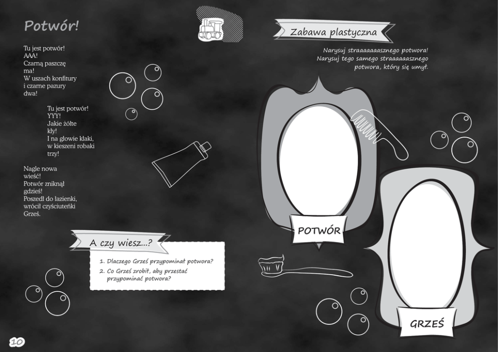 Potwór! Zabawa plastyczna Tu jest potwór! AAA! Czarną paszczę ma! W uszach konfitury i czarne pazury dwa! Narysuj straaaaaaasznego potwora! Narysuj tego samego straaaaaasznego potwora, który się umył. Tu jest potwór! YYY! Jakie żółte kły! I na głowie kłaki, w kieszeni robaki trzy! Nagle nowa wieść! Potwór zniknął gdzieś! Poszedł do łazienki, wrócił czyściuteńki Grześ. 1. Dlaczego Grześ przypominał potwora? 2. Co Grześ zrobił, aby przestać przypominać potwora? 10