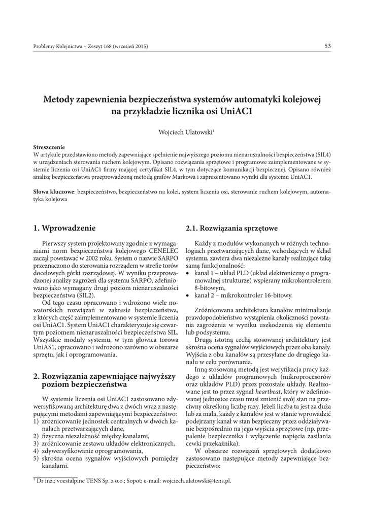 53 Problemy Kolejnictwa – Zeszyt 168 (wrzesień 2015) Metody zapewnienia bezpieczeństwa systemów automatyki kolejowej na przykładzie licznika osi UniAC1 Wojciech Ulatowski1 Streszczenie W artykule przedstawiono metody zapewniające spełnienie najwyższego poziomu nienaruszalności bezpieczeństwa (SIL4) w urządzeniach sterowania ruchem kolejowym. Opisano rozwiązania sprzętowe i programowe zaimplementowane w systemie liczenia osi UniAC1 firmy mającej certyfikat SIL4, w tym dotyczące komunikacji bezpiecznej. Opisano również analizę bezpieczeństwa przeprowadzoną metodą grafów Markowa i zaprezentowano wyniki dla systemu UniAC1. Słowa kluczowe: bezpieczeństwo, bezpieczeństwo na kolei, system liczenia osi, sterowanie ruchem kolejowym, automatyka kolejowa 1. Wprowadzenie 2.1. Rozwiązania sprzętowe Pierwszy system projektowany zgodnie z wymaganiami norm bezpieczeństwa kolejowego CENELEC zaczął powstawać w 2002 roku. System o nazwie SARPO przeznaczono do sterowania rozrządem w strefie torów docelowych górki rozrządowej. W wyniku przeprowadzonej analizy zagrożeń dla systemu SARPO, zdefiniowano jako wymagany drugi poziom nienaruszalności bezpieczeństwa (SIL2). Od tego czasu opracowano i wdrożono wiele nowatorskich rozwiązań w zakresie bezpieczeństwa, z których część zaimplementowano w systemie liczenia osi UniAC1. System UniAC1 charakteryzuje się czwartym poziomem nienaruszalności bezpieczeństwa SIL. Wszystkie moduły systemu, w tym głowica torowa UniAS1, opracowano i wdrożono zarówno w obszarze sprzętu, jak i oprogramowania. Każdy z modułów wykonanych w różnych technologiach przetwarzających dane, wchodzących w skład systemu, zawiera dwa niezależne kanały realizujące taką samą funkcjonalność: • kanał 1 – układ PLD (układ elektroniczny o programowalnej strukturze) wspierany mikrokontrolerem 8-bitowym, • kanał 2 – mikrokontroler 16-bitowy. 2. Rozwiązania zapewniające najwyższy poziom bezpieczeństwa W systemie liczenia osi UniAC1 zastosowano zdywersyfikowaną architekturę dwa z dwóch wraz z następującymi metodami zapewniającymi bezpieczeństwo: 1) zróżnicowanie jednostek centralnych w dwóch kanałach przetwarzających dane, 2) fizyczna niezależność między kanałami, 3) zróżnicowanie zestawu układów elektronicznych, 4) zdywersyfikowanie oprogramowania, 5) skrośna ocena sygnałów wyjściowych pomiędzy kanałami. 1 Zróżnicowana architektura kanałów minimalizuje prawdopodobieństwo wystąpienia okoliczności powstania zagrożenia w wyniku uszkodzenia się elementu lub podsystemu. Drugą istotną cechą stosowanej architektury jest skrośna ocena sygnałów wyjściowych przez oba kanały. Wyjścia z obu kanałów są przesyłane do drugiego kanału w celu porównania. Inną stosowaną metodą jest weryfikacja pracy każdego z układów programowych (mikroprocesorów oraz układów PLD) przez pozostałe układy. Realizowane jest to przez sygnał heartbeat, który w zdefiniowanej jednostce czasu musi zmienić swój stan na przeciwny określoną liczbę razy. Jeżeli liczba ta jest za duża lub za mała, każdy z kanałów jest w stanie wprowadzić podejrzany kanał w stan bezpieczny przez oddziaływanie bezpośrednio na jego wyjścia sprzętowe (np. przepalenie bezpiecznika i wyłączenie napięcia zasilania cewki przekaźnika). W obszarze rozwiązań sprzętowych dodatkowo zastosowano następujące metody zapewniające bezpieczeństwo: Dr inż.; voestalpine TENS Sp. z o.o.; Sopot; e-mail: [email protected]. 54 Ulatowski W. 1) separacja kanałów, 2) separowane zasilacze dla każdego z kanałów, 3) brak powiązań funkcjonalnych, które umożliwią jednemu kanałowi zmianę stanu drugiego, 4) porównywanie konfiguracji swojego kanału oraz kanału drugiego. Podsumowując, w celu zapewnienia czwartego poziomu nienaruszalności bezpieczeństwa w systemie UniAC1, zastosowano podwójne struktury elektroniczne ze złożonym fail-safety z bezpieczną komparacją. Oznacza to, że działają one na zasadzie „bezpieczny w razie uszkodzenia”. Skutki usterek fizycznych oraz defekty w oprogramowaniu lub zakłócenia rozprzestrzeniają się na wyjście, a każda rozbieżność między wyjściami dwóch kanałów jest wykryta w wyniku porównania skrośnego. Na wyjściach będzie ustawiony stan bezpieczny. 2.2. Rozwiązania programowe Urządzenia oraz systemy sterowania ruchem kolejowym przetwarzają informacje dwukanałowo. Do ich poprawnej pracy potrzebna jest prawidłowa i zgodna w czasie praca obu kanałów. Stosowanie w obu kanałach różnych technologii przetwarzania danych wymusza użycie różnych narzędzi programowych do opracowania oprogramowania aplikacyjnego. Takie rozwiązanie zmniejsza prawdopodobieństwo wystąpienia błędów systematycznych, ponieważ zarówno na etapie projektowania, jak i kompilacji lub wgrywania programu do pamięci układu są stosowane inne narzędzia. Błąd narzędzia oraz błąd mogący ujawnić się w jednej technologii nie przenosi się na drugi kanał. Stosowanie dwóch takich samych technologii (np. mikroprocesorów), nawet od różnych producentów, nie zapewnia takiej pewności zabezpieczenia przed błędami systematycznymi. Oprócz różnorodnych technologii, drugą metodą zapewaniającą najwyższy poziom bezpieczeństwa jest odpowiednia wymiana informacji pomiędzy kanałami. W systemie UniAC1 zastosowano wymianę: • sygnałów „życia” heartbeat – kontrola działania pętli głównej, • sygnałów wyjściowych będących skutkiem przetwarzania informacji w każdym z kanałów. Cykliczne odczytywanie wyjść drugiego kanału i porównywanie ich z aktualnym stanem swoich wyjść, pozwala zminimalizować prawdopodobieństwo błędnego zadziałania jednego z kanałów. W przypadku negatywnego wyniku porównania (niezgodności) zostaje wygenerowana informacja o błędzie i system przechodzi w stan bezpieczny. W obszarze rozwiązań programowych zastosowan