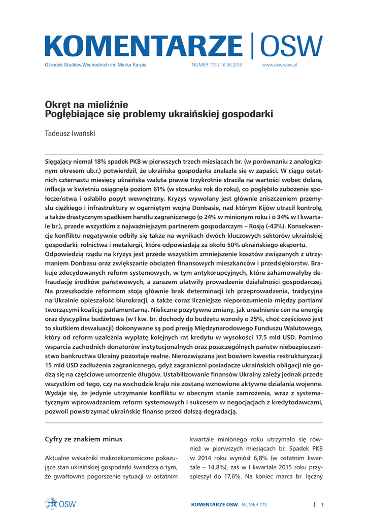 Ośrodek Studiów Wschodnich im. Marka Karpia NUMER 173 | 16.06.2015 www.osw.waw.pl Okręt na mieliźnie Pogłębiające się problemy ukraińskiej gospodarki Tadeusz Iwański Sięgający niemal 18% spadek PKB w pierwszych trzech miesiącach br. (w porównaniu z analogicznym okresem ub.r.) potwierdził, że ukraińska gospodarka znalazła się w zapaści. W ciągu ostatnich czternastu miesięcy ukraińska waluta prawie trzykrotnie straciła na wartości wobec dolara, inflacja w kwietniu osiągnęła poziom 61% (w stosunku rok do roku), co pogłębiło zubożenie społeczeństwa i osłabiło popyt wewnętrzny. Kryzys wywołany jest głównie zniszczeniem przemysłu ciężkiego i infrastruktury w ogarniętym wojną Donbasie, nad którym Kijów utracił kontrolę, a także drastycznym spadkiem handlu zagranicznego (o 24% w minionym roku i o 34% w I kwartale br.), przede wszystkim z najważniejszym partnerem gospodarczym – Rosją (-43%). Konsekwencje konfliktu negatywnie odbiły się także na wynikach dwóch kluczowych sektorów ukraińskiej gospodarki: rolnictwa i metalurgii, które odpowiadają za około 50% ukraińskiego eksportu. Odpowiedzią rządu na kryzys jest przede wszystkim zmniejszenie kosztów związanych z utrzymaniem Donbasu oraz zwiększanie obciążeń finansowych mieszkańców i przedsiębiorstw. Brakuje zdecydowanych reform systemowych, w tym antykorupcyjnych, które zahamowałyby defraudację środków państwowych, a zarazem ułatwiły prowadzenie działalności gospodarczej. Na przeszkodzie reformom stoją głównie brak determinacji ich przeprowadzenia, tradycyjna na Ukrainie opieszałość biurokracji, a także coraz liczniejsze nieporozumienia między partiami tworzącymi koalicję parlamentarną. Nieliczne pozytywne zmiany, jak urealnienie cen na energię oraz dyscyplina budżetowa (w I kw. br. dochody do budżetu wzrosły o 25%, choć częściowo jest to skutkiem dewaluacji) dokonywane są pod presją Międzynarodowego Funduszu Walutowego, który od reform uzależnia wypłatę kolejnych rat kredytu w wysokości 17,5 mld USD. Pomimo wsparcia zachodnich donatorów instytucjonalnych oraz poszczególnych państw niebezpieczeństwo bankructwa Ukrainy pozostaje realne. Nierozwiązana jest bowiem kwestia restrukturyzacji 15 mld USD zadłużenia zagranicznego, gdyż zagraniczni posiadacze ukraińskich obligacji nie godzą się na częściowe umorzenie długów. Ustabilizowanie finansów Ukrainy zależy jednak przede wszystkim od tego, czy na wschodzie kraju nie zostaną wznowione aktywne działania wojenne. Wydaje się, że jedynie utrzymanie konfliktu w obecnym stanie zamrożenia, wraz z systematycznym wprowadzaniem reform systemowych i sukcesem w negocjacjach z kredytodawcami, pozwoli powstrzymać ukraińskie finanse przed dalszą degradacją. Cyfry ze znakiem minus Aktualne wskaźniki makroekonomiczne pokazujące stan ukraińskiej gospodarki świadczą o tym, że gwałtowne pogorszenie sytuacji w ostatnim kwartale minionego roku utrzymało się również w pierwszych miesiącach br. Spadek PKB w 2014 roku wyniósł 6,8% (w ostatnim kwartale – 14,8%), zaś w I kwartale 2015 roku przyspieszył do 17,6%. Na koniec marca br. łączny KOMENTARZE OSW NUMER 173 1 dług publiczny sięgnął niemal 95% PKB (ponad 1,5 biliona hrywien, tj. ponad 61 mld USD), a inflacja wyniosła 25%, w kwietniu zaś wzrosła do 61% (w porównaniu z kwietniem 2014 roku). Z powodu wojny w Donbasie – najbardziej zindustrializowanym regionie Ukrainy – oraz utraty Krymu spadek produkcji przemysłowej Ukrainy w 2014 roku wyniósł prawie 11%. W I kwartale br., w porównaniu z okresem trzech pierwszych miesięcy ubiegłego roku, wyniósł zaś 21,4%, na co największy wpływ miał poziom produkcji w obwodzie donieckim i ługańskim, który w tym okresie pokazywał dalszy spadek, odpowiednio o 52,5% i 88%. Dodatkowo, poważnym problemem na Ukrainie pozostaje znaczny spadek wartości hrywny – od początku lutego 2014 roku do końca lutego br. ukraińska waluta osłabła wobec amerykańskiego dolara z 8 do 30 hrywien za 1 USD, a w następnych miesiącach nieznacznie wzrosła, a kurs ustabilizował się na poziomie około 21 hrywien. Spadek ukraińskiego PKB w ostatnim kwartale 2014 roku wyniósł 14,8%, w pierwszym kwartale 2015 roku przyspieszył do 17,6%. Deprecjacja waluty jest jedną z przyczyn poważnego kryzysu ukraińskiego sektora bankowego. Zakończone w listopadzie ub.r. stress testy 35 największych ukraińskich banków pokazały, że sektor ten jest w głębokim kryzysie. Potwierdzeniem tej diagnozy było uznanie przez regulatora za niewypłacalne 33 banków w minionym roku i kolejnych 25 – w I kwartale br. (w tym Delta Bank wchodzący do pierwszej piątki największych ukraińskich banków). Obserwowane od połowy marca wzmocnienie hrywny (do 21–22 hrywny za 1 USD w drugiej połowie maja) było możliwe m.in. dzięki radykalnym działaniom administracyjnym Narodowego Banku Ukrainy1 oraz udzieleniu wsparcia finansowego T. Iwański, Władze ratują hrywnę, Analizy OSW, 4.05.2015. 1 przez Międzynarodowy Fundusz Walutowy2. Zgodnie z prognozami Narodowego Banku Ukrainy, spadek PKB w całym br. wyniesie 7,5%3, wzrost ma się rozpocząć od IV kwartału, a w 2016 roku osiągnąć poziom 3%. MFW zakłada recesję w br. na poziomie 9% 4. Spadek nie będzie większy jedynie w przypadku wdrażania reform i utrzymania się rozejmu na wschodzie kraju, natomiast ewentualna ponowna eskalacja konfliktu będzie skutkować dalszym pogarszaniem się sytuacji gospodarczej Ukrainy. Nowe kredyty i niepewna restrukturyzacja starych Od bankructwa ratują Ukrainę zachodnie instytucje finansowe. Zgodnie z wyliczeniami instytutu Case-Ukraine od maja 2014 roku do maja 2015 roku MFW, UE, Bank Światowy, USA oraz rządy Kanady i Japonii udzieliły Ukrainie łącznie 14,2 mld USD5 pomocy. Jednak to współpraca z MFW ma fundamentalne znaczenie dla kruchej stabilności ukraińskiej gospodarki. 11 marca Rada 