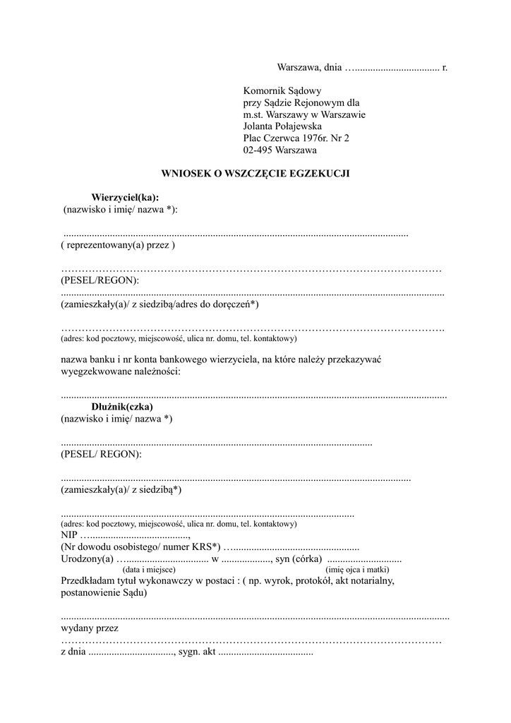 Warszawa, dnia …................................. r. Komornik Sądowy przy Sądzie Rejonowym dla m.st. Warszawy w Warszawie Jolanta Połajewska Plac Czerwca 1976r. Nr 2 02-495 Warszawa WNIOSEK O WSZCZĘCIE EGZEKUCJI Wierzyciel(ka): (nazwisko i imię/ nazwa *): ...................................................................................................................................... ( reprezentowany(a) przez ) ………………………………………………………………………………………………… (PESEL/REGON): ..................................................................................................................................................... (zamieszkały(a)/ z siedzibą/adres do doręczeń*) …………………………………………………………………………………………………. (adres: kod pocztowy, miejscowość, ulica nr. domu, tel. kontaktowy) nazwa banku i nr konta bankowego wierzyciela, na które należy przekazywać wyegzekwowane należności: ...................................................................................................................................................... Dłużnik(czka) (nazwisko i imię/ nazwa *) ......................................................................................................................... (PESEL/ REGON): ........................................................................................................................................ (zamieszkały(a)/ z siedzibą*) .................................................................................................................. (adres: kod pocztowy, miejscowość, ulica nr. domu, tel. kontaktowy) NIP …......................................, (Nr dowodu osobistego/ numer KRS*) …................................................. Urodzony(a) …................................ w ..................., syn (córka) ............................. (data i miejsce) (imię ojca i matki) Przedkładam tytuł wykonawczy w postaci : ( np. wyrok, protokół, akt notarialny, postanowienie Sądu) ....................................................................................................................................................... wydany przez ………………………………………………………………………………………………… z dnia ................................., sygn. akt ..................................... Wnoszę o wszczęcie egzekucji przeciwko dłużnikowi(czce) w celu wyegzekwowania: 1. Należności głównej............................................................... zł, 2. z zasądzonymi odsetkami w wysokości (według tytułu wykonawczego) od dnia …......…………………………………………………….do dnia zapłaty, 3. kosztów procesu..........................................................................zł, 4. kosztów klauzuli...........................................................................zł, 5. inne koszty..................................................................................zł, ( należy wpisać jakie oraz wysokość ) 6. kosztów egzekucyjnych, które powstaną w toku egzekucji Egzekucję należy skierować do: - ruchomości ( wg ustaleń komornika w ramach zlecenia poszukiwania majątku zgodnie z art. 797 z indeksem 1 k.p.c. /w postaci*): ……………………………………………………………………………….............................. -wierzytelności, ( wg ustaleń komornika w ramach zlecenia poszukiwania majątku zgodnie z art. 797 z indeksem 1 k.p.c. /w postaci*): ………………………………………………………………………………............................... ................................................. - wierzytelności z rachunku bankowego ( wg ustaleń komornika w ramach zlecenia poszukiwania majątku zgodnie z art. 797 z indeksem 1 k.p.c.*/ w banku, nr rachunku bankowego ) w Banku : ………………………………………………………………………………………………… …………………………………………. nr rachunku …............................................................................................................................................ Wynagrodzenia za pracę ( wg ustaleń komornika w ramach zlecenia poszukiwania majątku zgodnie z art. 797 z indeksem 1 k.p.c.*/ nazwa i adres pracodawcy ) (nazwa i adres pracodawcy) …................................................................................................................. - nieruchomości położonej ( adres nieruchomości ) ……………………………………………………………………………… (rodzaj prawa rzeczowego oraz udział *) ……………………(numer księgi wieczystej* ) ……………………………… Inne dane dotyczące dłużnika: …............................................................................................................... …............................................................................................................... Wybór komornika dokonany został w oparciu o art. 8 ustawy o komornikach sądowych i egzekucji. Niniejszym zlecam Komornikowi poszukiwanie majątku dłużnika w trybie art. 797(1) kpc*. ………………………….. (podpis wierzyciela) *niewłaściwe skreślić Załączniki: -