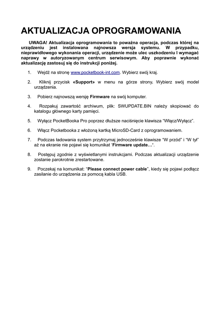 AKTUALIZACJA OPROGRAMOWANIA UWAGA! Aktualizacja oprogramowania to poważna operacja, podczas której na urządzeniu jest instalowana najnowsza wersja systemu. W przypadku, nieprawidłowego wykonania operacji, urządzenie może ulec uszkodzeniu I wymagać naprawy w autoryzowanym centrum serwisowym. Aby poprawnie wykonać aktualizację zastosuj się do instrukcji poniżej. 1. 2. 3. Wejdź na stronę www.pocketbook-int.com. Wybierz swój kraj. Kliknij przycisk «Support» w menu na górze strony. Wybierz swój model urządzenia. Pobierz najnowszą wersję Firmware na swój komputer. 4. Rozpakuj zawartość archiwum, plik: SWUPDATE.BIN należy skopiować do katalogu głównego karty pamięci. 5. Wyłącz PocketBooka Pro poprzez dłuższe naciśnięcie klawisza “Włącz/Wyłącz”. 6. Włącz Pocketbooka z włożoną kartką MicroSD-Card z oprogramowaniem. 7. Podczas ładowania system przytrzymaj jednocześnie klawisze “W przód” i “W tył” aż na ekranie nie pojawi się komunikat ‘Firmware update…’. 8. Postępuj zgodnie z wyświetlanymi instrukcjami. Podczas aktualizacji urządzenie zostanie parokrotnie zrestartowane. 9. Poczekaj na komunikat: “Please connect power cable”, kiedy się pojawi podłącz zasilanie do urządzenia za pomocą kabla USB.