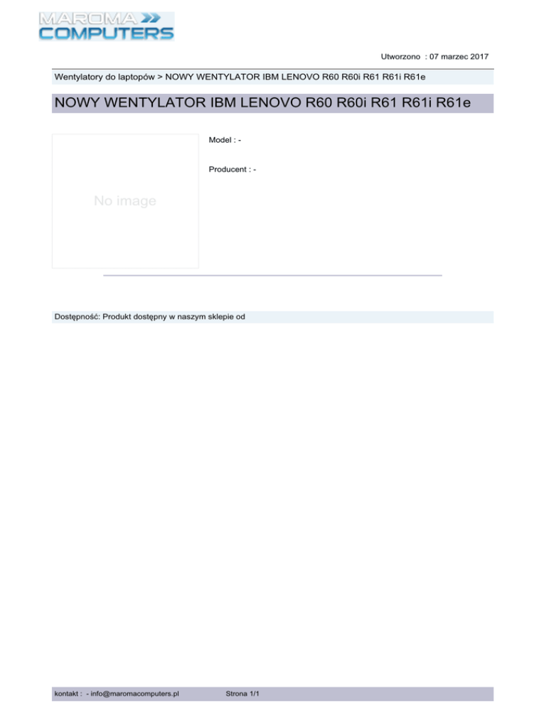 Utworzono : 07 marzec 2017 Wentylatory do laptopów > NOWY WENTYLATOR IBM LENOVO R60 R60i R61 R61i R61e NOWY WENTYLATOR IBM LENOVO R60 R60i R61 R61i R61e Model : - s r te Producent : - No image C a Dostępność: Produkt dostępny w naszym sklepie od m ro a M kontakt : - [email protected] Strona 1/1 m o u p