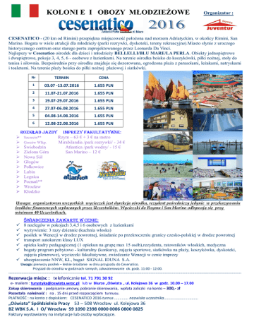 KOLONI E I OBOZY MŁODZIEŻOWE Organizator : CESENATICO - (20 km od Rimini) przepiękna miejscowość położona nad morzem Adriatyckim, w okolicy Rimini, San Marino. Bogata w wiele atrakcji dla młodzieży (parki rozrywki, dyskoteki, tereny rekreacyjne).Miasto słynie z uroczego historycznego centrum oraz starego portu zaprojektowanego przez Leonarda Da Vinci. Najlepszy w Cesenatico ośrodek dla dzieci i młodzieży BELLELLI/BLU MARE/LA PERLA. Obiekty jednopiętrowe i dwupiętrowe, pokoje 3, 4, 5, 6 - osobowe z łazienkami. Na terenie ośrodka boisko do koszykówki, piłki nożnej, stoły do tenisa i siłownia. Bezpośrednio przy ośrodku znajduje się dozorowana, ogrodzona plaża z parasolami, leżakami, natryskami i toaletami. Na terenie plaży boiska do piłki nożnej plażowej i siatkówki. Nr TERMIN CENA 1 03.07 -13.07.2016 1.655 PLN 2 11.07-21.07.2016 1.655 PLN 3 19.07-29.07.2016 1.655 PLN 4 27.07-06.08.2016 1.655 PLN 5 04.08-14.08.2016 1.655 PLN 6 12.08-22.08.2016 1.655 PLN ROZKŁAD JAZDY Szczecin** Gorzów Wlkp. Świebodzin Zielona Góra Nowa Sól Głogów Polkowice Lubin Legnica Poznań** Wrocław Kłodzko IMPREZY FAKULTATYWNE: Rzym – 63 € + 3 € na metro Mirabilandia /park rozrywki/ - 34 € Atlantica /park wodny/ - 15 € San Marino – 12 € Uwaga: organizatorem wszystkich wycieczek jest dyrekcja ośrodka, rezydent pośredniczy jedynie w przekazywaniu środków finansowych wpłacanych przez Uczestników. Wycieczki do Rzymu i San Marino odbywają się przy minimum 40 Uczestnikach. ŚWIADCZENIA ZAWARTE W CENIE: 8 noclegów w pokojach 3,4,5 i 6 osobowych z łazienkami wyżywienie: 3 razy dziennie (kuchnia włoska) posiłek w Wenecji w drodze powrotnej, śniadanie po przekroczeniu granicy czesko-polskiej w drodze powrotnej transport autokarem klasy LUX opieka kadry pedagogicznej (1 opiekun na grupę max 15 osób),rezydenta, ratowników włoskich, medyczna bogaty program pobytowo - kulturalny (konkursy, zajęcia sportowe, siatkówka na plaży, koszykówka, dyskoteki, zajęcia plenerowe), wycieczki fakultatywne, zwiedzanie Wenecji w cenie imprezy ubezpieczenie NNW, KL, bagaż SIGNAL IDUNA S.A. Uwaga: pierwszy posiłek – lekkie śniadanie w dniu przyjazdu do Cesenatico. Przyjazd do ośrodka w godzinach rannych, zakwaterowanie ok. godz. 11:00 - 12:00. ------------------------------------------------------------------------------------------------------------------------------------------------------------------------------------------------------ Rezerwacja miejsc : telefonicznie tel. 71 791 30 92 e- mailem : [email protected] lub w Biurze „Oświata „ ul. Kolejowa 36 w godz. 10.00 – 17.00 Zakup skierowania : podpisanie umowy, pobranie skierowania, wpłata zaliczki na konto – 300,- zł Pozostała należność : na . 15 dni przed rozpoczęciem turnusu. PŁATNOŚĆ : na konto z dopiskiem: CESENATICO 2016 turnus ............. nazwiska uczestnika................................ „Oświata” Spółdzielnia Pracy 53 – 508 Wrocław ul. Kolejowa 36 BZ WBK S.A. I O/ Wrocław 59 1090 2398 0000 0006 0800 0825 Faktury wystawiamy na instytucje lub osoby wpłacające.