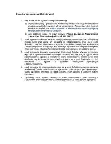 Procedura zgłaszania awarii lub interwencji 1. Mieszkaniec winien zgłaszać awarię lub interwencję: a) w godzinach pracy - pracownikowi Administracji Osiedla lub Sekcji Konserwatorów właściwemu pod kątem swojego adresu zamieszkania. Zgłoszenia można dokonać osobiście lub telefonicznie – wykaz adresów i nr telefonów kontaktowych znajduje się na naszej stronie internetowej Spółdzielni. b) poza godzinami pracy- na dyżur awaryjny Pilskiej Spółdzielni Mieszkaniowej Lokatorsko – Własnościowej w Pile, tel. 605 038 772: 2. Jeżeli zgłoszenia dokonano na dyżur awaryjny wówczas pracownicy dyżuru zabezpieczą miejsce awarii oraz ustalą, czy konieczne do przeprowadzenia prace są w gestii Spółdzielni, czy też mieszkańca – zgodnie z podziałem obowiązków wynikających z zapisów regulaminu. Następnego dnia roboczego zgłoszenie zostanie przekazane przez dyżur awaryjny do właściwej Administracji Osiedla celem dalszego prowadzenia sprawy. 3. Jeżeli zgłoszenia dokonano pracownikowi Administracji Osiedla, wówczas przyjmujący rejestruje to zgłoszenie we właściwym rejestrze i ustala wspólnie ze zgłaszającym termin przeprowadzenia oględzin w mieszkaniu celem zabezpieczenia miejsca awarii oraz określenia, czy konieczne do przeprowadzenia prace są w gestii Spółdzielni, czy też mieszkańca – zgodnie z podziałem obowiązków wynikających z zapisów regulaminu. 4. Jeżeli konieczne do przeprowadzenia prace są w gestii Spółdzielni wówczas pracownik Administracji Osiedla ustali termin ich wykonania i poinformuje o tym zgłaszającego. Służby Spółdzielni przystąpią do robót usuwania awarii zgodnie z ustalonym trybem i terminem. 5. Zgłaszający może uzyskać informacje o stanie zaawansowania robót związanych z usuwaniem awarii bezpośrednio w Administracji Osiedla , w której dokonał zgłoszenia.