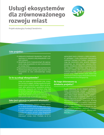 Usługi ekosystemów dla zrównoważonego rozwoju miast Projekt edukacyjny Fundacji Sendzimira Cele projektu: d zwiększenie świadomości decydentów i innych interesariuszy nt. znaczenia usług ekosystemów w polskich miastach; d identyfikacja barier instytucjonalnych dla wykorzystania usług ekosystemów na rzecz zrównoważonego rozwoju miast; d wypracowanie metod radzenia sobie z tymi barierami; d popularyzacja dobrych praktyk wykorzystania usług ekosystemów na rzecz zrównoważonego rozwoju miast. Co to są usługi ekosystemów? Usługi lub świadczenia ekosystemów (ang. ecosystem services) to pojęcie, którego popularność gwałtownie rośnie w ostatnich latach. Odnosi się do korzyści, jakie społeczeństwo i gospodarka czerpią ze środowiska. Środowisko jako dostawca usług staje się bardziej oczywistym partnerem dla decydentów na różnych poziomach, w tym na poziomie lokalnym. Dzięki takiej zmianie postrzegania środowiska, bardziej wyraźna staje się potrzeba jego ochrony. Jaka jest sytuacja w polskich miastach? Problemy ekosystemów miejskich w Polsce pokazują, że władze polskich miast nie zdają sobie sprawy z wartości dostarczanych przez te ekosystemy usług. W krajach rozwiniętych coraz bardziej powszechną praktyką jest wycena wartości usług ekosystemów miejskich i uwzględnianie jej wyników w decyzjach dotyczących rozwoju miast. Przekłada się to na wyższą jakość życia w miastach, a także oszczędności wynikające z braku konieczności dokonywania niektórych inwestycji (ich funkcje z powodzeniem mogą być dostarczane przez sprawnie działające ekosystemy), np. retencja wody i poprawa mikroklimatu, zmniejszone nakłady na oczyszczanie ścieków związane z zatrzymaniem wody na terenach zielonych w mieście, cień i ochrona przed wiatrem, możliwość rekreacji, poprawa samopoczucia i efektywności pracy, dzięki istnieniu pasów zieleni brak konieczności budowy drogiej infrastruktury chroniącej przed hałasem komunikacyjnym itp. Do kogo skierowane są działania projektu? Projekt skierowany jest do młodych „profesjonalistów zrównoważonego rozwoju” – absolwentów i studentów ostatnich lat studiów, młodych pracowników, którzy dzięki zdobytej wiedzy i umiejętnościom będą w stanie uwzględniać usługi ekosystemów w swojej pracy na rzecz zrównoważonego rozwoju lokalnego oraz biznesu. Druga grupa, do której skierowany jest projekt, to urzędnicy i osoby podejmujące decyzje dotyczące usług ekosystemów w miastach lub mające inny wpływ na te decyzje (np. jako interesariusze korzystający z możliwości uczestnictwa w procesach partycypacyjnych, odbiorcy publikacji itp.). Jakie działania realizujemy, by zmienić tę niekorzystną sytuację? Projekt składa się z szeregu wzajemnie powiązanych działań edukacyjnych, badawczych i praktycznych. Wiedza potrzebna do przygotowania projektu Badania Partnerzy merytoryczni Podstawy Patroni merytoryczni E-learning 1: Wprowadzenie do ZR E-learning 2: Praktyka ZR Bariery dla zachowania drzew w miastach i sposoby pokonywania tych barier Zadania praktyczne związane z tematem projektu Międzynarodowe seminarium naukowe nt. wartości usług ekosystemów w mieście Wycena drzew przyulicznych w centrum Łodzi Wywiady z ekspertami Dobre praktyki Generowanie innowacji Poradnik „Przyroda w mieście. Usługi ekosystemów – niewykorzystany potencjał miast” Mapa projektu przedstawia powiązania między głównymi działaniami projektu. Projekt budowany jest od „podstaw”, które polegają na zdobywaniu i porządkowaniu wiedzy z zakresu zrównoważonego rozwoju oraz usług ekosystemów w miastach. Źródłami wiedzy są prowadzone w ramach projektu badania, literatura przedmiotu, dyskusje ze światowymi autorytetami z tego obszaru, a także wiedza przekazywana przez partnerów projektu. Z praktycznego punktu widzenia najbardziej istotnymi elementami projektu są „procesy”, obejmujące generowanie innowacji, mających zwiększyć stopień świadomego i zrównoważonego wykorzystania usług ekosystemów w polskich miastach oraz propagowanie tych innowacji. Służą temu „produkty” w postaci raportu dla współpracujących z Fundacją Sendzimira władz miasta Łodzi oraz dwóch poradników prezentujących zagadnienia usług ekosystemów w miastach i ich wartości. Propagowanie innowacji Raport dla miasta Warsztat edukacyjno-partycypacyjny nt. usług ekosystemów w Łodzi Produkty Procesy Patroni medialni Polskie tłumaczenie przewodnika TEEB Dwie edycje Akademii Letniej „Wyzwania zrównoważonego rozwoju w Polsce” 01 Dwuetapowe kursy e-learningowe (wprowadzające tematykę zrównoważonego rozwoju i usług ekosystemów) oraz stacjonarna trzytygodniowa akademia letnia, oferująca praktyczne doświadczenie we wdrażaniu zasad zrównoważonego rozwoju na poziomie miasta oraz firm i organizacji. Działania te, dzięki udziałowi uczestników w prowadzeniu badań i analiz, stanowią wkład do procesu generowania innowacji. Efektem akademii jest raport dla władz przykładowego miasta, zawierający główne wskazówki dotyczące zrównoważonego wykorzystania usług ekosystemów. Rekrutacja do udziału w kolejnym cyklu szkoleniowym, który odbędzie się w Trójmieście rozpocznie się w lutym 2012 roku. http://www.sendzimir.org.pl/kurs Badanie dot. barier instytucjonalnych dla zachowania drzew w miastach i sposobów pokonywania tych barier Publikacja poradnika „Przyroda w mieście. Usługi ekosystemów – niewykorzystany potencjał miast” 02 05 Badanie to odwołuje się do zmniejszającej się ilości drzew przyulicznych w obszarach centralnych dużych miast w Polsce i związanego z tym wzrostu kosztów społecznych i ekonomicznych. Celem badania jest identyfikacja instytucjonalnych barier dla zachowania drzew w obszarach centralnych dużych miast w Polsce oraz sposobów usuwania tych barier. Wyniki i wnioski z badania dostępne będą na stronie internetowej projekt