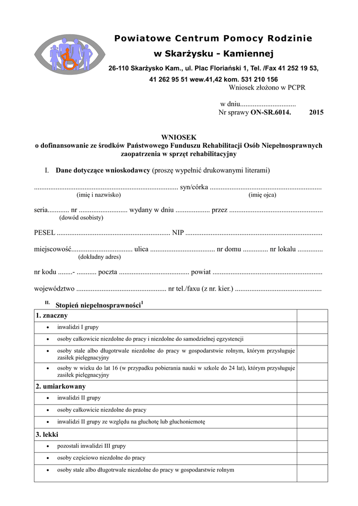 Powiatowe Centrum Pomocy Rodzinie w Skarżysku - Kamiennej 26-110 Skarżysko Kam., ul. Plac Floriański 1, Tel. /Fax 41 252 19 53, 41 262 95 51 wew.41,42 kom. 531 210 156 www.pcprskarzysko.pl Wniosek złożono w PCPR email: [email protected] w dniu............................... Nr sprawy ON-SR.6014. 2015 WNIOSEK o dofinansowanie ze środków Państwowego Funduszu Rehabilitacji Osób Niepełnosprawnych zaopatrzenia w sprzęt rehabilitacyjny I. Dane dotyczące wnioskodawcy (proszę wypełnić drukowanymi literami) ................................................................................ syn/córka .............................................................. (imię i nazwisko) (imię ojca) seria............ nr ........................... wydany w dniu ................... przez .................................................... (dowód osobisty) PESEL ............................................................... NIP ............................................................................ miejscowość.................................. ulica .................................... nr domu .............. nr lokalu .............. (dokładny adres) nr kodu ........- ........... poczta ....................................... powiat ............................................................. województwo .................................................. nr tel./faxu (z nr. kier.) ................................................ II. Stopień niepełnosprawności1 1. znaczny inwalidzi I grupy osoby całkowicie niezdolne do pracy i niezdolne do samodzielnej egzystencji osoby stale albo długotrwale niezdolne do pracy w gospodarstwie rolnym, którym przysługuje zasiłek pielęgnacyjny osoby w wieku do lat 16 (w przypadku pobierania nauki w szkole do 24 lat), którym przysługuje zasiłek pielęgnacyjny 2. umiarkowany inwalidzi II grupy osoby całkowicie niezdolne do pracy inwalidzi II grupy ze względu na głuchotę lub głuchoniemotę 3. lekki pozostali inwalidzi III grupy osoby częściowo niezdolne do pracy osoby stale albo długotrwale niezdolne do pracy w gospodarstwie rolnym III. Rodzaj niepełnosprawności1 1. dysfunkcja narządu ruchu z koniecznością poruszania się na wózku inwalidzkim; wrodzony brak albo amputacja kończyn dolnych lub górnych 2. inna dysfunkcja narządu ruchu 3. dysfunkcja narządu wzroku 4. dysfunkcja narządów słuchu i mowy 5. deficyt rozwojowy (upośledzenie umysłowe) 6. niepełnosprawność z ogólnego stanu zdrowia IV. Sytuacja zawodowa1 1. zatrudniony*/prowadzący działalność gospodarczą* 2. osoba w wieku od lat 18 do 24, ucząca się w systemie dziennym lub studjująca 3. bezrobotny poszukujący pracy*/rencista poszukujący pracy 4. rencista*/emeryt* nie zainteresowany podjęciem pracy 5. dzieci i młodzież do lat 18 V. Sytuacja mieszkaniowa – zamieszkuje1 1. samotnie 2. z rodziną 3. z osobami niespokrewnionymi VI. Osoby pozostające we wspólnym gospodarstwie domowym z Wnioskodawcą (w tym osoby niepełnosprawne) Imię i nazwisko - pokrewieństwo niepełnosprawność stopień Średni miesięczny dochód** [zł] rodzaj Dane dotyczące Wnioskodawcy 1. X Pozostali członkowie wspólnego gospodarstwa: 2. 3. 4. 5. 6. RAZEM ** przeciętny miesięczny dochód, w rozumieniu przepisów o świadczeniach rodzinnych, podzielony przez liczbę osób pozostających we wspólnym gospodarstwie domowym, obliczony za kwartał poprzedzający miesiąc złożenia wniosku. Oświadczam, że: średni miesięczny dochód przypadający na jedną osobę w moim gospodarstwie domowym obliczony zgodnie z powyższym pouczeniem wyniósł ................................................... zł. …............................................................................................................................................................ ................................................................................................................................................................ (adnotacje urzędowe- podpis pracownika) VI. Korzystanie ze środków finansowych Państwowego Funduszu Rehabilitacji Osób Niepełnosprawnych Tak Nie Czy Wnioskodawca korzystał ze środków PFRON? Nr i data zawarcia umowy Przyznana kwota RAZEM Cel Termin rozliczenia Stan rozliczenia Źródło: PFRON WOZiRON samorząd powiatowy Kwota rozliczona VII. Deklarowany udział własny Wnioskodawcy i/lub sponsora 1. deklarowany przez Wnioskodawcę % pokrycia kosztów realizacji zadania – ponad obowiązkowe 40% % 2. deklarowany przez sponsora i udokumentowany % pokrycia kosztów realizacji zadania % VIII. Dane informacyjne o Wnioskodawcy a) wykształcenie Zaznacz właściwe 1 b) rodzaj źródła utrzymania 1. niepełne podstawowe 1. wynagrodzenia za pracę 2. podstawowe 2. przychody z działalności gospodarczej 3. zawodowe 3. renta stała*/emerytura* 4. średnie ogólnokształcące 4. renta okresowa 5. średnie zawodowe 5. renta szkoleniowa 6. policealne 6. zasiłek dla bezrobotnych 7. wyższe 7. zasiłek stały 8. wyższe ze stopniem naukowym 8. stypendium Zaznacz właściwe 9. alimenty*/inne* IX. Cel zakupu sprzętu rehabilitacyjnego ................................................................................................................................................................ ................................................................................................................................................................ ................................................................................................................................................................ ................................................................................................................................................................ X. Wykaz planowanych zakupów ................................................................................................................................................................ .............