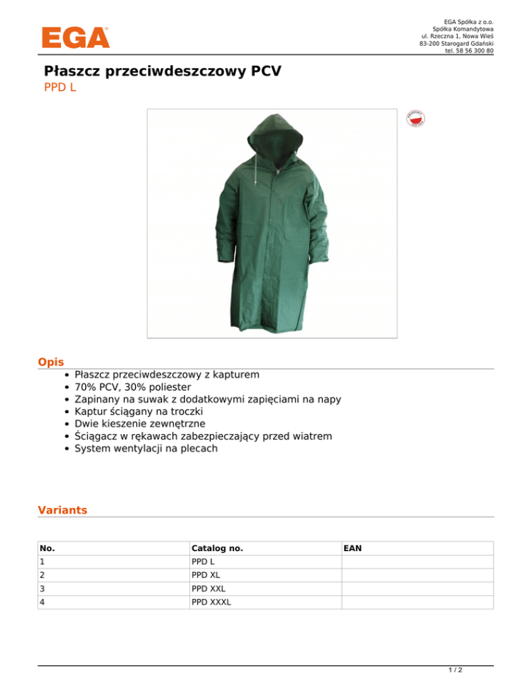 EGA Spółka z o.o. Spółka Komandytowa ul. Rzeczna 1, Nowa Wieś 83-200 Starogard Gdański tel. 58 56 300 80 Płaszcz przeciwdeszczowy PCV PPD L Opis Płaszcz przeciwdeszczowy z kapturem 70% PCV, 30% poliester Zapinany na suwak z dodatkowymi zapięciami na napy Kaptur ściągany na troczki Dwie kieszenie zewnętrzne Ściągacz w rękawach zabezpieczający przed wiatrem System wentylacji na plecach Variants No. Catalog no. 1 PPD L 2 PPD XL 3 PPD XXL 4 PPD XXXL EAN 1/2 EGA Spółka z o.o. Spółka Komandytowa ul. Rzeczna 1, Nowa Wieś 83-200 Starogard Gdański tel. 58 56 300 80 2/2 Powered by TCPDF (www.tcpdf.org)
