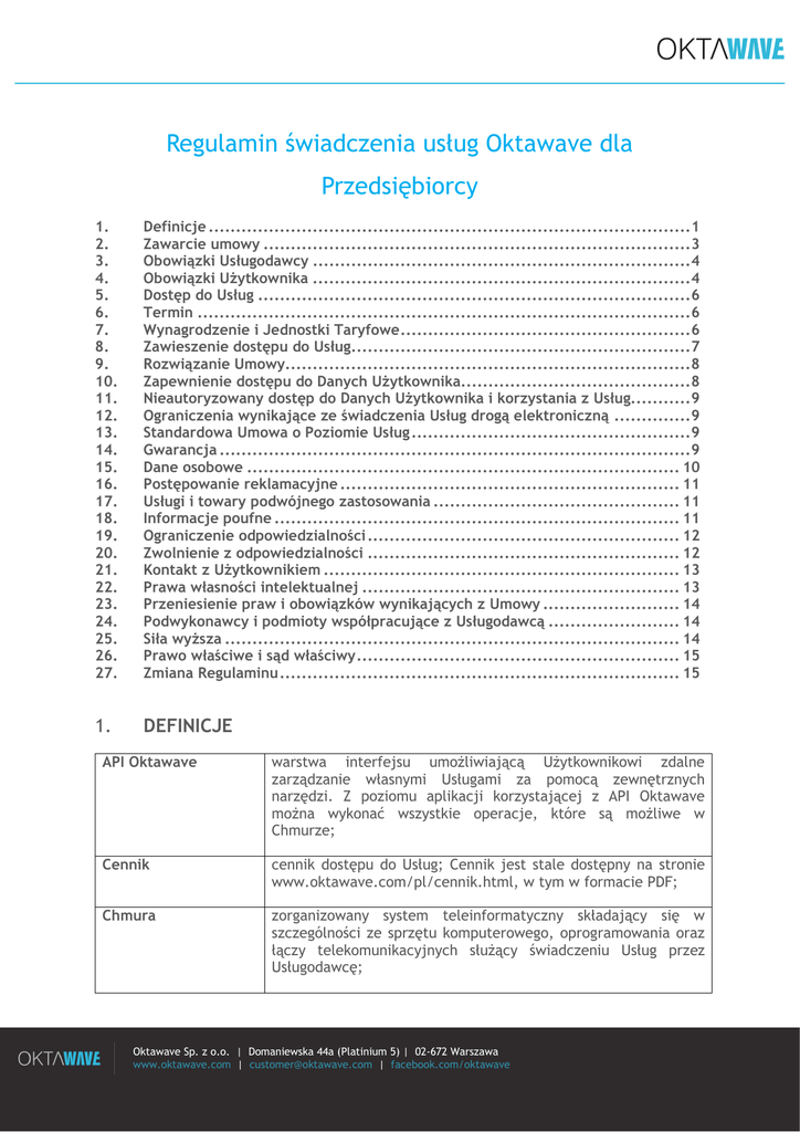 Regulamin świadczenia usług Oktawave dla Przedsiębiorcy 1. 2. 3. 4. 5. 6. 7. 8. 9. 10. 11. 12. 13. 14. 15. 16. 17. 18. 19. 20. 21. 22. 23. 24. 25. 26. 27. Definicje ........................................................................................1 Zawarcie umowy ..............................................................................3 Obowiązki Usługodawcy .....................................................................4 Obowiązki Użytkownika .....................................................................4 Dostęp do Usług ...............................................................................6 Termin ..........................................................................................6 Wynagrodzenie i Jednostki Taryfowe .....................................................6 Zawieszenie dostępu do Usług..............................................................7 Rozwiązanie Umowy..........................................................................8 Zapewnienie dostępu do Danych Użytkownika..........................................8 Nieautoryzowany dostęp do Danych Użytkownika i korzystania z Usług...........9 Ograniczenia wynikające ze świadczenia Usług drogą elektroniczną ..............9 Standardowa Umowa o Poziomie Usług ...................................................9 Gwarancja ......................................................................................9 Dane osobowe ............................................................................... 10 Postępowanie reklamacyjne .............................................................. 11 Usługi i towary podwójnego zastosowania ............................................. 11 Informacje poufne .......................................................................... 11 Ograniczenie odpowiedzialności ......................................................... 12 Zwolnienie z odpowiedzialności ......................................................... 12 Kontakt z Użytkownikiem ................................................................. 13 Prawa własności intelektualnej .......................................................... 13 Przeniesienie praw i obowiązków wynikających z Umowy ......................... 14 Podwykonawcy i podmioty współpracujące z Usługodawcą ........................ 14 Siła wyższa ................................................................................... 14 Prawo właściwe i sąd właściwy ........................................................... 15 Zmiana Regulaminu ......................................................................... 15 1. DEFINICJE API Oktawave warstwa interfejsu umożliwiającą Użytkownikowi zdalne zarządzanie własnymi Usługami za pomocą zewnętrznych narzędzi. Z poziomu aplikacji korzystającej z API Oktawave można wykonać wszystkie operacje, które są możliwe w Chmurze; Cennik cennik dostępu do Usług; Cennik jest stale dostępny na stronie www.oktawave.com/pl/cennik.html, w tym w formacie PDF; Chmura zorganizowany system teleinformatyczny składający się w szczególności ze sprzętu komputerowego, oprogramowania oraz łączy telekomunikacyjnych służący świadczeniu Usług przez Usługodawcę; Oktawave Sp. z o.o. | Domaniewska 44a (Platinium 5) | 02-672 Warszawa www.oktawave.com | [email protected] | facebook.com/oktawave Dane Użytkownika wszelkie dane, w tym dane osobowe, obrazy, dźwięki, tekst, oprogramowanie, które Użytkownik przekazuje za pośrednictwem Usług, a w szczególności przechowuje korzystając z Usług; Konto Użytkownika usługa świadczona drogą elektroniczną Użytkownikowi polegająca na zarządzaniu dostępem do Chmury i korzystaniem z Usług, a także zarządzaniu wykupionymi Jednostkami Taryfowymi; regulamin Konta Użytkownika dostępny jest na stronie http://www.oktawave.com/pl/regulamin.html; Panel Kontrolny graficzny interfejs obsługi Chmury dostępny za pomocą przeglądarki internetowej (zgodnej z wymogami Usługodawcy); Regulamin niniejszy dokument wraz z dokumentami stanowiącymi jego integralną część, określający zasady świadczenia Usług przez Usługodawcę na rzecz Użytkownika; aktualna wersja Regulaminu jest stale dostępna na stronie [www.oktawave.com], w tym w formacie PDF; Standardowa Umowa umowa dotycząca poziomu Usług, o której mowa w punkcie 13. o Poziomie Usług Regulaminu; Standardowa Umowa o Poziomie Usług jest stale dostępna na stronie http://www.oktawave.com/pl/regulamin.html, w tym w formacie PDF; Umowa umowa zawarta pomiędzy Usługodawcą a Użytkownikiem na świadczenie Użytkownikowi możliwości dostępu do Chmury i Usług na zasadach określonych w Regulaminie; Usługa usługi polegające na udostępnieniu Użytkownikowi zasobów Chmury (wirtualne aplikacje, moce obliczeniowe, usługi bazodanowe, wirtualne serwery), wirtualnych dysków i sieci prywatnych (służące do przechowywania, współdzielenia i procesowania danych) zgodnie z warunkami technicznymi określonymi przez Usługodawcę; Usługodawca podmiot świadczący Usługi na podstawie Umowy to jest spółka Oktawave Sp. z o.o. z siedzibą w Warszawie, przy ul. Domaniewskiej 44a; 02-672 Warszawa zarejestrowana w Sądzie Rejonowym dla m.st. Warszawy, XIII Wydział Gospodarczy Krajowego Rejestru Sądowego pod numerem KRS: 0000426334, wysokość kapitału zakładowego: 1 000 000 zł, NIP 5213633306; REGON 146197794; Użytkownik osoba fizyczna, osoba prawna bądź jednostka organizacyjna nieposiadająca osobowości prawnej, będąca przedsiębiorcą, która zawarła Umowę oraz na rzecz której świadczone są Usługi; Jednostki Taryfowe jednostki nabywane w zamian za wynagrodzenie; Oktawave Sp. z o.o. | Domaniewska 44a (Platinium 5) | 02-672 Warszawa www.oktawave.com | [email protected] | facebook.com/oktawave Wynagrodzenie 2. Jednostki Taryfowe wykupione przez Użytkownika przeznaczone na korzystanie z wybranej przez niego Usługi