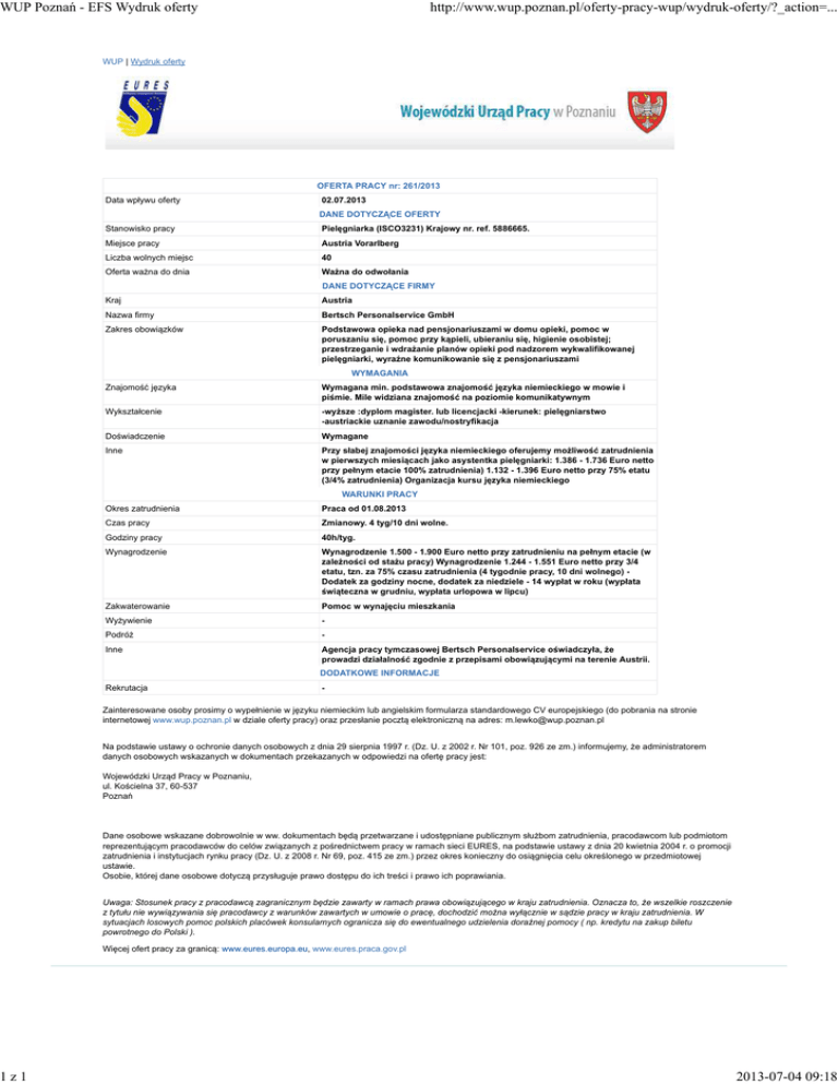 WUP Poznań - EFS Wydruk oferty 1z1 http://www.wup.poznan.pl/oferty-pracy-wup/wydruk-oferty/?_action=... WUP | Wydruk oferty OFERTA PRACY nr: 261/2013 Data wpływu oferty 02.07.2013 DANE DOTYCZĄCE OFERTY Stanowisko pracy Pielęgniarka (ISCO3231) Krajowy nr. ref. 5886665. Miejsce pracy Austria Vorarlberg Liczba wolnych miejsc 40 Oferta ważna do dnia Ważna do odwołania Kraj Austria Nazwa firmy Bertsch Personalservice GmbH Zakres obowiązków Podstawowa opieka nad pensjonariuszami w domu opieki, pomoc w poruszaniu się, pomoc przy kąpieli, ubieraniu się, higienie osobistej; przestrzeganie i wdrażanie planów opieki pod nadzorem wykwalifikowanej pielęgniarki, wyraźne komunikowanie się z pensjonariuszami Znajomość języka Wymagana min. podstawowa znajomość języka niemieckiego w mowie i piśmie. Mile widziana znajomość na poziomie komunikatywnym Wykształcenie -wyższe :dyplom magister. lub licencjacki -kierunek: pielęgniarstwo -austriackie uznanie zawodu/nostryfikacja Doświadczenie Wymagane Inne Przy słabej znajomości języka niemieckiego oferujemy możliwość zatrudnienia w pierwszych miesiącach jako asystentka pielęgniarki: 1.386 - 1.736 Euro netto przy pełnym etacie 100% zatrudnienia) 1.132 - 1.396 Euro netto przy 75% etatu (3/4% zatrudnienia) Organizacja kursu języka niemieckiego Okres zatrudnienia Praca od 01.08.2013 Czas pracy Zmianowy. 4 tyg/10 dni wolne. Godziny pracy 40h/tyg. Wynagrodzenie Wynagrodzenie 1.500 - 1.900 Euro netto przy zatrudnieniu na pełnym etacie (w zależności od stażu pracy) Wynagrodzenie 1.244 - 1.551 Euro netto przy 3/4 etatu, tzn. za 75% czasu zatrudnienia (4 tygodnie pracy, 10 dni wolnego) Dodatek za godziny nocne, dodatek za niedziele - 14 wypłat w roku (wypłata świąteczna w grudniu, wypłata urlopowa w lipcu) Zakwaterowanie Pomoc w wynajęciu mieszkania Wyżywienie - Podróż - Inne Agencja pracy tymczasowej Bertsch Personalservice oświadczyła, że prowadzi działalność zgodnie z przepisami obowiązującymi na terenie Austrii. DANE DOTYCZĄCE FIRMY WYMAGANIA WARUNKI PRACY DODATKOWE INFORMACJE Rekrutacja - Zainteresowane osoby prosimy o wypełnienie w języku niemieckim lub angielskim formularza standardowego CV europejskiego (do pobrania na stronie internetowej www.wup.poznan.pl w dziale oferty pracy) oraz przesłanie pocztą elektroniczną na adres: [email protected] Na podstawie ustawy o ochronie danych osobowych z dnia 29 sierpnia 1997 r. (Dz. U. z 2002 r. Nr 101, poz. 926 ze zm.) informujemy, że administratorem danych osobowych wskazanych w dokumentach przekazanych w odpowiedzi na ofertę pracy jest: Wojewódzki Urząd Pracy w Poznaniu, ul. Kościelna 37, 60-537 Poznań Dane osobowe wskazane dobrowolnie w ww. dokumentach będą przetwarzane i udostępniane publicznym służbom zatrudnienia, pracodawcom lub podmiotom reprezentującym pracodawców do celów związanych z pośrednictwem pracy w ramach sieci EURES, na podstawie ustawy z dnia 20 kwietnia 2004 r. o promocji zatrudnienia i instytucjach rynku pracy (Dz. U. z 2008 r. Nr 69, poz. 415 ze zm.) przez okres konieczny do osiągnięcia celu określonego w przedmiotowej ustawie. Osobie, której dane osobowe dotyczą przysługuje prawo dostępu do ich treści i prawo ich poprawiania. Uwaga: Stosunek pracy z pracodawcą zagranicznym będzie zawarty w ramach prawa obowiązującego w kraju zatrudnienia. Oznacza to, że wszelkie roszczenie z tytułu nie wywiązywania się pracodawcy z warunków zawartych w umowie o pracę, dochodzić można wyłącznie w sądzie pracy w kraju zatrudnienia. W sytuacjach losowych pomoc polskich placówek konsularnych ogranicza się do ewentualnego udzielenia doraźnej pomocy ( np. kredytu na zakup biletu powrotnego do Polski ). Więcej ofert pracy za granicą: www.eures.europa.eu, www.eures.praca.gov.pl 2013-07-04 09:18