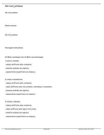 Akt ma³¿eñstwa Akt ma³¿eñstwa Nazwa sprawy: Akt ma³¿eñstwa Wymagane dokumenty: Do ¶lubu cywilnego oraz do ¶lubu wyznaniowego: 1) panna, kawaler: - odpisy skrócone aktu urodzenia, - dowody osobiste (do wgl±du), - zapewnienie (wype³niane na miejscu). 2) osoby rozwiedzione: - odpisy skrócone aktu urodzenia, - odpis skrócony aktu ma³¿eñstwa z adnotacj± o rozwodzie, - dowody osobiste (do wgl±du), - zapewnienie (wype³niane na miejscu). 3) wdowa, wdowiec: - odpisy skrócone aktu urodzenia, - odpis skrócony aktu zgonu ma³¿onka, - dowód osobisty (do wgl±du), - zapewnienie (wype³niane na miejscu). http://www.staryportal.borzecin.pl Kreator PDF Utworzono 7 March, 2017, 06:47 Sposób za³atwienia: Ma³¿eñstwo mo¿e byæ zwarte po up³ywie miesi±ca, kiedy osoby, które maj± je zawrzeæ z³o¿y³y Kierownikowi USC pisemne zapewnienie, ¿e nie wiedz± o istnieniu okoliczno¶ci wy³±czaj±cych zawarcie ma³¿eñstwa. Ma³¿onkowie otrzymuj± odpisy w dniu zawarcia ma³¿eñstwa. Wymagana jest osobista obecno¶æ obojga przysz³ych ma³¿onków. Termin za³atwienia: Akt ma³¿eñstwa sporz±dza siê niezw³ocznie po jego zawarciu. Wydanie za¶wiadczenia do ¶lubu wyznaniowego nastêpuje w dniu z³o¿enia wymaganych dokumentów. Miejsce za³atwienia/ komórka odpowiedzialna: Urz±d Gminy Borzêcin - Pokój nr 11, I piêtro (tel. /014/ 6846371 w. 11) Op³ata skarbowa: - 75 z³ ¶lub cywilny i wyznaniowy, - 5 z³ zapewnienie, - 0,50 z³ od ka¿dego za³±cznika, (znaczki op³aty skarbowej do nabycia w kasie urzêdu) Op³ata administracyjna: http://www.staryportal.borzecin.pl Kreator PDF Utworzono 7 March, 2017, 06:47 Brak Podstawa prawna: - Ustawa z dnia 29 wrze¶nia 1986 roku - Prawo o aktach stanu cywilnego (jednolity tekst Dz.U. z 2004 r. Nr 161, poz. 1688, ) - Ustawa z dnia 9 wrze¶nia 2000 r. - O op³acie skarbowej (tj. Dz.U. z 2004r, Nr 253, poz.2532). Informacje dodatkowe: Akt ma³¿eñstwa zawartego za granic± mo¿na wpisaæ do polskich ksi±g stanu cywilnego po przed³o¿eniu: - orygina³u aktu ma³¿eñstwa, - t³umaczenia orygina³u przez t³umacza przysiêg³ego, - dowodu osobistego (do wgl±du). W celu sporz±dzenia aktu stanu cywilnego za granic± obywatel polski mo¿e otrzymaæ za¶wiadczenie stwierdzaj±ce, ¿e posiada zdolno¶æ prawn± wymagan± wed³ug prawa polskiego do dokonania czynno¶ci stanowi±cej podstawê sporz±dzenia aktu ma³¿eñstwa. Za¶wiadczenie, o którym mowa wydaje Kierownik USC miejsca zamieszkania osoby, która wystêpuje z takim wnioskiem. Dokumentami wymaganymi do jego otrzymania s±: 1. panna, kawaler: - zapewnienie - odpisy skrócone aktu urodzenia, - dowody osobiste (do wgl±du). 2. osoby rozwiedzione: - odpisy skrócone aktu urodzenia, - odpis skrócony aktu ma³¿eñstwa z adnotacj± o rozwodzie albo sentencja rozwodu, - zapewnienie - dowód osobisty (do wgl±du). 3. wdowa, wdowiec: http://www.staryportal.borzecin.pl Kreator PDF Utworzono 7 March, 2017, 06:47 - odpisy skrócone aktu urodzenia, - odpisy skrócone zgonu ma³¿onka, - dowód osobisty (do wgl±du). - zapewnienie Pliki do pobrania: Brak http://www.staryportal.borzecin.pl Kreator PDF Utworzono 7 March, 2017, 06:47