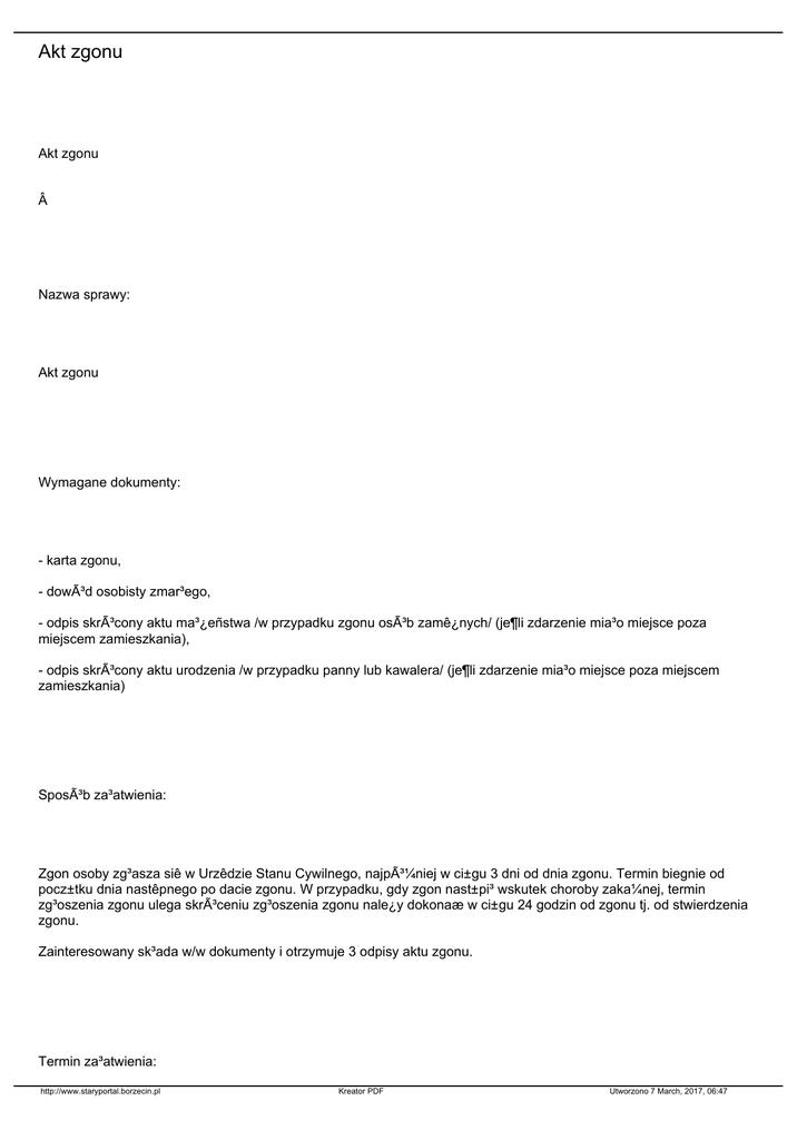 Akt zgonu Akt zgonu  Nazwa sprawy: Akt zgonu Wymagane dokumenty: - karta zgonu, - dowód osobisty zmar³ego, - odpis skrócony aktu ma³¿eñstwa /w przypadku zgonu osób zamê¿nych/ (je¶li zdarzenie mia³o miejsce poza miejscem zamieszkania), - odpis skrócony aktu urodzenia /w przypadku panny lub kawalera/ (je¶li zdarzenie mia³o miejsce poza miejscem zamieszkania) Sposób za³atwienia: Zgon osoby zg³asza siê w Urzêdzie Stanu Cywilnego, najpó¼niej w ci±gu 3 dni od dnia zgonu. Termin biegnie od pocz±tku dnia nastêpnego po dacie zgonu. W przypadku, gdy zgon nast±pi³ wskutek choroby zaka¼nej, termin zg³oszenia zgonu ulega skróceniu zg³oszenia zgonu nale¿y dokonaæ w ci±gu 24 godzin od zgonu tj. od stwierdzenia zgonu. Zainteresowany sk³ada w/w dokumenty i otrzymuje 3 odpisy aktu zgonu. Termin za³atwienia: http://www.staryportal.borzecin.pl Kreator PDF Utworzono 7 March, 2017, 06:47 Niezw³ocznie. Miejsce za³atwienia/ komórka odpowiedzialna: Urz±d Gminy Borzêcin - Pokój nr 11, I piêtro (tel. /014/ 6846371 w. 11) Op³ata skarbowa: Brak Op³ata administracyjna: Brak Podstawa prawna: - Ustawa z dnia 29 wrze¶nia 1986 roku - Prawo o aktach stanu cywilnego ( jednolity tekst Dz.U. z 2004 r. Nr 161, poz. 1688 ) Informacje dodatkowe: http://www.staryportal.borzecin.pl Kreator PDF Utworzono 7 March, 2017, 06:47 Zgon, który nast±pi³ za granic± i nie zosta³ zarejestrowany w zagranicznych ksiêgach stanu cywilnego, mo¿na zarejestrowaæ w polskich ksiêgach stanu cywilnego. Wniosek sk³ada siê w USC miejsca zamieszkania wnioskodawcy. Zgon, który nast±pi³ za granic± i zosta³ zarejestrowany w tamtejszym Urzêdzie Stanu Cywilnego, mo¿e byæ wpisany do polskich ksi±g stanu cywilnego na podstawie: - orygina³u aktu zgonu, - t³umaczenia dokonanego przez t³umacza przysiêg³ego, - podania. Pliki do pobrania: Brak   http://www.staryportal.borzecin.pl Kreator PDF Utworzono 7 March, 2017, 06:47