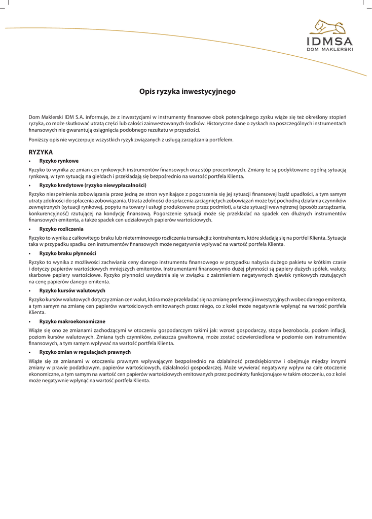 Opis ryzyka inwestycyjnego Dom Maklerski IDM S.A. informuje, że z inwestycjami w instrumenty finansowe obok potencjalnego zysku wiąże się też określony stopień ryzyka, co może skutkować utratą części lub całości zainwestowanych środków. Historyczne dane o zyskach na poszczególnych instrumentach finansowych nie gwarantują osiągnięcia podobnego rezultatu w przyszłości. Poniższy opis nie wyczerpuje wszystkich ryzyk związanych z usługą zarządzania portfelem. RYZYKA • Ryzyko rynkowe Ryzyko to wynika ze zmian cen rynkowych instrumentów finansowych oraz stóp procentowych. Zmiany te są podyktowane ogólną sytuacją rynkową, w tym sytuacją na giełdach i przekładają się bezpośrednio na wartość portfela Klienta. • Ryzyko kredytowe (ryzyko niewypłacalności) Ryzyko niespełnienia zobowiązania przez jedną ze stron wynikające z pogorszenia się jej sytuacji finansowej bądź upadłości, a tym samym utraty zdolności do spłacenia zobowiązania. Utrata zdolności do spłacenia zaciągniętych zobowiązań może być pochodną działania czynników zewnętrznych (sytuacji rynkowej, popytu na towary i usługi produkowane przez podmiot), a także sytuacji wewnętrznej (sposób zarządzania, konkurencyjność) rzutującej na kondycję finansową. Pogorszenie sytuacji może się przekładać na spadek cen dłużnych instrumentów finansowych emitenta, a także spadek cen udziałowych papierów wartościowych. • Ryzyko rozliczenia Ryzyko to wynika z całkowitego braku lub nieterminowego rozliczenia transakcji z kontrahentem, które składają się na portfel Klienta. Sytuacja taka w przypadku spadku cen instrumentów finansowych może negatywnie wpływać na wartość portfela Klienta. • Ryzyko braku płynności Ryzyko to wynika z możliwości zachwiania ceny danego instrumentu finansowego w przypadku nabycia dużego pakietu w krótkim czasie i dotyczy papierów wartościowych mniejszych emitentów. Instrumentami finansowymio dużej płynności są papiery dużych spółek, waluty, skarbowe papiery wartościowe. Ryzyko płynności uwydatnia się w związku z zaistnieniem negatywnych zjawisk rynkowych rzutujących na cenę papierów danego emitenta. • Ryzyko kursów walutowych Ryzyko kursów walutowych dotyczy zmian cen walut, która może przekładać się na zmianę preferencji inwestycyjnych wobec danego emitenta, a tym samym na zmianę cen papierów wartościowych emitowanych przez niego, co z kolei może negatywnie wpłynąć na wartość portfela Klienta. • Ryzyko makroekonomiczne Wiąże się ono ze zmianami zachodzącymi w otoczeniu gospodarczym takimi jak: wzrost gospodarczy, stopa bezrobocia, poziom inflacji, poziom kursów walutowych. Zmiana tych czynników, zwłaszcza gwałtowna, może zostać odzwierciedlona w poziomie cen instrumentów finansowych, a tym samym wpływać na wartość portfela Klienta. • Ryzyko zmian w regulacjach prawnych Wiąże się ze zmianami w otoczeniu prawnym wpływającym bezpośrednio na działalność przedsiębiorstw i obejmuje między innymi zmiany w prawie podatkowym, papierów wartościowych, działalności gospodarczej. Może wywierać negatywny wpływ na całe otoczenie ekonomiczne, a tym samym na wartość cen papierów wartościowych emitowanych przez podmioty funkcjonujące w takim otoczeniu, co z kolei może negatywnie wpłynąć na wartość portfela Klienta. Dom Maklerski IDMSA 31-041 Kraków, Mały Rynek 7 tel. 012 397 06 00 fax 012 397 06 01 e-mail: [email protected] www.idmsa.pl NIP: 676-20-70-700 Regon: 35 1528 670 Sąd Rejonowy dla Krakowa-Śródmieścia w Krakowie XI Wydział Gospodarczy Rejestru Sądowego, KRS 0000004483 Kapitał zakładowy pokryty w całości w wysokości 21.817.685,60 zł w tym do wysokości 18.558.842,80 zł opłacony gotówką, w pozostałej części pokryty aportem. infolinia 0801 900 201 Aktywa zdeponowane w DM IDMSA gwarantuje system rekompensat* *podstawa prawna: Dział V Ustawy z 29 lipca 2005 r. o obrocie istrumentami finansowymi Zarząd: Grzegorz Leszczyński – Prezes Zarządu Rafał Abratański – Wiceprezes Zarządu DM IDMSA wspiera Fundację im. Brata Alberta w Radwanowicach m.in. przekazując 0,50 zł od każdego zrealizowanego zlecenia maklerskiego na GPW, na realizację celów statutowych Fundacji. • Ryzyko niedopuszczenia papierów wartościowych emitenta do obrotu na rynku regulowanym W przypadku papierów wartościowych emitenta nabywanych na rynku pierwotnym lub w pierwszej ofercie publicznej istnieje ryzyko, że nie zostaną spełnione warunki dopuszczenia ich do obrotu na rynku regulowanym, w szczególności notowań giełdowych. W takiej sytuacji płynność dokonanej inwestycji będzie ograniczona i może mieć to niekorzystny wpływ na wycenę tych papierów wartościowych, a także na wartość portfela Klienta. • Ryzyko stóp procentowych Pojawia się, gdy zachodzą zmiany stóp procentowych na rynku, zaś inwestycja charakteryzuje się stałym dochodem. Oznacza to, iż w sytuacji rosnących stóp procentowych na rynku inwestycja o stałym dochodzie staje się mniej atrakcyjna. Odwrotna sytuacja jest przy malejących stopach procentowych. Poziom stóp procentowych determinuje obok ceny kredytów i depozytów także poziom cen giełdowych instrumentów finansowych wpływając w ten sposób na wartość portfela Klienta. • Ryzyko spółki Ryzyko to zawiera w sobie szereg czynników, które mogą wpływać na cenę papierów wartościowych emitowanych przez dany podmiot, a które odzwierciedlają m.in. jej sytuację finansową, perspektywy rozwoju, zyskowność, konkurencyjność w branży, w której działa. Negatywna zmiana tych czynników może wpłynąć na cenę instrumentów finansowych w portfelu Klienta. • Ryzyko wyceny Ryzyko wyceny obejmuje możliwość rozbieżności pomiędzy cena rynkową a wyceną modelową będącą podstawą decyzji inwestycyjnych, co może negatywnie wpłynąć na wartość portfela Klienta. • Ryzyko zwią