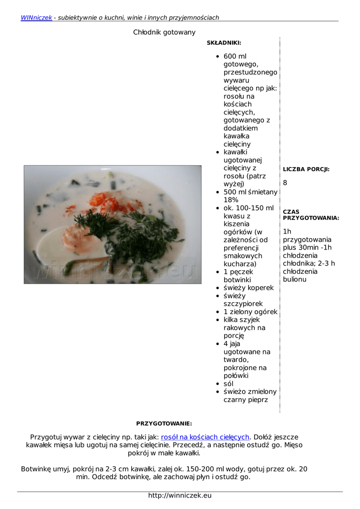 WINniczek - subiektywnie o kuchni, winie i innych przyjemnościach Chłodnik gotowany SKŁADNIKI: 600 ml gotowego, przestudzonego wywaru cielęcego np jak: rosołu na kościach cielęcych, gotowanego z dodatkiem kawałka cielęciny kawałki ugotowanej cielęciny z rosołu (patrz wyżej) 500 ml śmietany 18% ok. 100-150 ml kwasu z kiszenia ogórków (w zależności od preferencji smakowych kucharza) 1 pęczek botwinki świeży koperek świeży szczypiorek 1 zielony ogórek kilka szyjek rakowych na porcję 4 jaja ugotowane na twardo, pokrojone na połówki sól świeżo zmielony czarny pieprz LICZBA PORCJI: 8 CZAS PRZYGOTOWANIA: 1h przygotowania plus 30min -1h chłodzenia chłodnika; 2-3 h chłodzenia bulionu PRZYGOTOWANIE: Przygotuj wywar z cielęciny np. taki jak: rosół na kościach cielęcych. Dołóż jeszcze kawałek mięsa lub ugotuj na samej cielęcinie. Przecedź, a następnie ostudź go. Mięso pokrój w małe kawałki. Botwinkę umyj, pokrój na 2-3 cm kawałki, zalej ok. 150-200 ml wody, gotuj przez ok. 20 min. Odcedź botwinkę, ale zachowaj płyn i ostudź go. http://winniczek.eu WINniczek - subiektywnie o kuchni, winie i innych przyjemnościach Przygotuj pozostałe składniki. Ugotuj jaja na twardo. Posiekaj koperek i szczypiorek. Umyj i pokrój ogórek w półplasterki. Do zimnego rosołu dolej ok. 100 ml płynu otrzymanego z gotowania botwinki, a następnie - kwas z kiszenia ogórków. Dodaj śmietanę. Wszystko dokładnie wymieszaj (gdyby śmietana nie chciała połączyć się z resztą składników, do mieszania można użyć trzepaczki do ubijania białek). Dodaj ogórka i botwinkę. Wstaw do lodówki na 30 min 1h. Do schłodzonego płynu dodaj pozostałe składniki. Marja Ochorowicz-Monatowa, "Uniwersalna książka kucharska, odznaczona na wystawie higienicznej w Warszawie w 1910 r." http://winniczek.eu