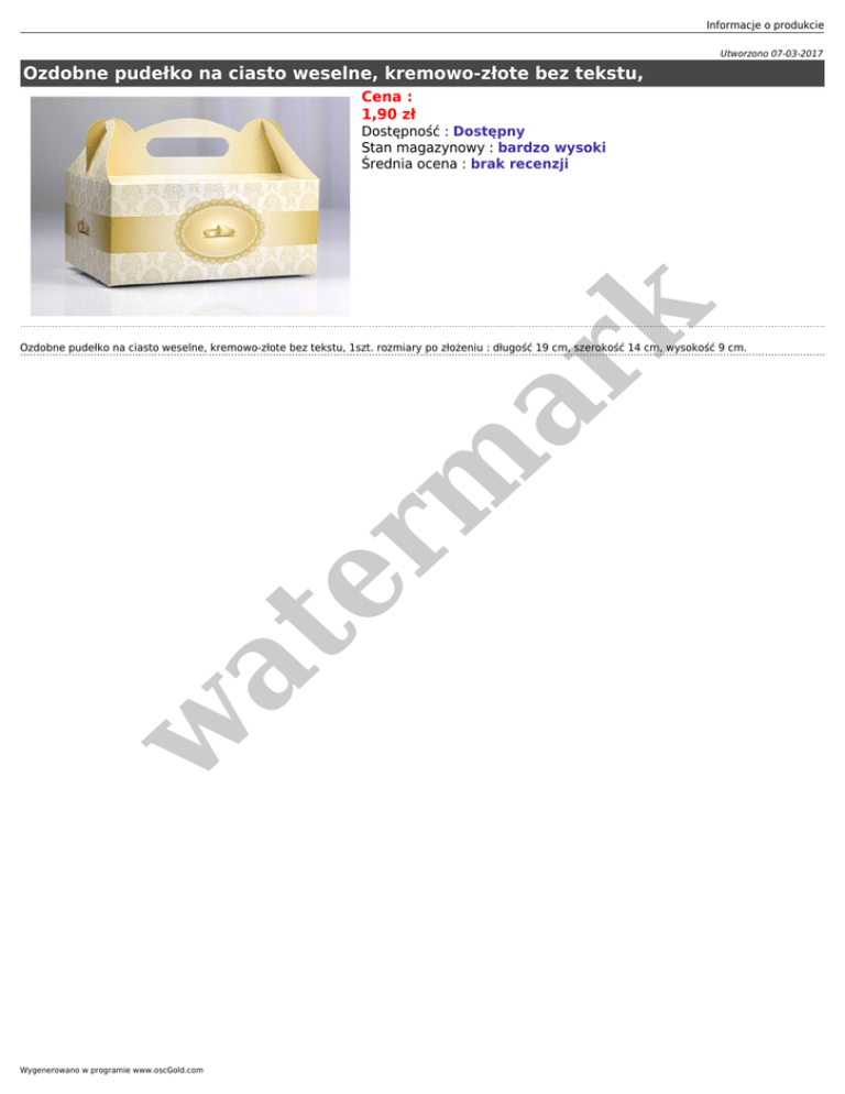 Informacje o produkcie Utworzono 07-03-2017 Ozdobne pudełko na ciasto weselne, kremowo-złote bez tekstu, Cena : 1,90 zł er m ar k Dostępność : Dostępny Stan magazynowy : bardzo wysoki Średnia ocena : brak recenzji w at Ozdobne pudełko na ciasto weselne, kremowo-złote bez tekstu, 1szt. rozmiary po złożeniu : długość 19 cm, szerokość 14 cm, wysokość 9 cm. Wygenerowano w programie www.oscGold.com