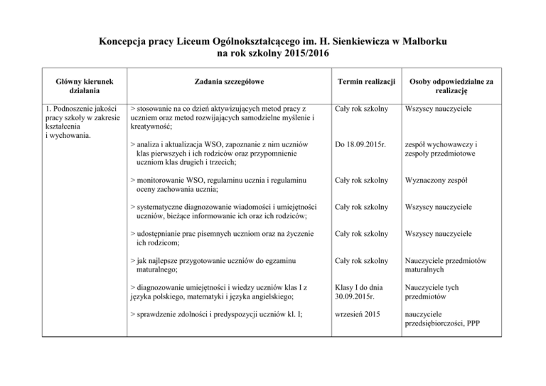 Koncepcja pracy Liceum Ogólnokształcącego im. H. Sienkiewicza w Malborku na rok szkolny 2015/2016 Główny kierunek działania 1. Podnoszenie jakości pracy szkoły w zakresie kształcenia i wychowania. Zadania szczegółowe Termin realizacji Osoby odpowiedzialne za realizację > stosowanie na co dzień aktywizujących metod pracy z uczniem oraz metod rozwijających samodzielne myślenie i kreatywność; Cały rok szkolny Wszyscy nauczyciele > analiza i aktualizacja WSO, zapoznanie z nim uczniów klas pierwszych i ich rodziców oraz przypomnienie uczniom klas drugich i trzecich; Do 18.09.2015r. zespół wychowawczy i zespoły przedmiotowe > monitorowanie WSO, regulaminu ucznia i regulaminu oceny zachowania ucznia; Cały rok szkolny Wyznaczony zespół > systematyczne diagnozowanie wiadomości i umiejętności uczniów, bieżące informowanie ich oraz ich rodziców; Cały rok szkolny Wszyscy nauczyciele > udostępnianie prac pisemnych uczniom oraz na życzenie ich rodzicom; Cały rok szkolny Wszyscy nauczyciele > jak najlepsze przygotowanie uczniów do egzaminu maturalnego; Cały rok szkolny Nauczyciele przedmiotów maturalnych > diagnozowanie umiejętności i wiedzy uczniów klas I z języka polskiego, matematyki i języka angielskiego; Klasy I do dnia 30.09.2015r. Nauczyciele tych przedmiotów > sprawdzenie zdolności i predyspozycji uczniów kl. I; wrzesień 2015 nauczyciele przedsiębiorczości, PPP > wytypowanie uczniów zdolnych i zaproponowanie im zajęć dodatkowych; wrzesień zespoły przedmiotowe > wytypowanie uczniów z trudnościami w nauce i zaproponowanie im zajęć wyrównawczych październik zespoły przedmiotowe > rozpoznanie propozycji uczniów co do tematyki zajęć i uwzględnienie w miarę możliwości w planach pracy wrzesień wszyscy nauczyciele > badanie wyników nauczania z wybranych przedmiotów; II semestr w wybranych klasach > organizowanie zewnętrznych i wewnętrznych form doskonalenia zawodowego nauczycieli; Cały rok szkolny Lider WDN: J. Jasińska > dostosowanie metod nauczania do potrzeb i możliwości psychofizycznych uczniów; Cały rok szkolny Wszyscy nauczyciele > wykorzystywanie w działalności dydaktycznej oraz wychowawczej wniosków z ewaluacji wewnętrznej do dalszej pracy; Cały rok szkolny Wszyscy nauczyciele > opracowanie wniosków przez zespoły przedmiotowe na podstawie wyników matury z 2015r.; Do 30.09.2015r. Zespoły przedmiotowe > innowacyjne metody kształcenia z wykorzystywaniem różnych środków dydaktycznych; Cały rok szkolny Wszyscy nauczyciele > systematyczne stosowanie możliwości jakie daje e-dziennik Cały rok szkolny Dyrekcja i wszyscy nauczyciele I. Łukasiewicz >prowadzenie innowacji pedagogicznej- Ekonomia w praktyce cały rok szkolny >prowadzenie innowacji pedagogicznej na lekcjach języka angielskiego cały rok szkolny J. Jasińska i D. Jasiński 2. Przygotowanie uczniów do egzaminu maturalnego. >prowadzenie szkolnego koła teatralnego cały rok szkolny M. Kubaszewska > bieżące zapoznawanie uczniów z informacjami dotyczącymi matury, jej struktury, przebiegu oraz procedur; Do 25.09.2015r. Dyrektor szkoły Wychowawcy klas III Nauczyciele przedmiotów maturalnych > planowe i terminowe wypełnianie dokumentów maturalnych: - deklaracji wyboru - wyboru tematów z języka polskiego - złożenia wniosków o dostosowanie warunków zdawania egzaminów do możliwości psychofizycznych uczniów wraz z opinią (orzeczeniem) z PPP Do 30.09.2015r. Dyrektor szkoły Wicedyrektor szkoły Wychowawcy klas III > dokładne przestrzeganie procedur egzaminu maturalnego; Maj 2016r. Dyrektor szkoły, zespół ds. matury, przewodniczący ZN oraz PZE > udział nauczycieli w szkoleniach zewnętrznych oraz wewnętrznym dotyczących egzaminu maturalnego; Do kwietnia 2016r. Wszyscy nauczyciele > przeprowadzenie egzaminu maturalnego próbnego; Listopad 2015r. Wyznaczeni nauczyciele > analiza wyników matury próbnej i opracowanie wniosków do dalszej pracy z maturzystami; Styczeń 2016r. Dyrektor szkoły, nauczyciele przedmiotów maturalnych > przeprowadzenie egzaminu maturalnego (matury właściwej); Maj 2016r. Dyrektor szkoły, zespoły nadzorujące oraz przewodniczący PZE 3. Nadzór pedagogiczny oraz dokonanie oceny pracy nauczycieli, którzy nie mają aktualnej oceny. 4. Aktywna praca zespołów przedmiotowych i zadaniowych działających w szkole. 5. Promowanie wizerunku szkoły na terenie miasta, powiatu malborskiego i regionu. > dokonanie oceny pracy nauczycieli; Według Dyrektor szkoły harmonogramu nadzoru pedagogicznego lub na wniosek n – la > systematyczna kontrola pełnienia dyżurów przez nauczycieli w czasie przerw międzylekcyjnych; Cały rok szkolny Dyrektor i wicedyrektor > bieżąca kontrola dokumentacji nauczycieli; Cały rok szkolny Dyrektor i wicedyrektor > kontrola dyscypliny pracy; Cały rok szkolny Dyrektor i wicedyrektor > opracowanie planów pracy zespołów przedmiotowych do 18.09.2015 Przewodniczący zespołów przedmiotowych > praca zespołów według opracowanych planów pracy; Cały rok szkolny Przewodniczący zespołów samokształceniowych > kształcenie nauczycieli i RP w ramach WDN; Harmonogram szkoleń do dnia 10.09.2015r. Cały rok Lider WDN – J. Jasińska > ścisła współpraca nauczycieli na rzecz dobra szkoły i poprawy jej wizerunku > systematyczna współpraca z prasą lokalną; Cały rok Wszyscy nauczyciele, dyrekcja Zespół ds. promocji szkoły > bieżące przekazywanie informacji o sukcesach i życiu szkoły; > prowadzenie kroniki szkolnej; Cały rok Wszyscy nauczyciele Cały rok D. Klofczyńska > modyfikacja strony internetowej szkoły oraz bieżąca aktualizacja zamieszczanych na niej danych; Cały rok D. Mikucki; M. Kubaszewska; A. Tkaczyk; zespół ds. promocji szkoły 6. Opieka pedagogiczna i psychologiczna. > aktualizacja gablot szkolnych (znajdujących się w salach lekcyjnych i na korytarzach); >opracowanie oferty edukacyjnej na 2015/16 Cały rok szkolny Wyznaczeni nauczyciele I sem