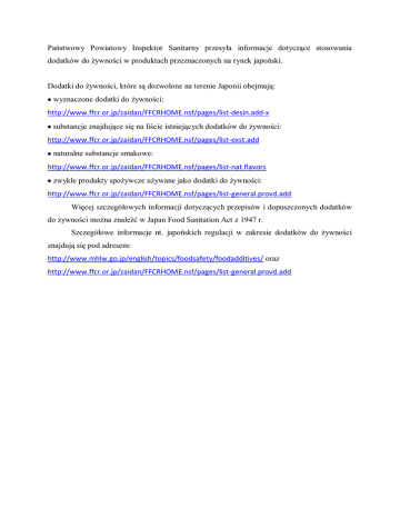 Państwowy Powiatowy Inspektor Sanitarny przesyła informacje dotyczące stosowania dodatków do żywności w produktach przeznaczonych na rynek japoński. Dodatki do żywności, które są dozwolone na terenie Japonii obejmują: wyznaczone dodatki do żywności: http://www.ffcr.or.jp/zaidan/FFCRHOME.nsf/pages/list-desin.add-x substancje znajdujące się na liście istniejących dodatków do żywności: http://www.ffcr.or.jp/zaidan/FFCRHOME.nsf/pages/list-exst.add naturalne substancje smakowe: http://www.ffcr.or.jp/zaidan/FFCRHOME.nsf/pages/list-nat.flavors zwykłe produkty spożywcze używane jako dodatki do żywności: http://www.ffcr.or.jp/zaidan/FFCRHOME.nsf/pages/list-general.provd.add Więcej szczegółowych informacji dotyczących przepisów i dopuszczonych dodatków do żywności można znaleźć w Japan Food Sanitation Act z 1947 r. Szczegółowe informacje nt. japońskich regulacji w zakresie dodatków do żywności znajdują się pod adresem: http://www.mhlw.go.jp/english/topics/foodsafety/foodadditives/ oraz http://www.ffcr.or.jp/zaidan/FFCRHOME.nsf/pages/list-general.provd.add