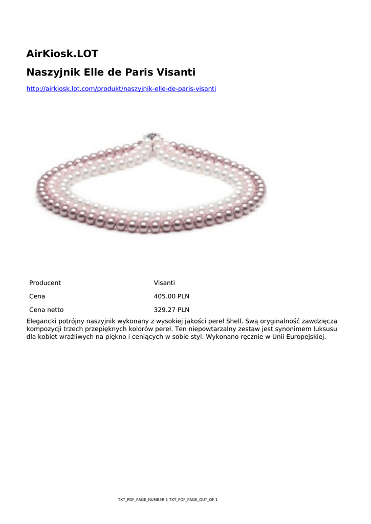 AirKiosk.LOT Naszyjnik Elle de Paris Visanti http://airkiosk.lot.com/produkt/naszyjnik-elle-de-paris-visanti Producent Visanti Cena 405.00 PLN Cena netto 329.27 PLN Elegancki potrójny naszyjnik wykonany z wysokiej jakości pereł Shell. Swą oryginalność zawdzięcza kompozycji trzech przepięknych kolorów pereł. Ten niepowtarzalny zestaw jest synonimem luksusu dla kobiet wrażliwych na piękno i ceniących w sobie styl. Wykonano ręcznie w Unii Europejskiej. TXT_PDF_PAGE_NUMBER 1 TXT_PDF_PAGE_OUT_OF 1