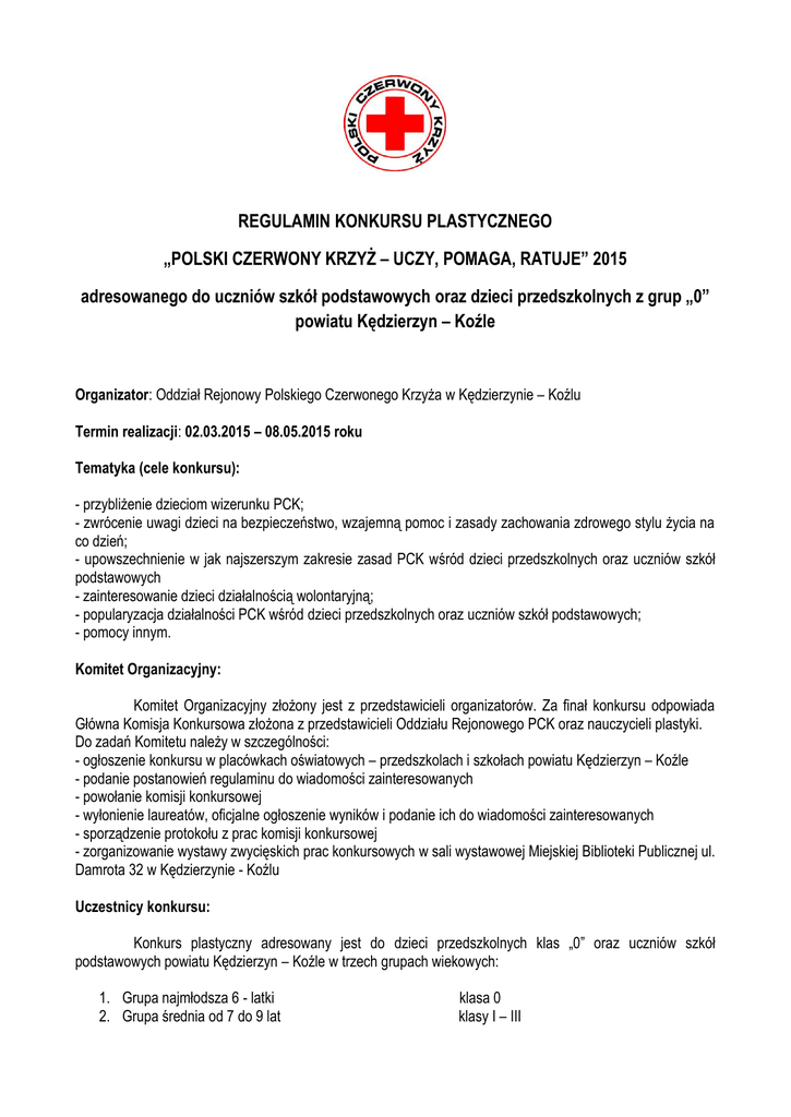 REGULAMIN KONKURSU PLASTYCZNEGO „POLSKI CZERWONY KRZYŻ – UCZY, POMAGA, RATUJE” 2015 adresowanego do uczniów szkół podstawowych oraz dzieci przedszkolnych z grup „0” powiatu Kędzierzyn – Koźle Organizator: Oddział Rejonowy Polskiego Czerwonego Krzyża w Kędzierzynie – Koźlu Termin realizacji: 02.03.2015 – 08.05.2015 roku Tematyka (cele konkursu): - przybliżenie dzieciom wizerunku PCK; - zwrócenie uwagi dzieci na bezpieczeństwo, wzajemną pomoc i zasady zachowania zdrowego stylu życia na co dzień; - upowszechnienie w jak najszerszym zakresie zasad PCK wśród dzieci przedszkolnych oraz uczniów szkół podstawowych - zainteresowanie dzieci działalnością wolontaryjną; - popularyzacja działalności PCK wśród dzieci przedszkolnych oraz uczniów szkół podstawowych; - pomocy innym. Komitet Organizacyjny: Komitet Organizacyjny złożony jest z przedstawicieli organizatorów. Za finał konkursu odpowiada Główna Komisja Konkursowa złożona z przedstawicieli Oddziału Rejonowego PCK oraz nauczycieli plastyki. Do zadań Komitetu należy w szczególności: - ogłoszenie konkursu w placówkach oświatowych – przedszkolach i szkołach powiatu Kędzierzyn – Koźle - podanie postanowień regulaminu do wiadomości zainteresowanych - powołanie komisji konkursowej - wyłonienie laureatów, oficjalne ogłoszenie wyników i podanie ich do wiadomości zainteresowanych - sporządzenie protokołu z prac komisji konkursowej - zorganizowanie wystawy zwycięskich prac konkursowych w sali wystawowej Miejskiej Biblioteki Publicznej ul. Damrota 32 w Kędzierzynie - Koźlu Uczestnicy konkursu: Konkurs plastyczny adresowany jest do dzieci przedszkolnych klas „0” oraz uczniów szkół podstawowych powiatu Kędzierzyn – Koźle w trzech grupach wiekowych: 1. Grupa najmłodsza 6 - latki 2. Grupa średnia od 7 do 9 lat klasa 0 klasy I – III 3. Grupa starsza od 10 do 12 lat klasy IV – VI Technika wykonywania prac: Dopuszczalna technika wykonywania prac konkursowych: rysunek, grafika, malarstwo, wycinanka lub wydzieranka, kolaż Prace powinny być wykonane w formatach A – 4; A – 3 Do wszystkich prac plastycznych powinny być dołączone metryczki z danymi autora pracy: - nazwa szkoły lub przedszkola - adres - imię i nazwisko - klasa - wiek Termin składania prac: Do konkursu każda z biorących w nim udział placówka (przedszkole/szkoła) może nadesłać 10 wcześniej wybranych prac plastycznych. Prace biorące udział w konkursie należy składać w biurze Oddziału Rejonowego Polskiego Czerwonego Krzyża w Kędzierzynie – Koźlu, ul. Mikołaja Reja 2a osobiście bądź za pośrednictwem poczty w nieprzekraczalnym terminie do 15 maja 2015 roku Prace nadesłane po podanym terminie nie będą brały udziału w konkursie. Nagrody i wyróżnienia: Organizator konkursu przewidział dla zwycięzców i uczestników Konkursu wszystkich grup wiekowych nagrody i wyróżnienia. Popularyzacja konkursu: Organizatorzy nie przewidują zwrotu prac konkursowych. Wybrane przez komisję konkursową prace plastyczne eksponowane będą w sali wystawowej Miejskiej Biblioteki Publicznej ul. Damrota 32 w Kędzierzynie – Koźlu