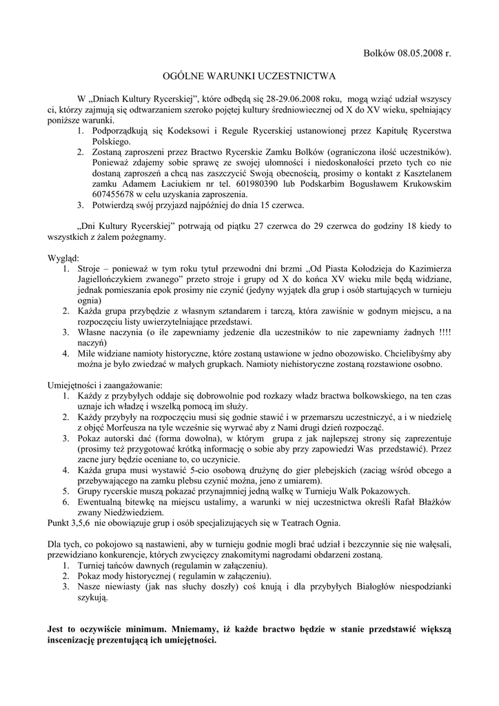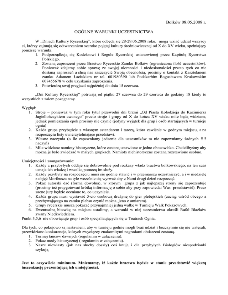 Bolków 08.05.2008 r. OGÓLNE WARUNKI UCZESTNICTWA W „Dniach Kultury Rycerskiej”, które odbędą się 28-29.06.2008 roku, mogą wziąć udział wszyscy ci, którzy zajmują się odtwarzaniem szeroko pojętej kultury średniowiecznej od X do XV wieku, spełniający poniŜsze warunki. 1. Podporządkują się Kodeksowi i Regule Rycerskiej ustanowionej przez Kapitułę Rycerstwa Polskiego. 2. Zostaną zaproszeni przez Bractwo Rycerskie Zamku Bolków (ograniczona ilość uczestników). PoniewaŜ zdajemy sobie sprawę ze swojej ułomności i niedoskonałości przeto tych co nie dostaną zaproszeń a chcą nas zaszczycić Swoją obecnością, prosimy o kontakt z Kasztelanem zamku Adamem Łaciukiem nr tel. 601980390 lub Podskarbim Bogusławem Krukowskim 607455678 w celu uzyskania zaproszenia. 3. Potwierdzą swój przyjazd najpóźniej do dnia 15 czerwca. „Dni Kultury Rycerskiej” potrwają od piątku 27 czerwca do 29 czerwca do godziny 18 kiedy to wszystkich z Ŝalem poŜegnamy. Wygląd: 1. Stroje – poniewaŜ w tym roku tytuł przewodni dni brzmi „Od Piasta Kołodzieja do Kazimierza Jagiellończykiem zwanego” przeto stroje i grupy od X do końca XV wieku mile będą widziane, jednak pomieszania epok prosimy nie czynić (jedyny wyjątek dla grup i osób startujących w turnieju ognia) 2. KaŜda grupa przybędzie z własnym sztandarem i tarczą, która zawiśnie w godnym miejscu, a na rozpoczęciu listy uwierzytelniające przedstawi. 3. Własne naczynia (o ile zapewniamy jedzenie dla uczestników to nie zapewniamy Ŝadnych !!!! naczyń) 4. Mile widziane namioty historyczne, które zostaną ustawione w jedno obozowisko. Chcielibyśmy aby moŜna je było zwiedzać w małych grupkach. Namioty niehistoryczne zostaną rozstawione osobno. Umiejętności i zaangaŜowanie: 1. KaŜdy z przybyłych oddaje się dobrowolnie pod rozkazy władz bractwa bolkowskiego, na ten czas uznaje ich władzę i wszelką pomocą im słuŜy. 2. KaŜdy przybyły na rozpoczęciu musi się godnie stawić i w przemarszu uczestniczyć, a i w niedzielę z objęć Morfeusza na tyle wcześnie się wyrwać aby z Nami drugi dzień rozpocząć. 3. Pokaz autorski dać (forma dowolna), w którym grupa z jak najlepszej strony się zaprezentuje (prosimy teŜ przygotować krótką informację o sobie aby przy zapowiedzi Was przedstawić). Przez zacne jury będzie oceniane to, co uczynicie. 4. KaŜda grupa musi wystawić 5-cio osobową druŜynę do gier plebejskich (zaciąg wśród obcego a przebywającego na zamku plebsu czynić moŜna, jeno z umiarem). 5. Grupy rycerskie muszą pokazać przynajmniej jedną walkę w Turnieju Walk Pokazowych. 6. Ewentualną bitewkę na miejscu ustalimy, a warunki w niej uczestnictwa określi Rafał BłaŜków zwany Niedźwiedziem. Punkt 3,5,6 nie obowiązuje grup i osób specjalizujących się w Teatrach Ognia. Dla tych, co pokojowo są nastawieni, aby w turnieju godnie mogli brać udział i bezczynnie się nie wałęsali, przewidziano konkurencje, których zwycięzcy znakomitymi nagrodami obdarzeni zostaną. 1. Turniej tańców dawnych (regulamin w załączeniu). 2. Pokaz mody historycznej ( regulamin w załączeniu). 3. Nasze niewiasty (jak nas słuchy doszły) coś knują i dla przybyłych Białogłów niespodzianki szykują. Jest to oczywiście minimum. Mniemamy, iŜ kaŜde bractwo będzie w stanie przedstawić większą inscenizację prezentującą ich umiejętności.