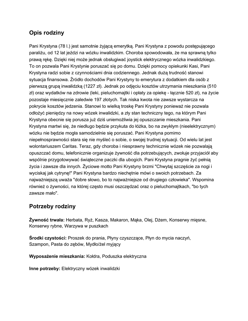 Opis rodziny Pani Krystyna (78 l.) jest samotnie żyjącą emerytką. Pani Krystyna z powodu postępującego paraliżu, od 12 lat jeździ na wózku inwalidzkim. Choroba spowodowała, że ma sprawną tylko prawą rękę. Dzięki niej może jednak obsługiwać joystick elektrycznego wózka inwalidzkiego. To on pozwala Pani Krystynie poruszać się po domu. Dzięki pomocy opiekunki Kasi, Pani Krystyna radzi sobie z czynnościami dnia codziennego. Jednak dużą trudność stanowi sytuacja finansowa. Źródło dochodów Pani Krystyny to emerytura z dodatkiem dla osób z pierwszą grupą inwalidzką (1227 zł). Jednak po odjęciu kosztów utrzymania mieszkania (510 zł) oraz wydatków na zdrowie (leki, pieluchomajtki i opłaty za opiekę łącznie 520 zł), na życie pozostaje miesięcznie zaledwie 197 złotych. Tak niska kwota nie zawsze wystarcza na pokrycie kosztów jedzenia. Stanowi to wielką troskę Pani Krystyny ponieważ nie pozwala odłożyć pieniędzy na nowy wózek inwalidzki, a zły stan techniczny tego, na którym Pani Krystyna obecnie się porusza już dziś uniemożliwia jej opuszczanie mieszkania. Pani Krystyna martwi się, że niedługo będzie przykuta do łóżka, bo na zwykłym (nieelektrycznym) wózku nie będzie mogła samodzielnie się poruszać. Pani Krystyna pomimo niepełnosprawności stara się nie myśleć o sobie, o swojej trudnej sytuacji. Od wielu lat jest wolontariuszem Caritas. Teraz, gdy choroba i niesprawny technicznie wózek nie pozwalają opuszczać domu, telefonicznie organizuje żywność dla potrzebujących, zwołuje przyjaciół aby wspólnie przygotowywać świąteczne paczki dla ubogich. Pani Krystyna pragnie żyć pełnią życia i zawsze dla innych. Życiowe motto Pani Krystyny brzmi "Chwytaj szczęście za nogi i wyciskaj jak cytrynę!" Pani Krystyna bardzo niechętnie mówi o swoich potrzebach. Za najważniejszą uważa "dobre słowo, bo to najważniejsze od drugiego człowieka". Wspomina również o żywności, na której często musi oszczędzać oraz o pieluchomajtkach, "bo tych zawsze mało". Potrzeby rodziny Żywność trwała: Herbata, Ryż, Kasza, Makaron, Mąka, Olej, Dżem, Konserwy mięsne, Konserwy rybne, Warzywa w puszkach Środki czystości: Proszek do prania, Płyny czyszczące, Płyn do mycia naczyń, Szampon, Pasta do zębów, Mydło/żel myjący Wyposażenie mieszkania: Kołdra, Poduszka elektryczna Inne potrzeby: Elektryczny wózek inwalidzki