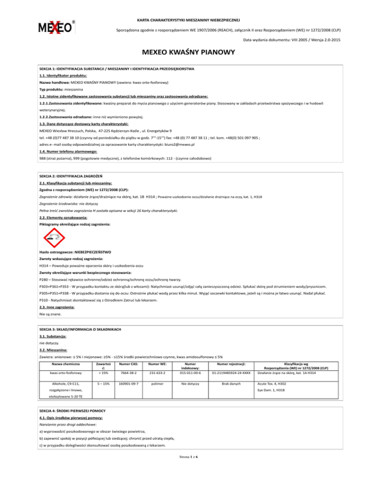 KARTA CHARAKTERYSTYKI MIESZANINY NIEBEZPIECZNEJ Sporządzona zgodnie z rozporządzeniem WE 1907/2006 (REACH), załącznik II oraz Rozporządzeniem (WE) nr 1272/2008 (CLP) Data wydania dokumentu: VIII 2005 / Wersja 2.0-2015 MEXEO KWAŚNY PIANOWY SEKCJA 1: IDENTYFIKACJA SUBSTANCJI / MIESZANINY I IDENTYFIKACJA PRZEDSIĘBIORSTWA 1.1. Identyfikator produktu: Nazwa handlowa: MEXEO KWAŚNY PIANOWY (zawiera: kwas orto-fosforowy) Typ produktu: mieszanina 1.2. Istotne zidentyfikowane zastosowania substancji lub mieszaniny oraz zastosowania odradzane: 1.2.1.Zastosowania zidentyfikowane: kwaśny preparat do mycia pianowego z użyciem generatorów piany. Stosowany w zakładach przetwórstwa spożywczego i w hodowli weterynaryjnej. 1.2.2.Zastosowania odradzane: inne niż wymieniono powyżej. 1.3. Dane dotyczące dostawcy karty charakterystyki: MEXEO Wiesław Hreczuch, Polska, 47-225 Kędzierzyn-Koźle , ul. Energetyków 9 tel. +48 (0)77 487 38 10 (czynny od poniedziałku do piątku w godz. 7°°-15°°) fax: +48 (0) 77 487 38 11 ; tel. kom. +48(0) 501 097 905 ; adres e- mail osoby odpowiedzialnej za opracowanie karty charakterystyki: [email protected] 1.4. Numer telefonu alarmowego: 988 (straż pożarna), 999 (pogotowie medyczne), z telefonów komórkowych: 112 - (czynne całodobowo) SEKCJA 2: IDENTYFIKACJA ZAGROŻEŃ 2.1. Klasyfikacja substancji lub mieszaniny: Zgodna z rozporządzeniem (WE) nr 1272/2008 (CLP): Zagrożenie zdrowia: działanie żrące/drażniące na skórę, kat. 1B H314 ; Poważne uszkodzenie oczu/działanie drażniące na oczy, kat. 1, H318 Zagrożenie środowiska: nie dotyczy Pełna treść zwrotów zagrożenia H została opisana w sekcji 16 karty charakterystyki. 2.2. Elementy oznakowania: Piktogramy określające rodzaj zagrożenia: Hasło ostrzegawcze: NIEBEZPIECZEŃSTWO Zwroty wskazujące rodzaj zagrożenia: H314 – Powoduje poważne oparzenia skóry i uszkodzenia oczu Zwroty określające warunki bezpiecznego stosowania: P280 – Stosować rękawice ochronne/odzież ochronną/ochronę oczu/ochronę twarzy. P303+P361+P353 - W przypadku kontaktu ze skórą(lub z włosami): Natychmiast usunąć/zdjąć całą zanieczyszczoną odzież. Spłukać skórę pod strumieniem wody/prysznicem. P305+P351+P338 - W przypadku dostania się do oczu: Ostrożnie płukać wodą przez kilka minut. Wyjąć soczewki kontaktowe, jeżeli są i można je łatwo usunąć. Nadal płukać. P310 - Natychmiast skontaktować się z Ośrodkiem Zatruć lub lekarzem. 2.3. Inne zagrożenia: Nie są znane. SEKCJA 3: SKŁAD/INFORMACJA O SKŁADNIKACH 3.1. Substancja: nie dotyczy. 3.2. Mieszanina: Zawiera: anionowe: ≤ 5% i niejonowe: ≥5% - ≤15% środki powierzchniowo czynne, kwas amidosulfonowy ≤ 5% Nazwa chemiczna Numer CAS: Numer WE: kwas orto-fosforowy Zawartoś ć: > 15% 231-633-2 Numer indeksowy: 015-011-00-6 7664-38-2 01-2119485924-24-XXXX Alkohole, C9-C11, 5 – 15% 160901-09-7 polimer Nie dotyczy Brak danych rozgałęzione i linowe, Numer rejestracji: Klasyfikacja wg Rozporządzenia (WE) nr 1272/2008 (CLP) Działanie żrące na skórę, kat. 1A H314 Acute Tox. 4, H302 Eye Dam. 1, H318 etoksylowane 5-20 TE SEKCJA 4: ŚRODKI PIERWSZEJ POMOCY 4.1. Opis środków pierwszej pomocy: Narażenie przez drogi oddechowe: a) wyprowadzić poszkodowanego w obszar świeżego powietrza, b) zapewnić spokój w pozycji półleżącej lub siedzącej; chronić przed utratą ciepła, c) w przypadku dolegliwości skonsultować osobę poszkodowaną z lekarzem. Strona 1 z 6 KARTA CHARAKTERYSTYKI MIESZANINY NIEBEZPIECZNEJ Sporządzona zgodnie z rozporządzeniem WE 1907/2006 (REACH), załącznik II oraz Rozporządzeniem (WE) nr 1272/2008 (CLP) Data wydania dokumentu: VIII 2005 / Wersja 2.0-2015 MEXEO KWAŚNY PIANOWY Narażenie przez kontakt ze skórą: a) natychmiast zdjąć zanieczyszczoną odzież, b) niezwłocznie rozpocząć przemywanie skóry pod strumieniem bieżącej wody dokładnie oczyszczając wszelkie zagłębienia i fałdy skóry, c) zapewnić pomoc lekarską w przypadku dolegliwości. Narażenie oczu: a) natychmiast rozpocząć przemywanie oczu pod strumieniem bieżącej chłodnej wody, odwodząc dolne i górne powieki, b) czynność wykonywać przez co najmniej 15 minut, chroniąc zdrowe oko przed narażeniem na kontakt z produktem, c) usunąć szkła kontaktowe (jeśli są noszone) i kontynuować płukanie. c) należy skontaktować się z lekarzem Narażenie przez przewód pokarmowy: a) wypłukać jamę ustną wodą (tylko w przypadku gdy poszkodowany jest przytomny), b) nie podawać nic doustnie. Nie podawać środków zobojętniających, c) nie wywoływać wymiotów, d) niezwłocznie zapewnić pomoc medyczną. Uwaga: podczas udzielania pierwszej pomocy należy wszelkie płyny ustrojowe traktować jako potencjalne źródło zarażenia. Pamiętać o zapewnieniu sobie bezpieczeństwa. 4.2. Najważniejsze ostre i opóźnione objawy oraz skutki narażenia: Oczy: oparzenia o różnym nasileniu, zniszczenie i odwarstwienie tkanki nabłonkowej spojówki i rogówki, obrzęk i powstanie wrzodów w zależności od intensywności oddziaływania. Niebezpieczeństwo utraty wzroku. Skóra: podrażnienia i uszkodzenia oraz oparzenia. 4.3. Wskazania dotyczące wszelkiej natychmiastowej pomocy lekarskiej i szczególnego postępowania z poszkodowanym: Każde narażenie wywołujące jakiekolwiek dolegliwości należy skonsultować z lekarzem. Podczas zagrożenia życia lub zdrowia niezwłocznie wykonać resuscytację krążeniowooddechową oraz wezwać pogotowie ratunkowe. Jeżeli poszkodowany jest nieprzytomny, upewnić się czy drogi oddechowe są drożne i ułożyć go w pozycji bocznej ustalonej. Należy upewnić się, że personel medyczny wie z jakim materiałem ma do czynienia i podjął kroki w celu zapewnienia sobie bezpieczeństwa. SEKCJA 5: POSTĘPOWANIE W PRZYPADKU POŻARU 5.1. Środki gaśnicze: Odpowiednie środki gaśnicze: środki gaśnicze odpowiednie do palących się materiałów. Niewłaściwe środki gaśni